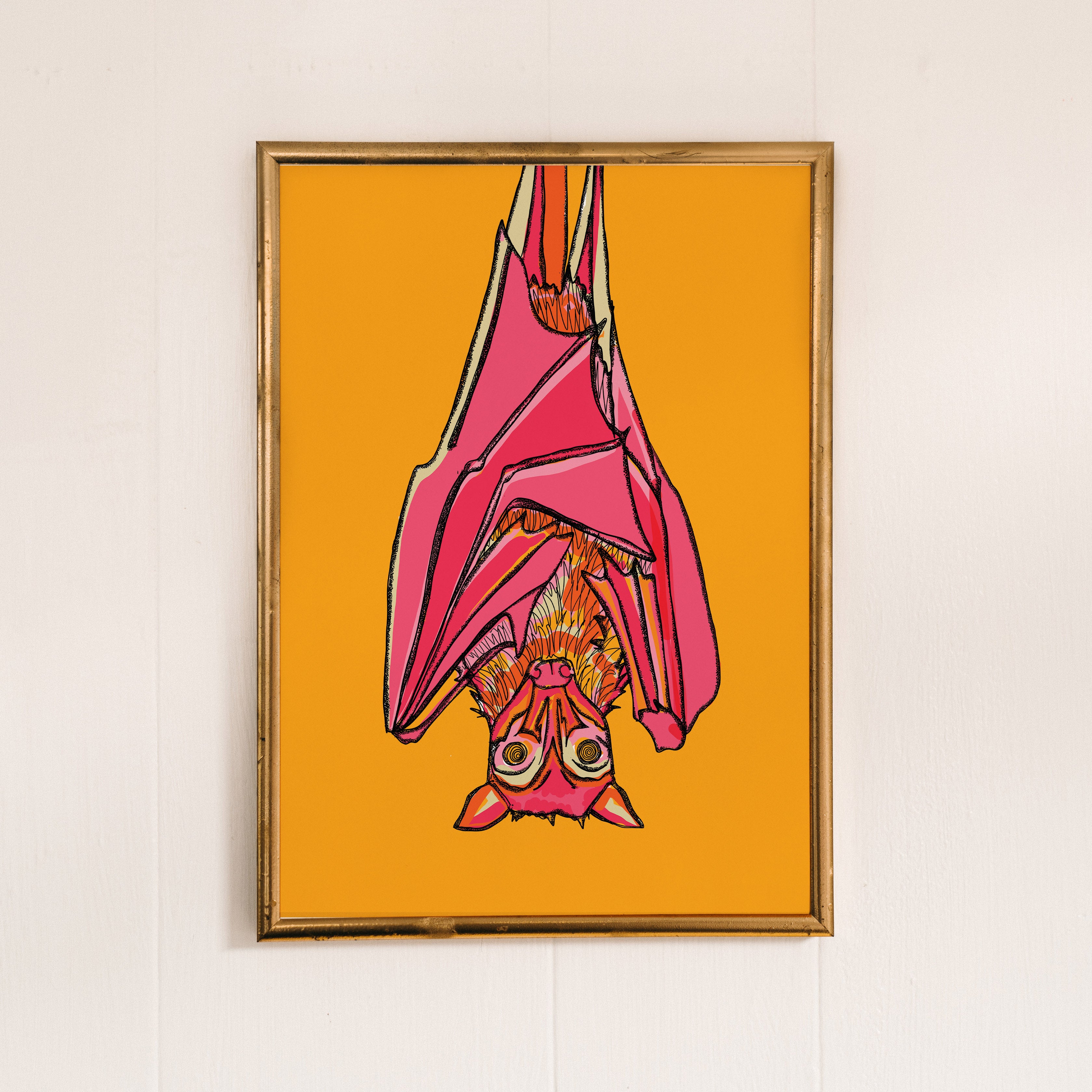 A vibrant art print of a hanging bat illustrated in vibrant pinks and yellows.