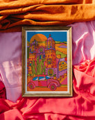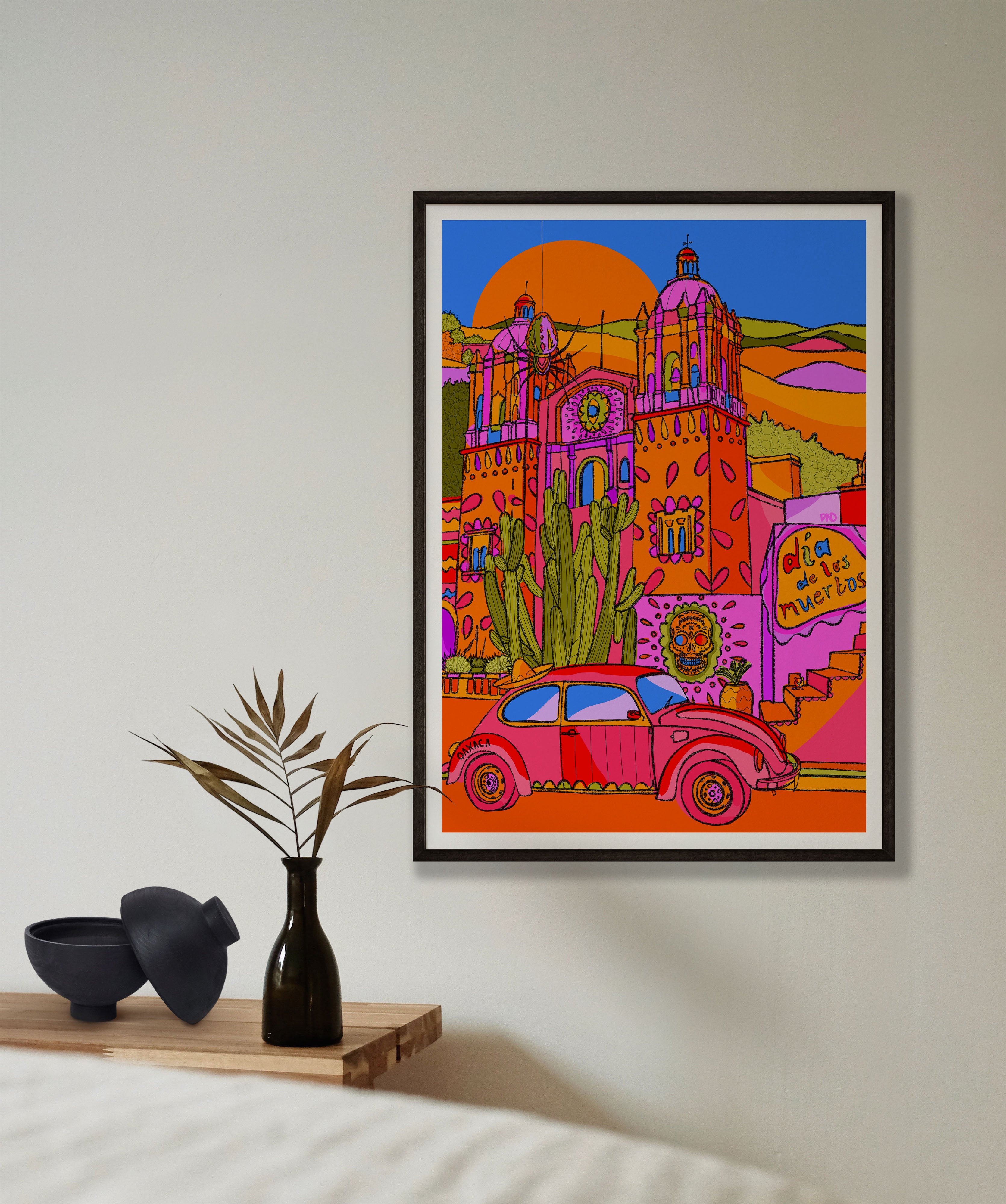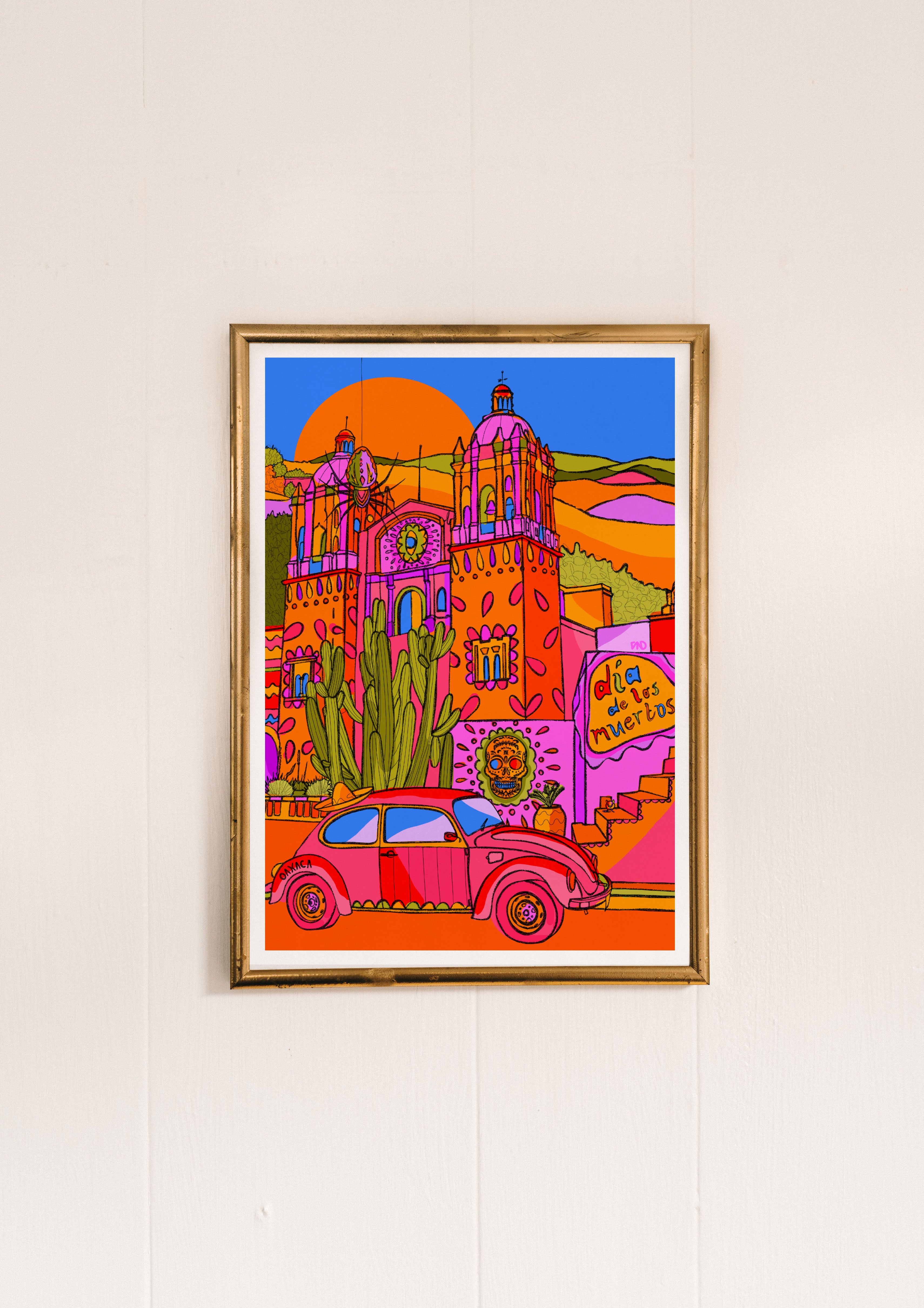 A vibrant art print of Oaxaca in Mexico illustrated in bright pinks, yellows, purples, and oranges.