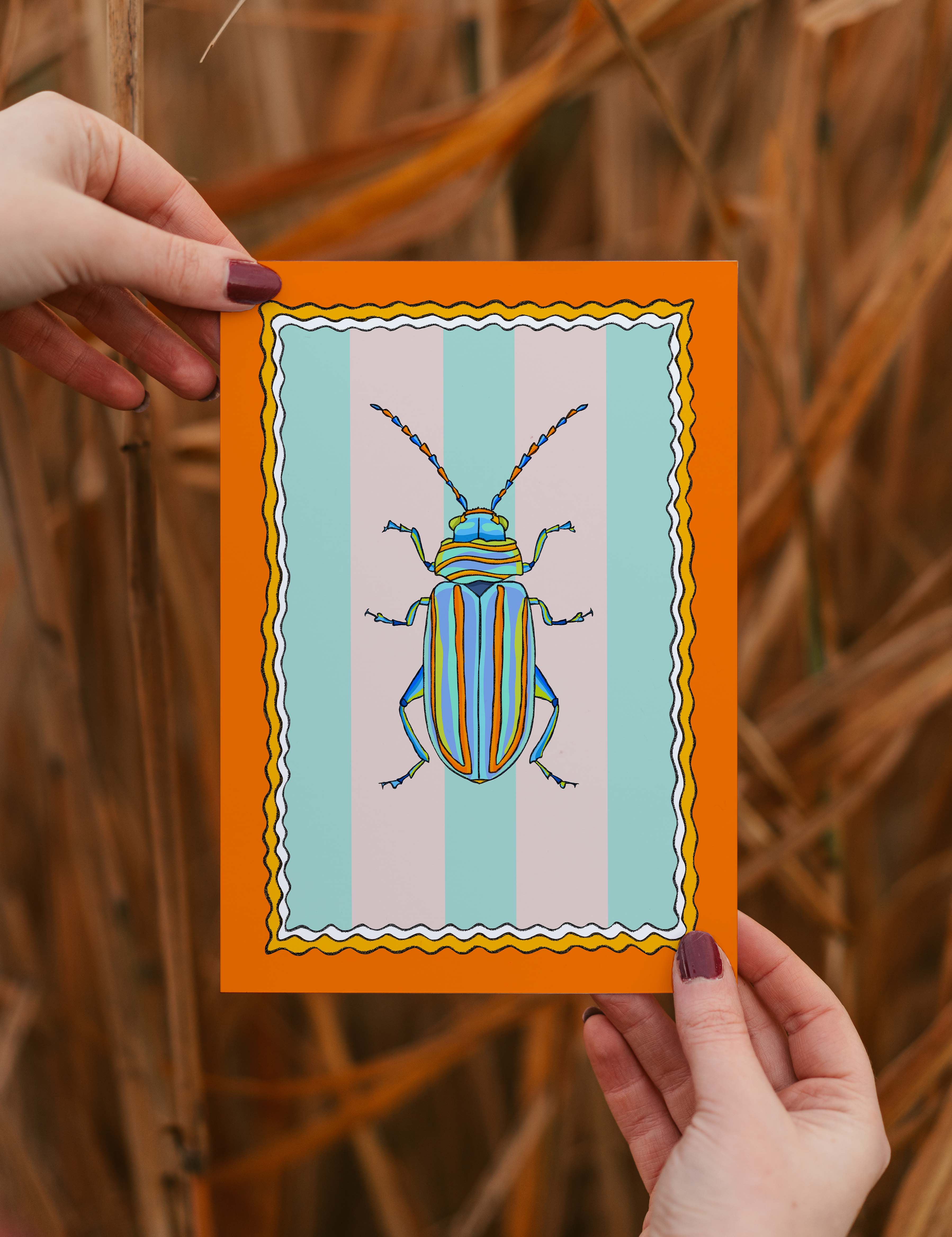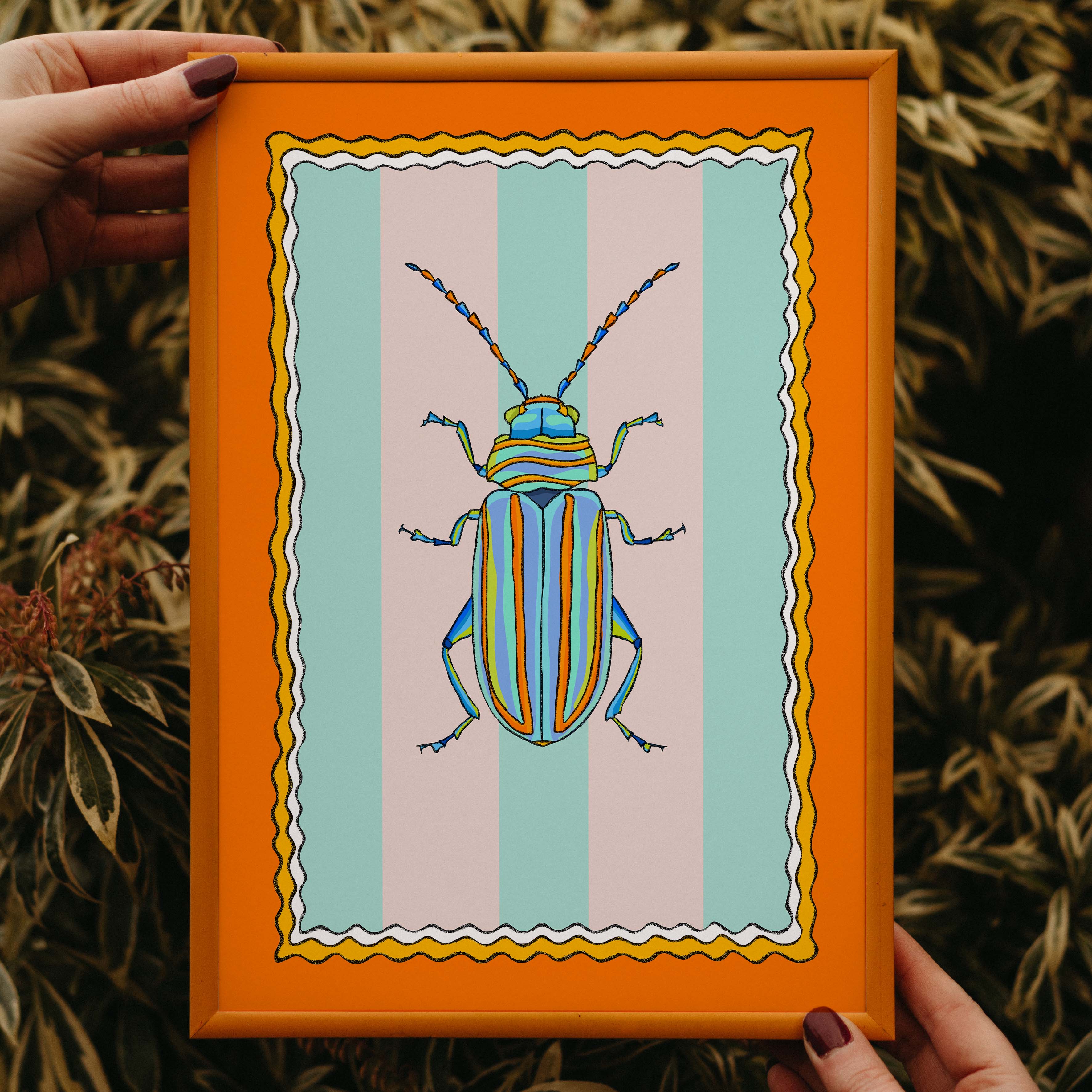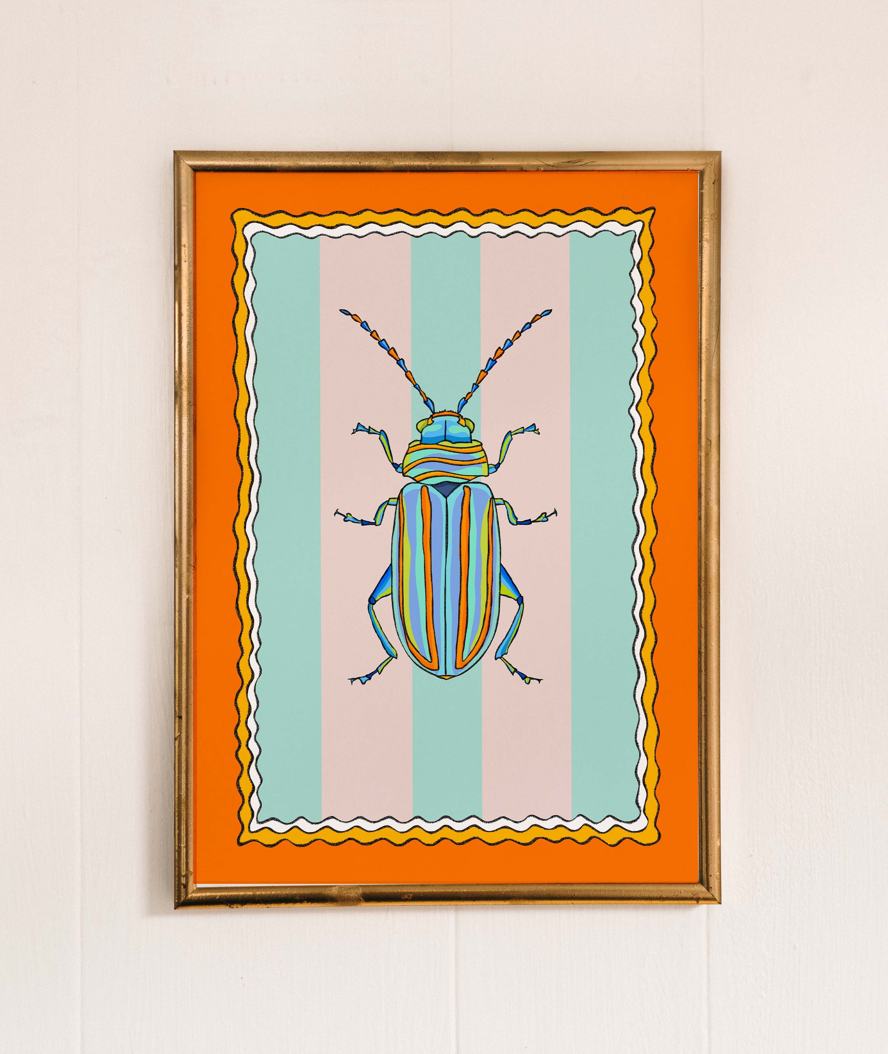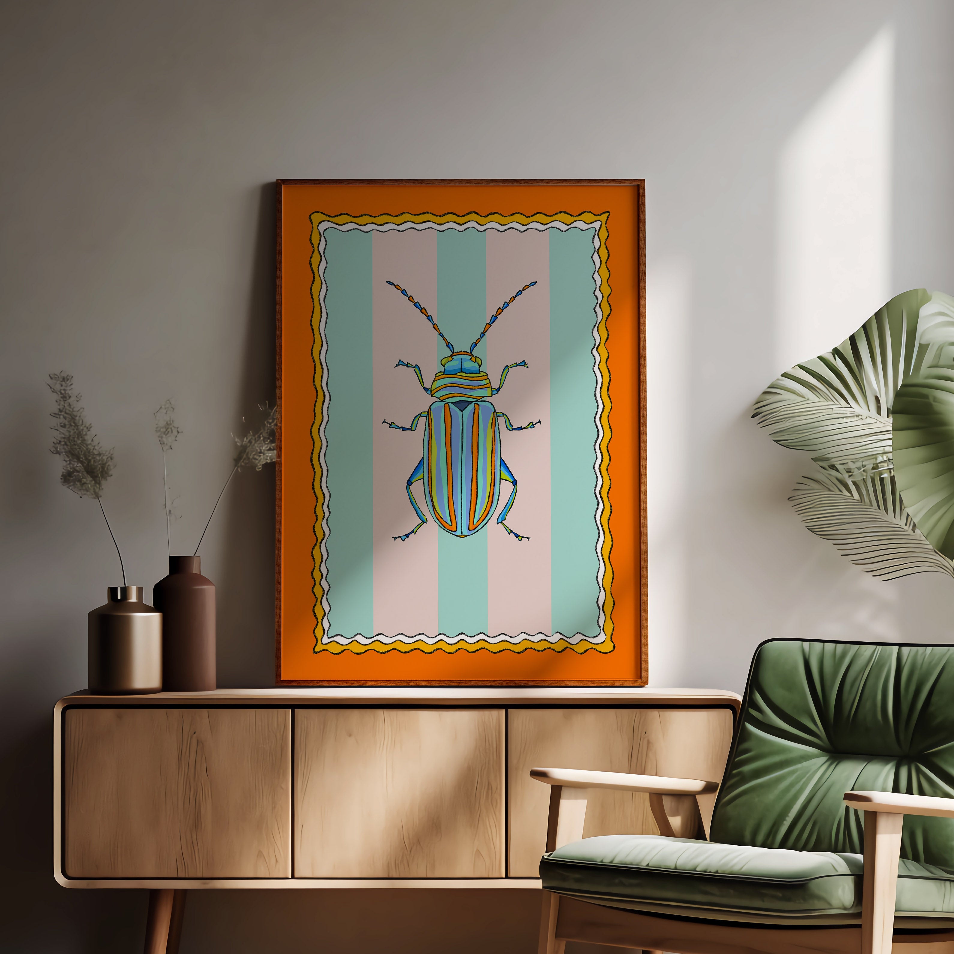 A stylish art print of a beautiful beetle in turquoise, orange, and beige. This statement print would make a great addition to a gallery wall or bedroom.