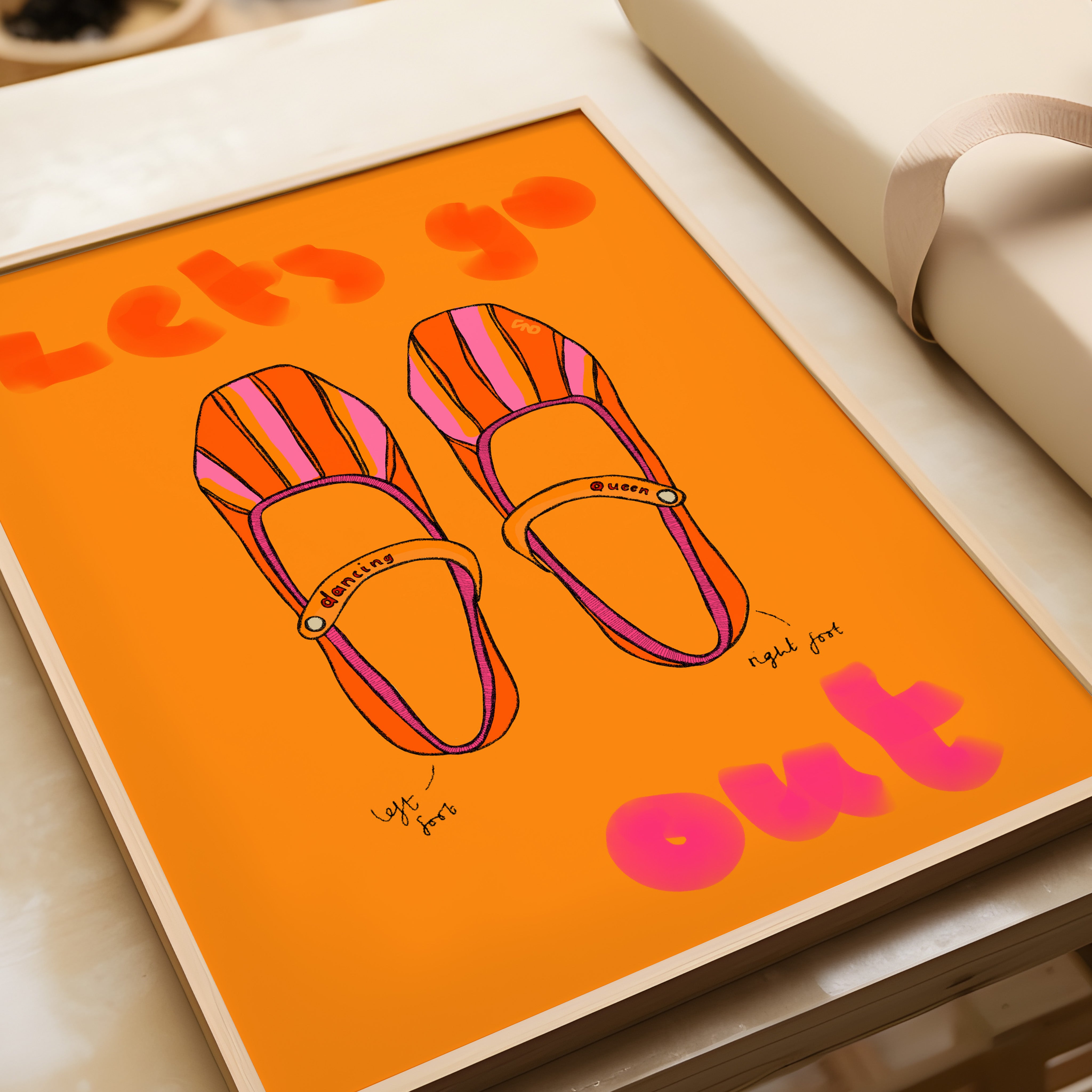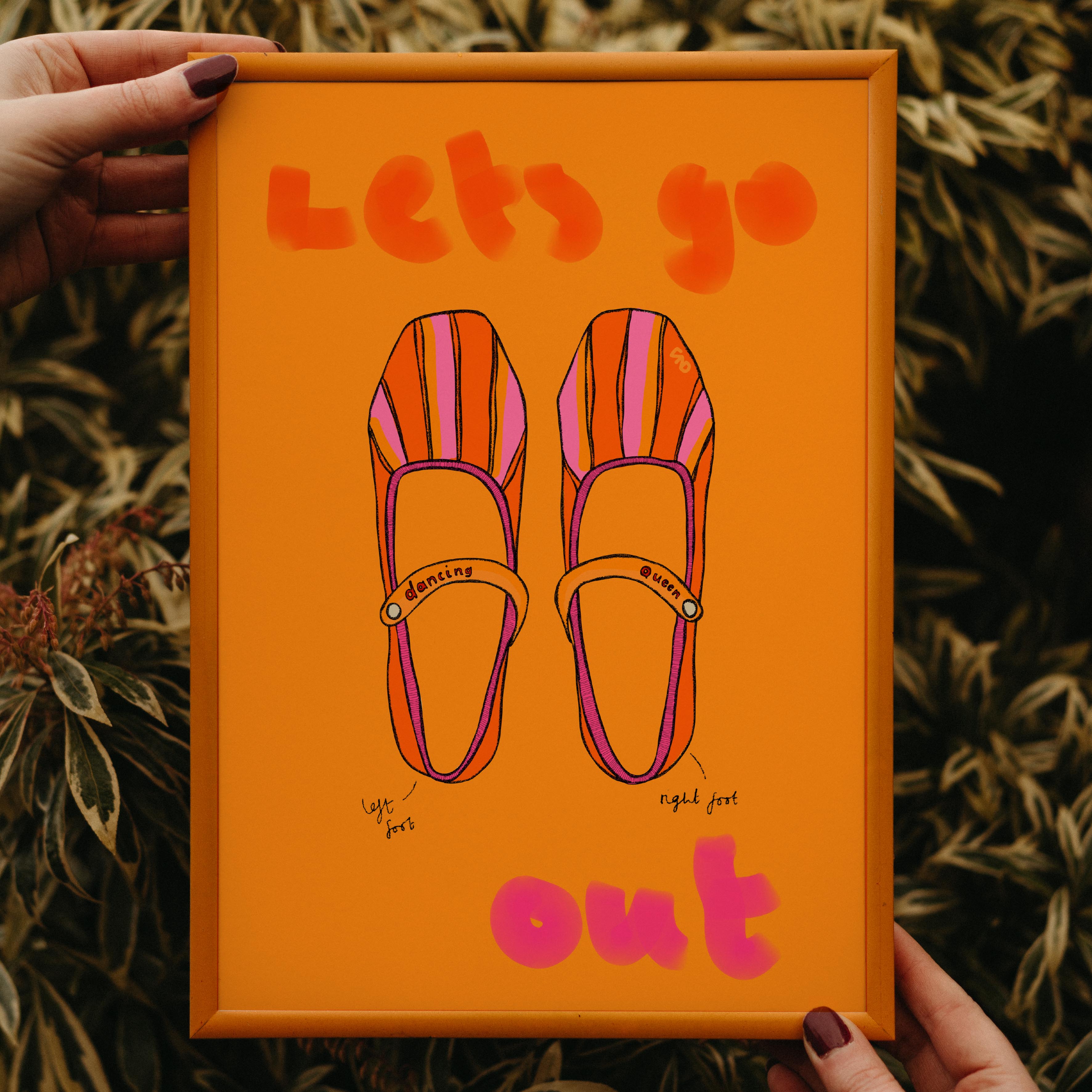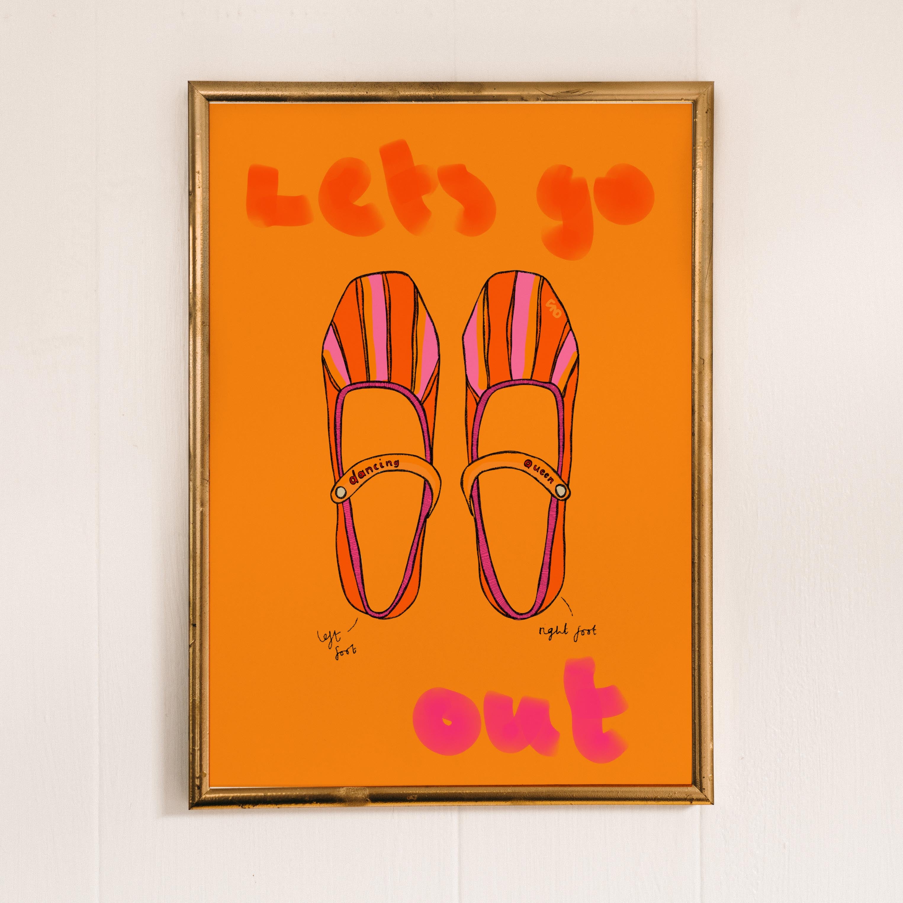 A vibrant lifestyle art print of a pair of shoes with the quote 'let's go out' painted around.