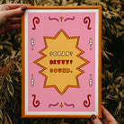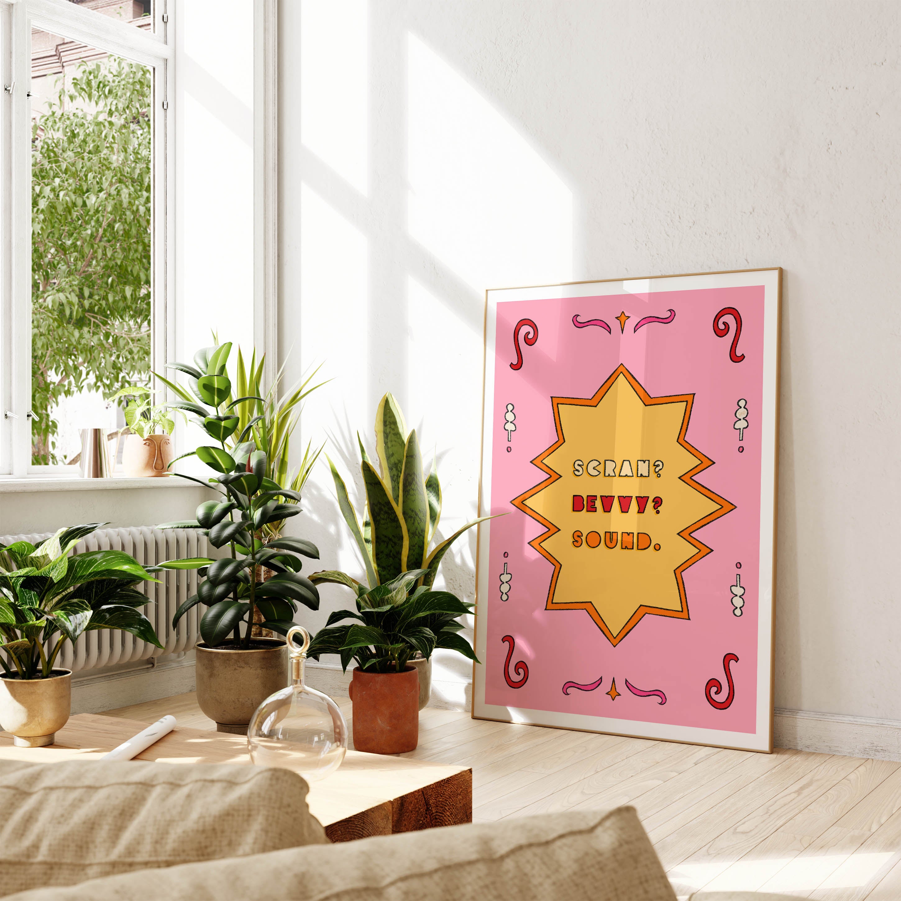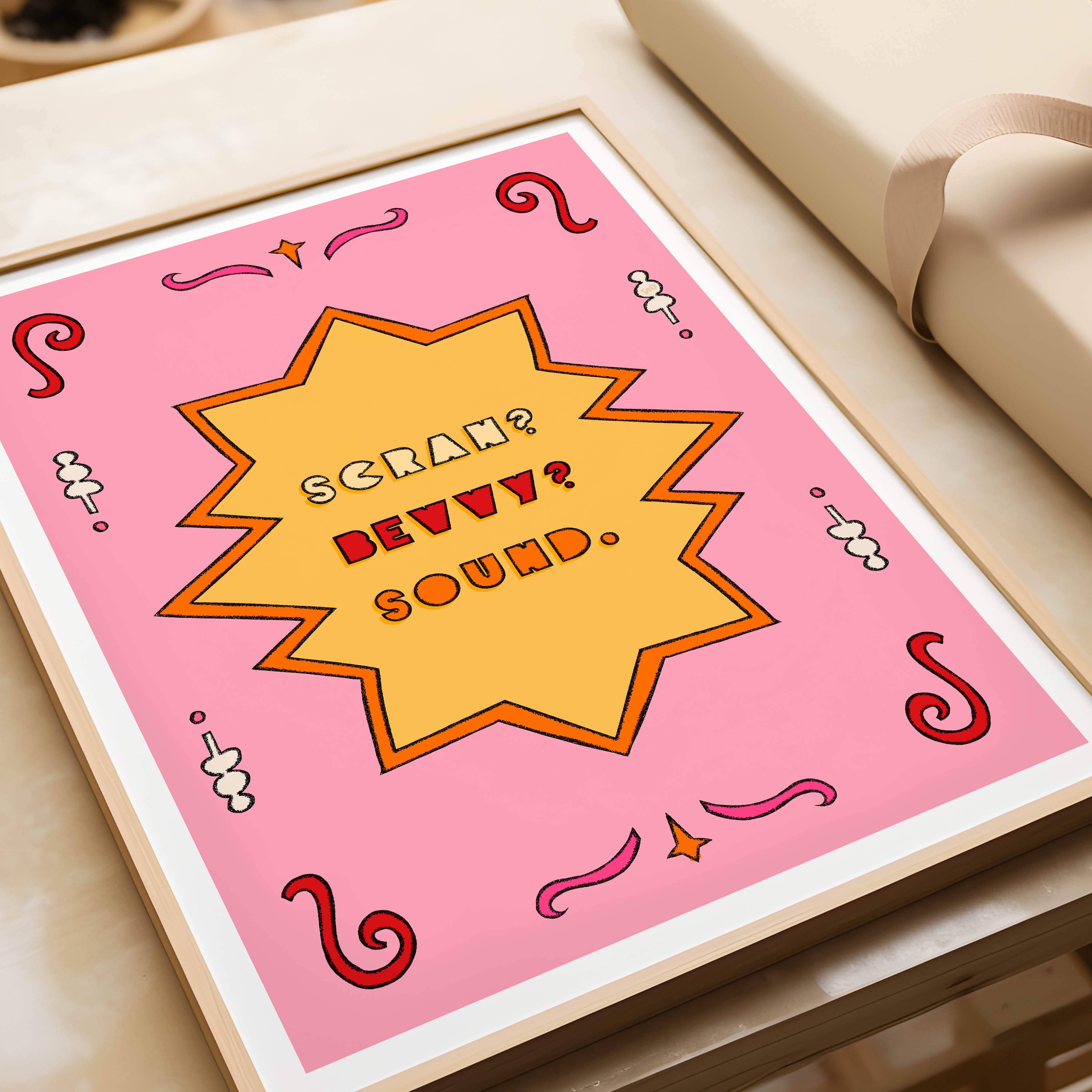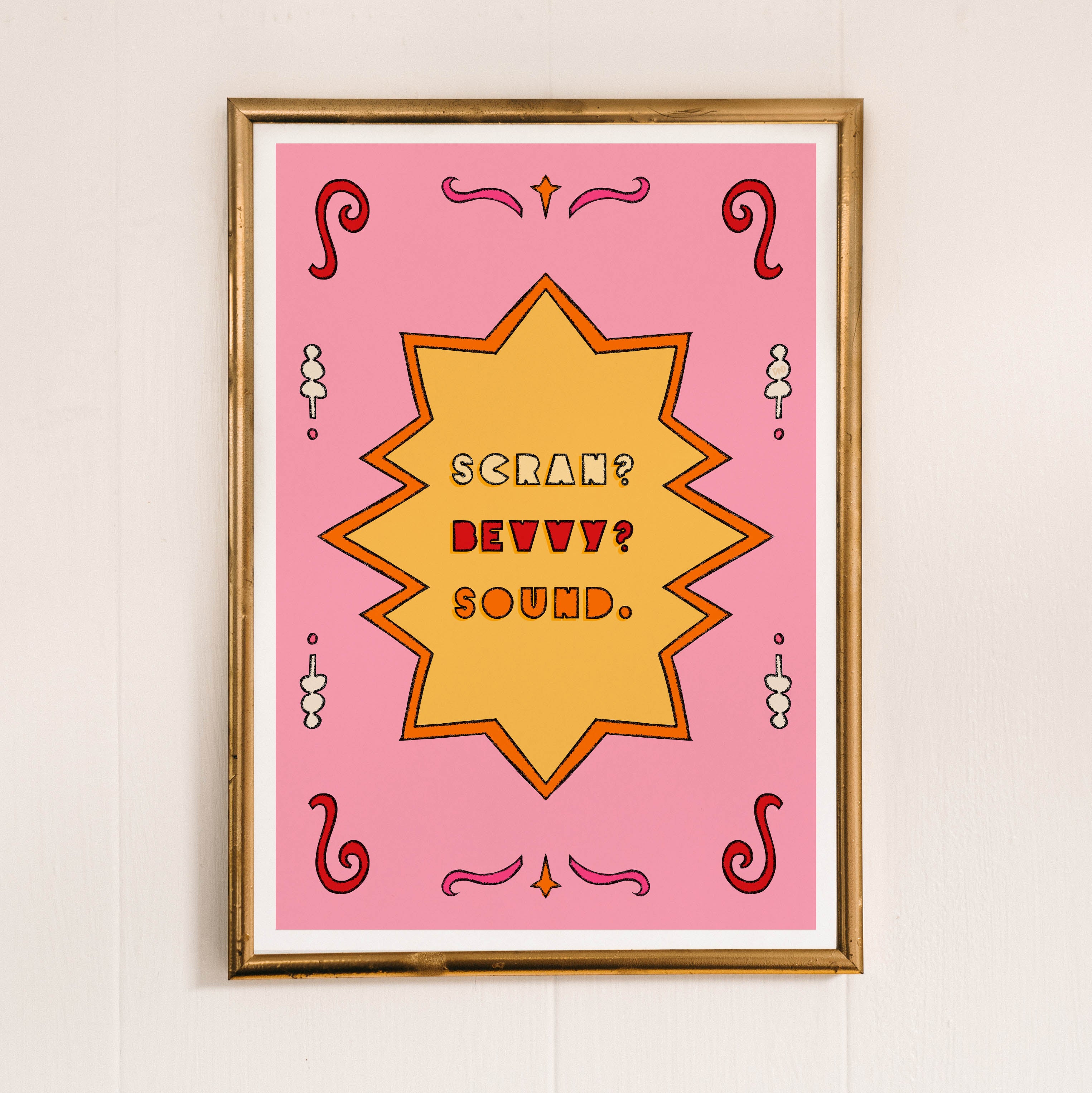 A vibrant art print inspired by the Scouse dialect 'Scran? Bevvy? Sound.' with an illustrated border. A foodie text print for any proud Scouse home.