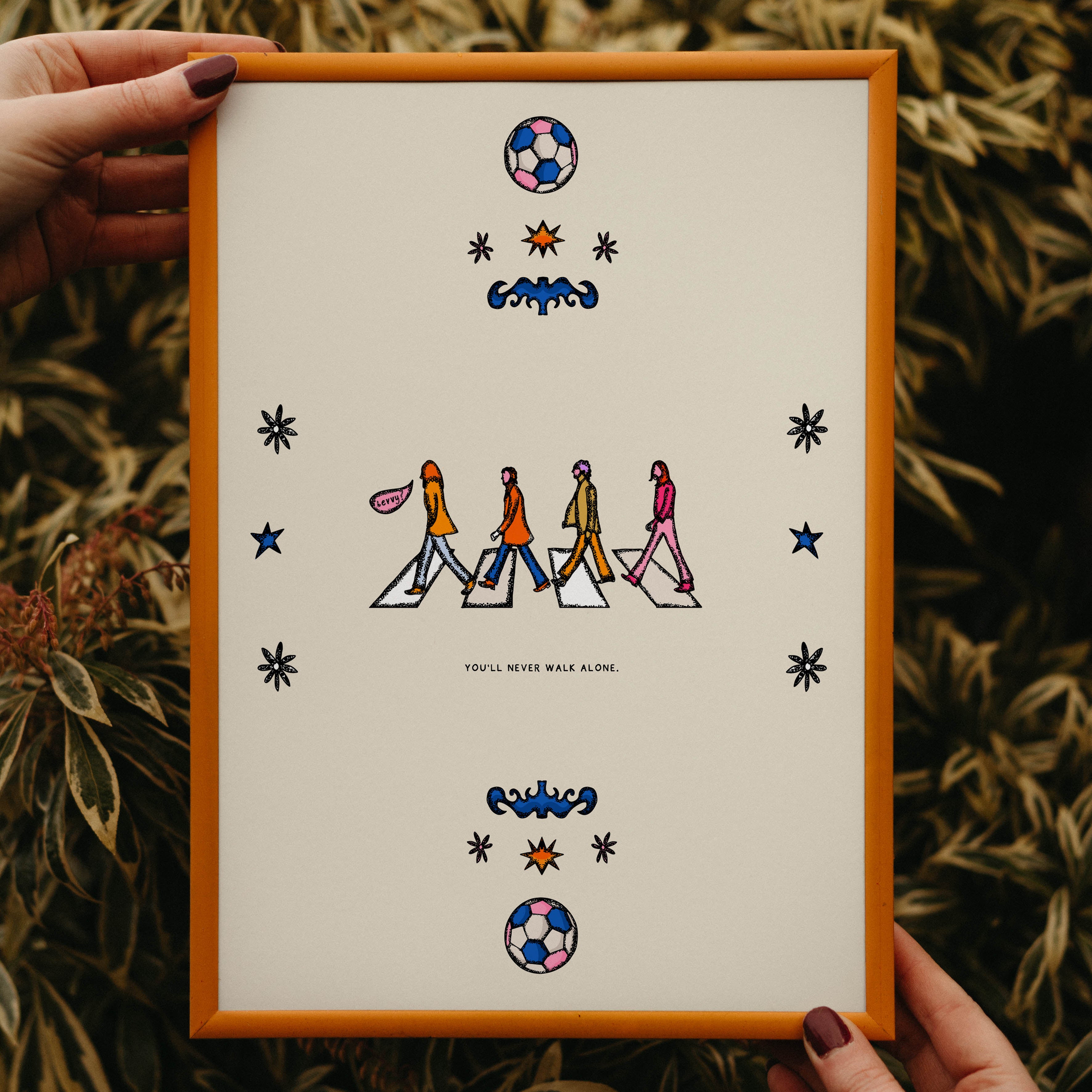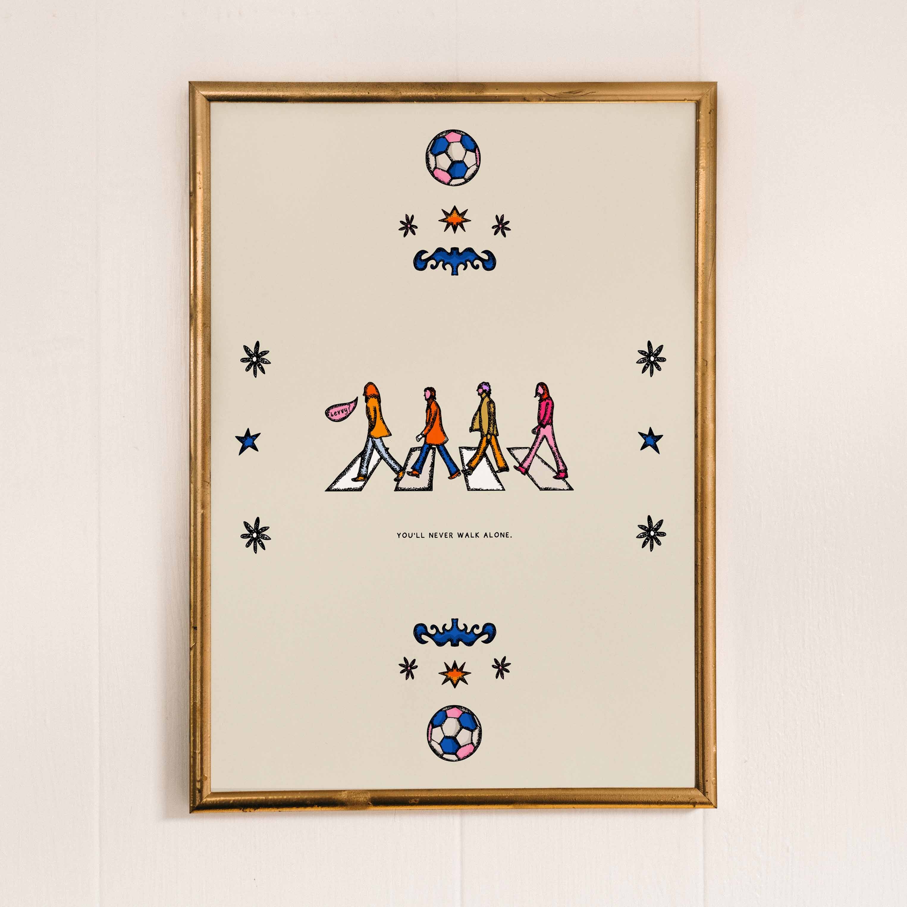 A vibrant art print of iconic Liverpool culture surrounded by footballs and the infamous quote 'You'll Never Walk Alone.' The perfect gift for any Liverpool FC fan.