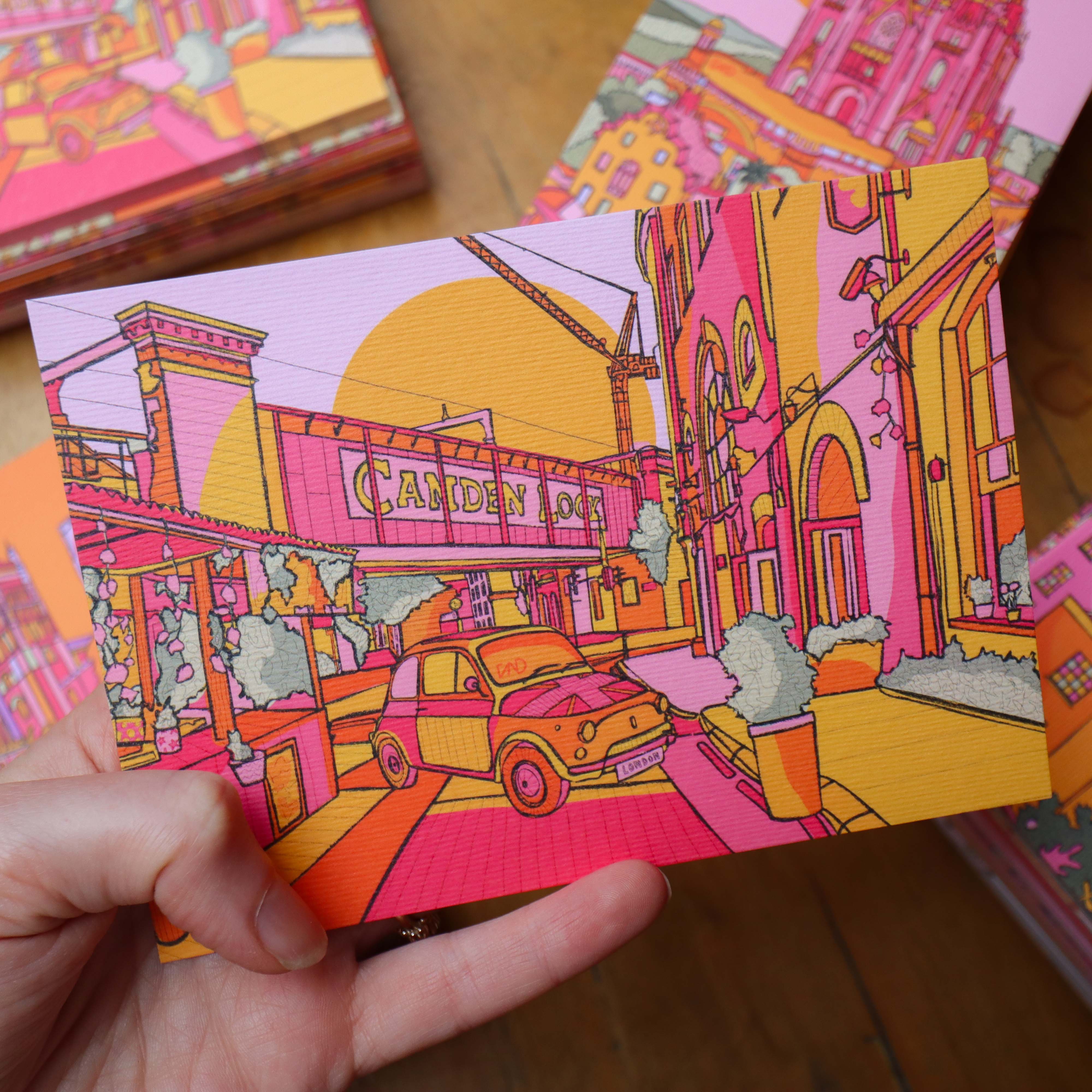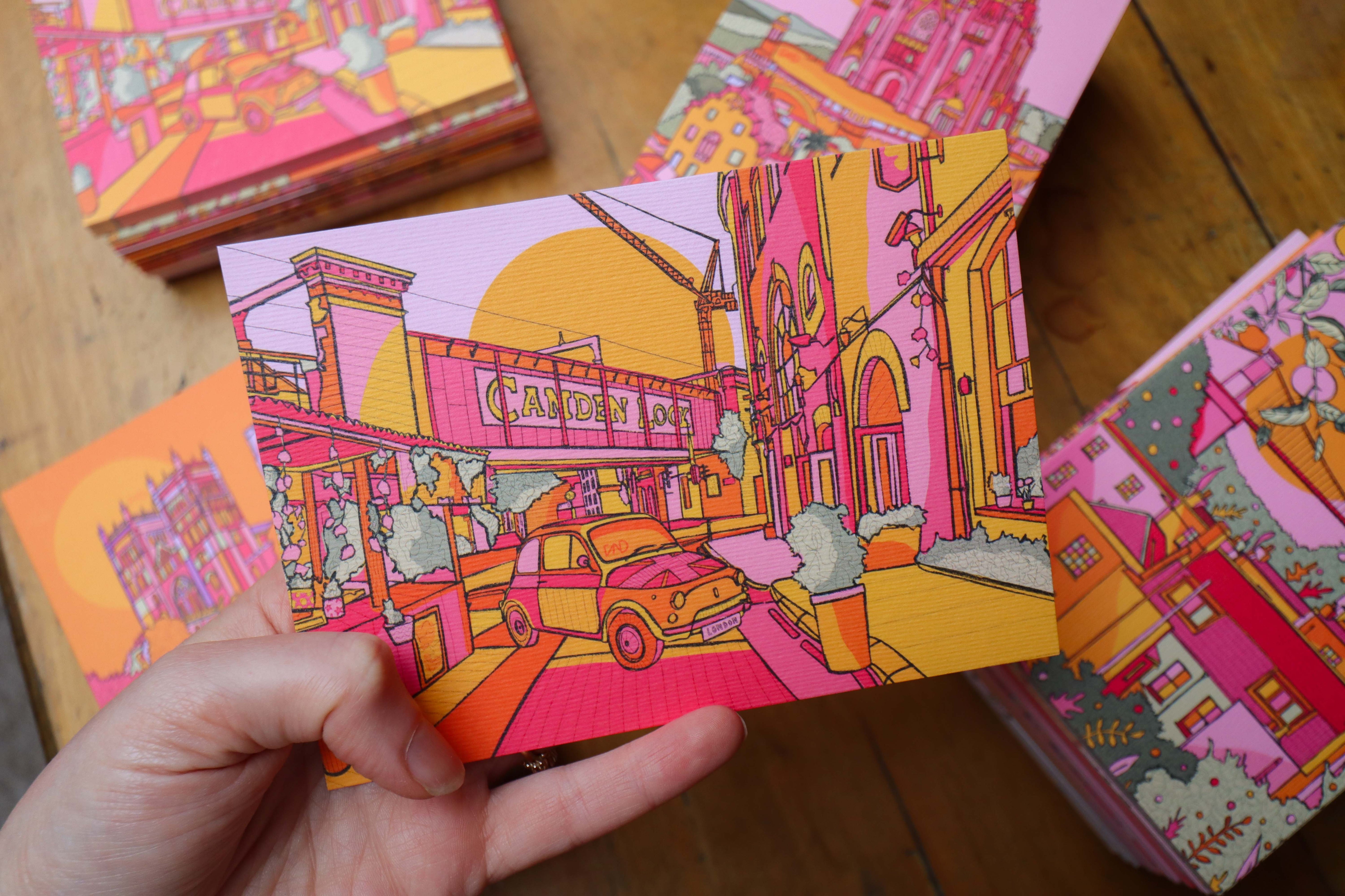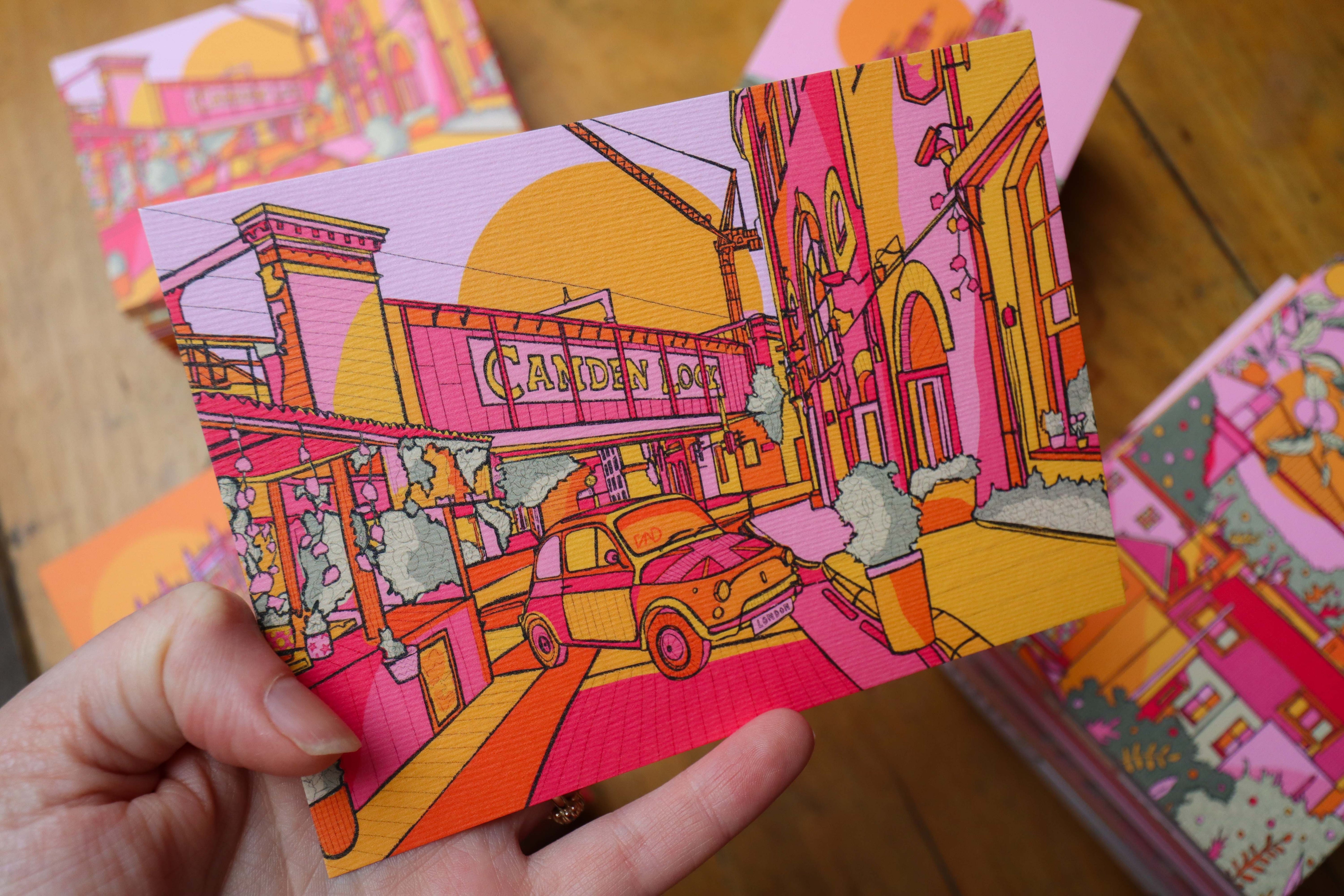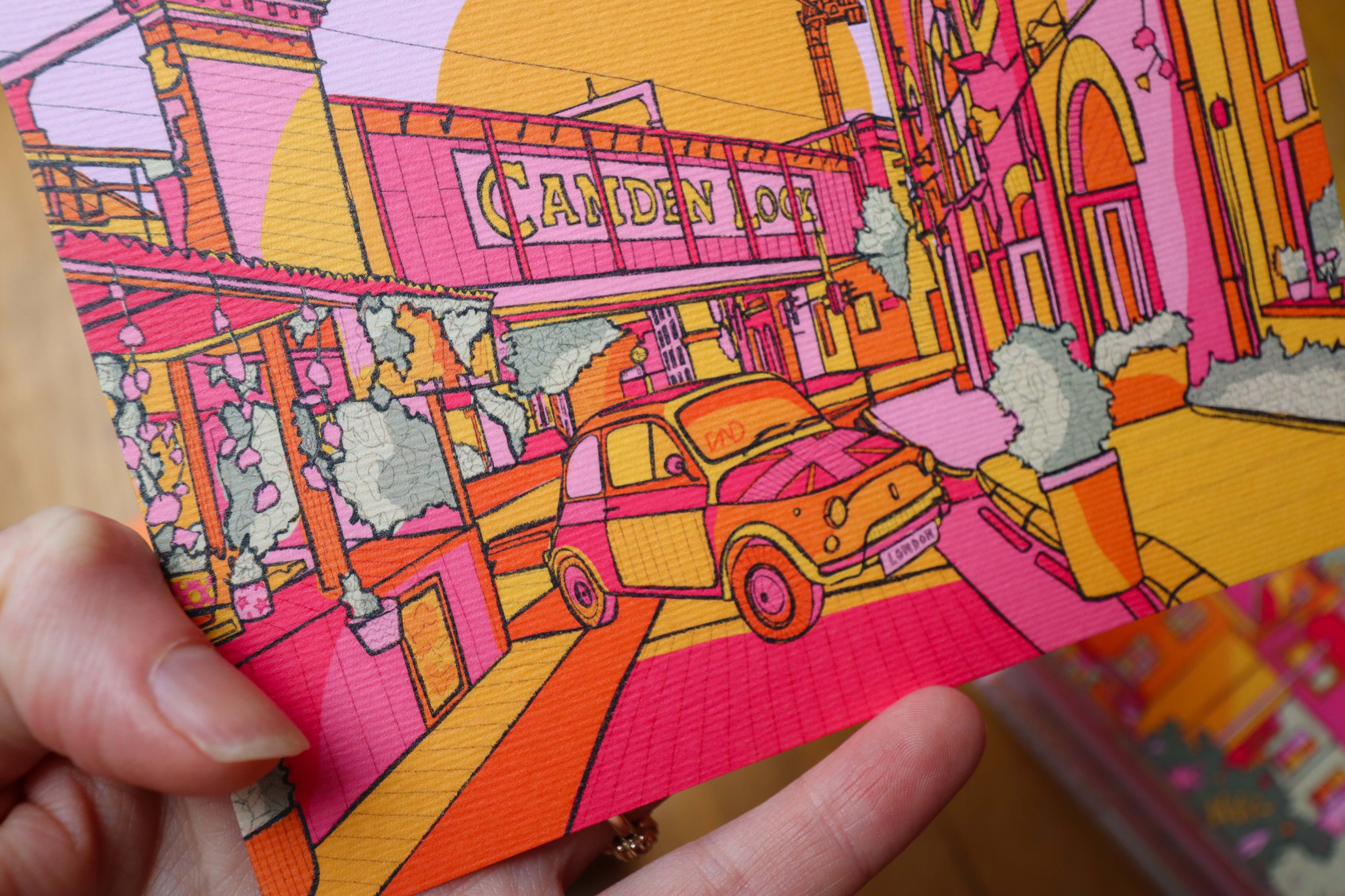 A vibrant luxury postcard of Camden illustrated in bright pink, green, orange, and yellow.