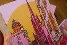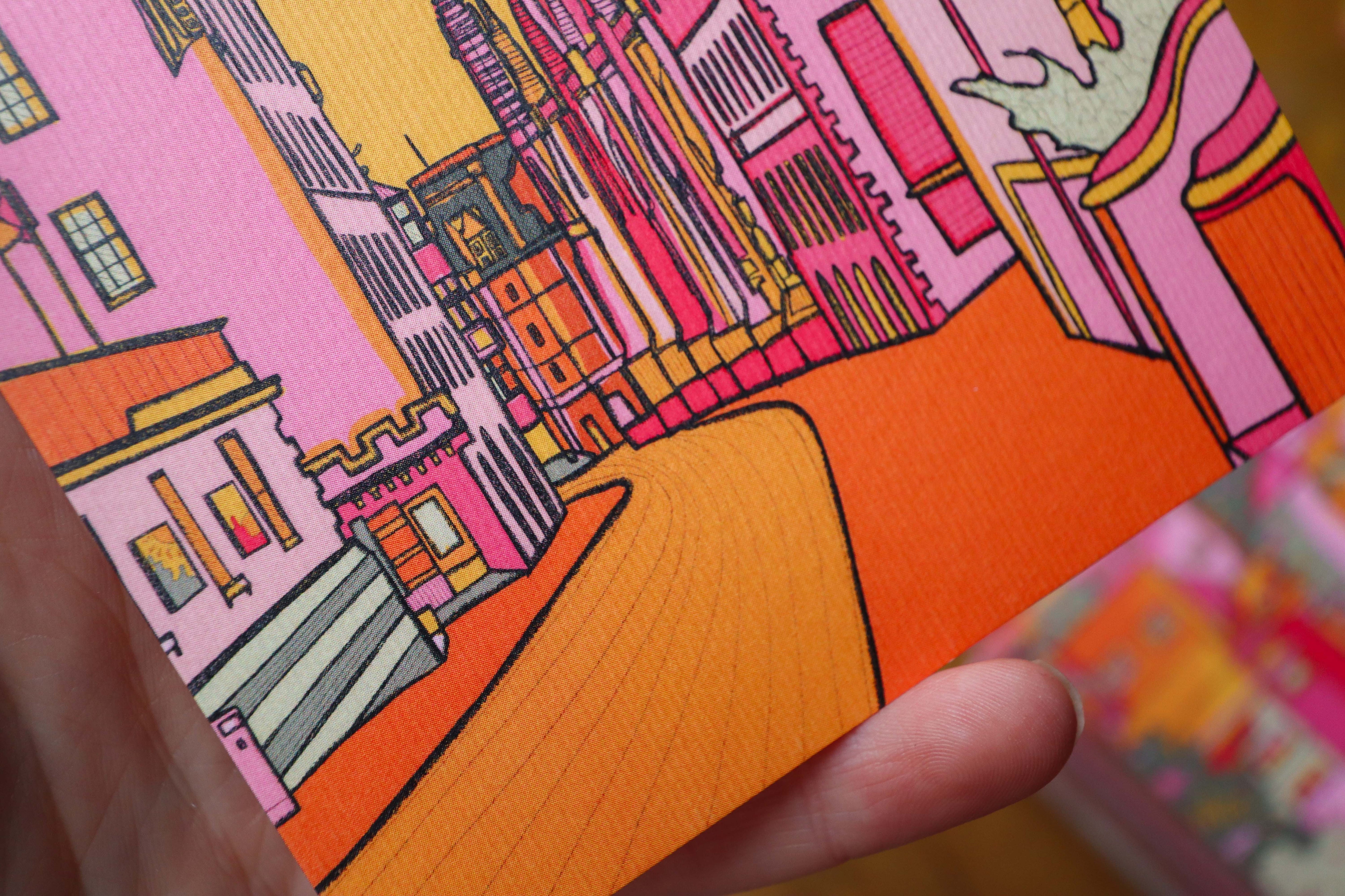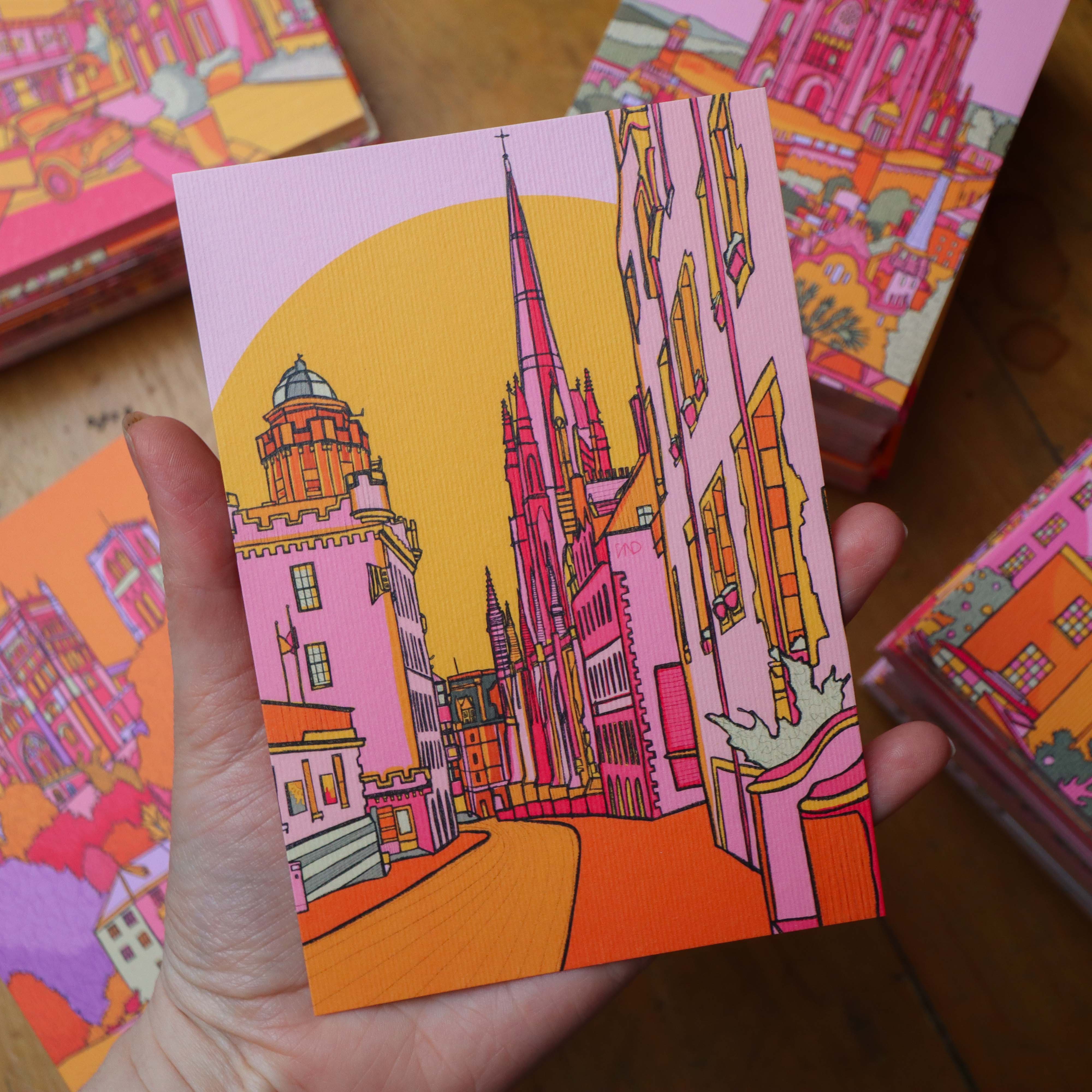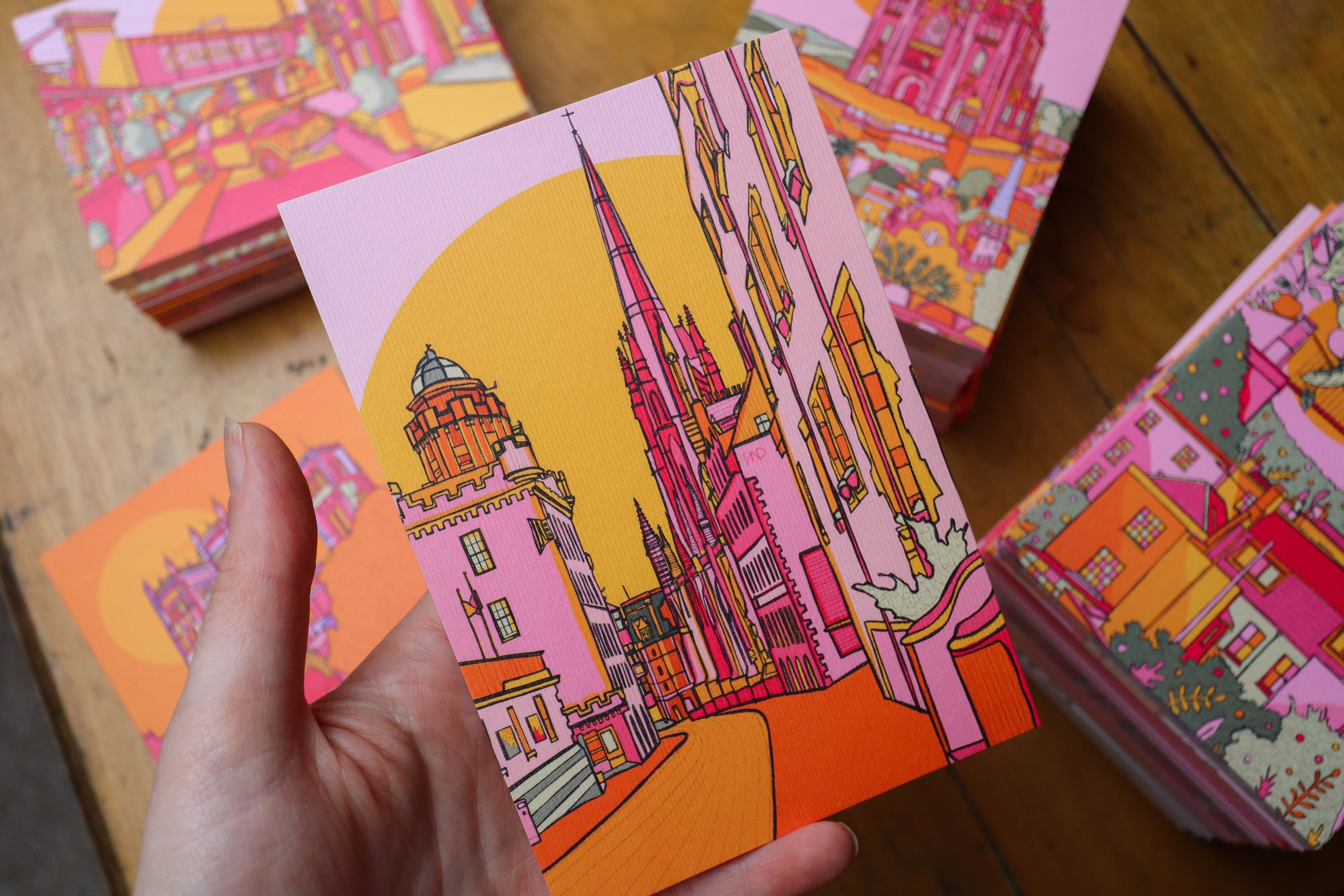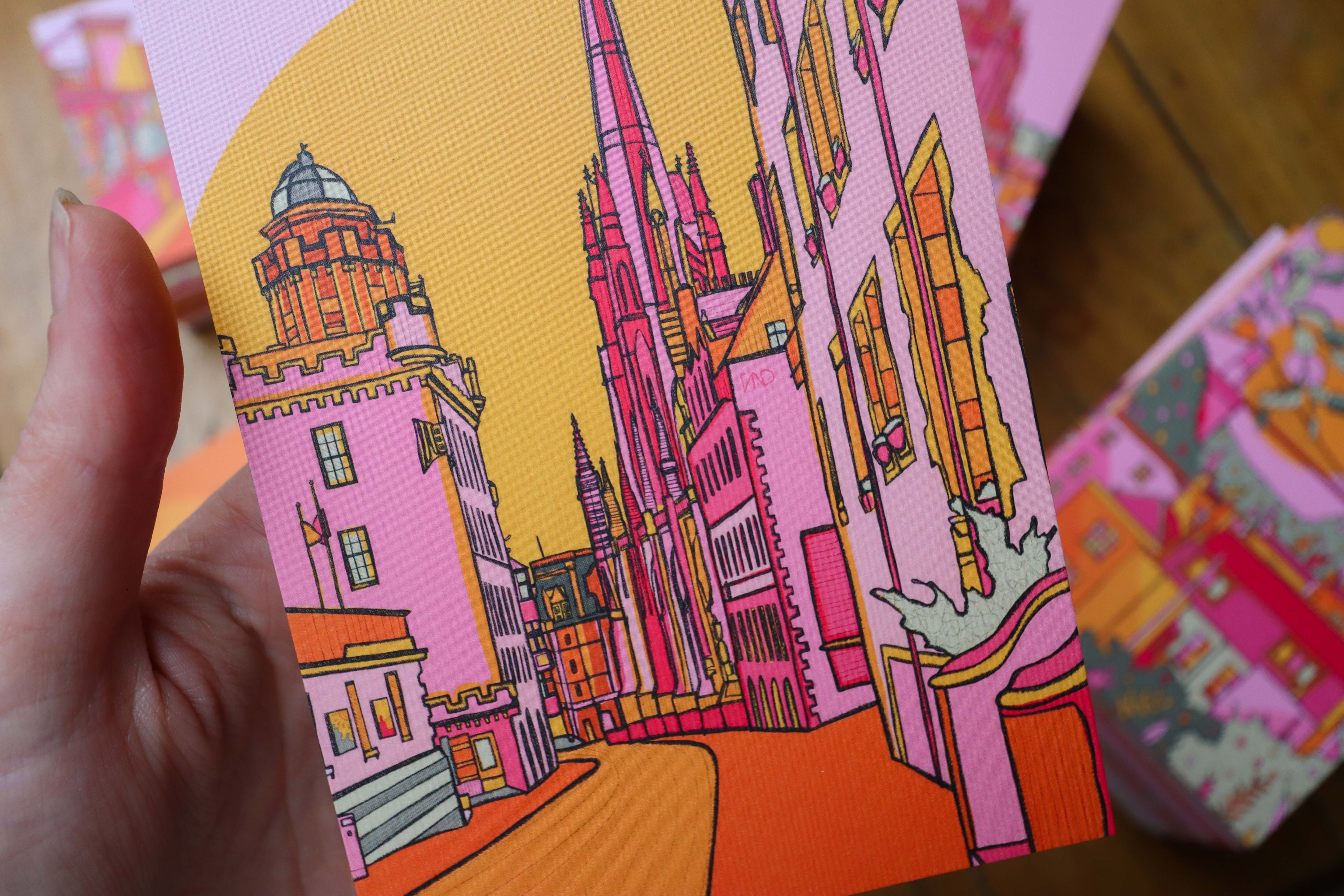 A vibrant luxury postcard of Edinburgh illustrated in bright pink, green, orange, and yellow.