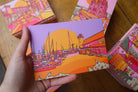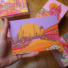 A vibrant luxury postcard of Falmouth illustrated in bright pink, green, orange, and yellow.