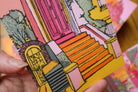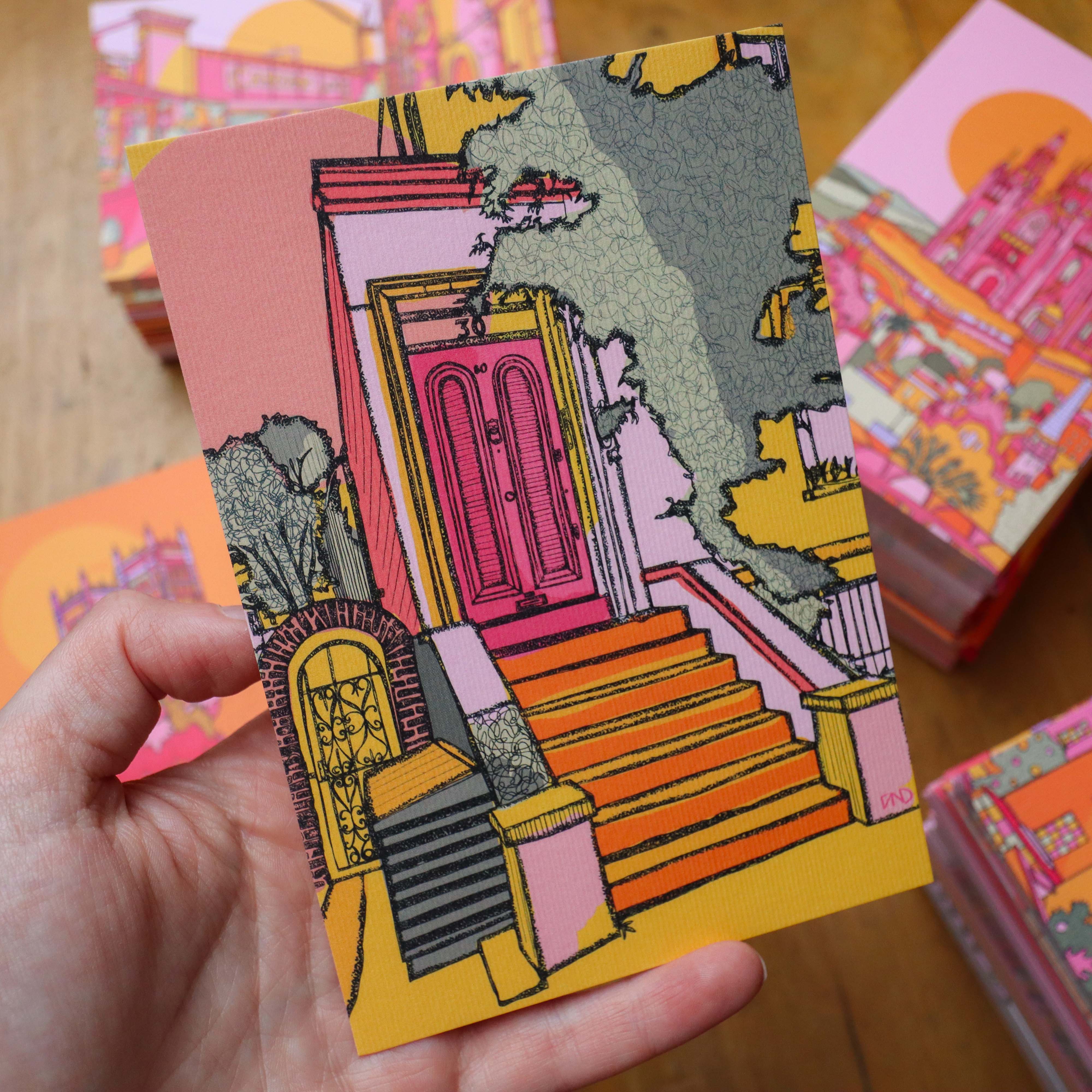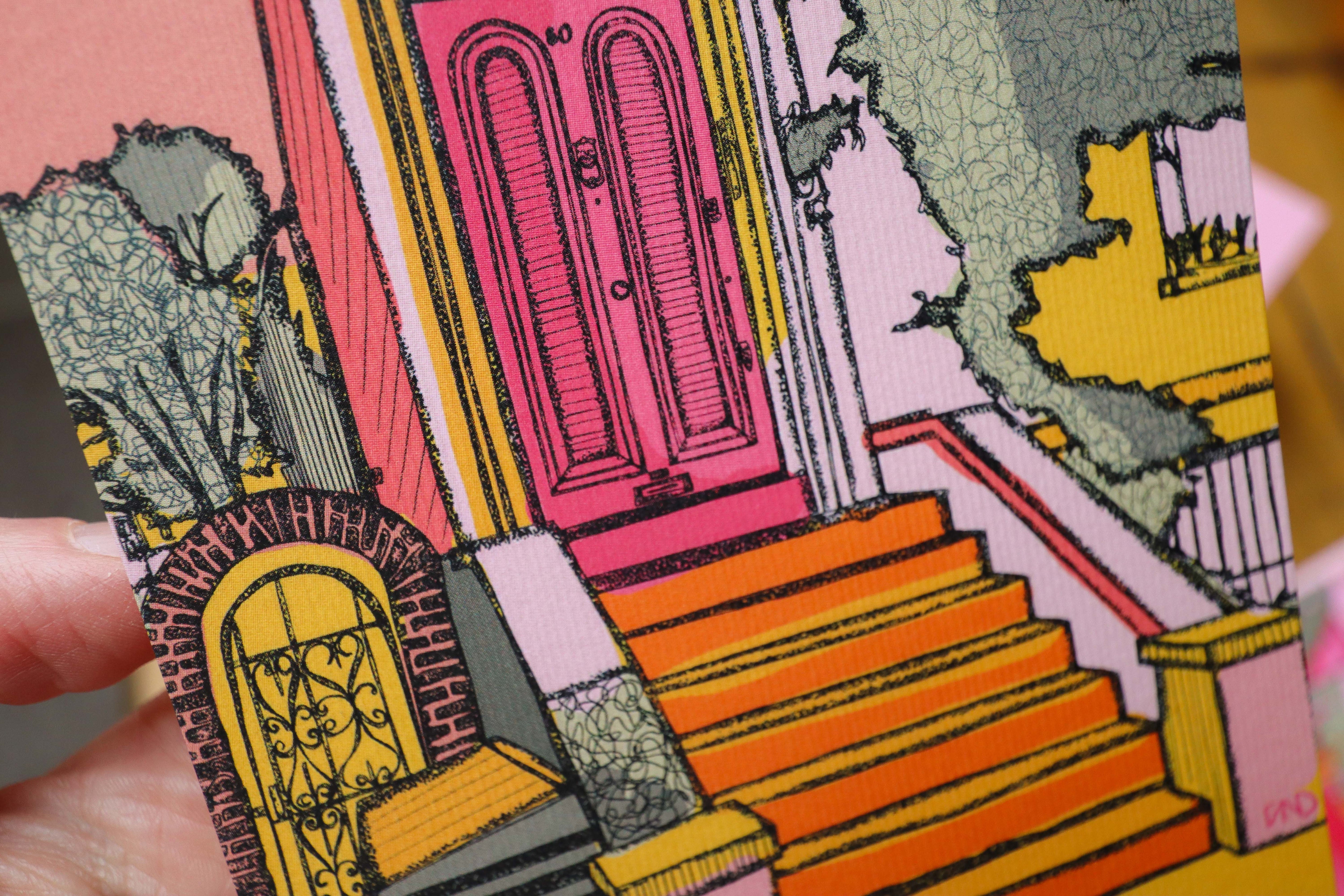 A vibrant luxury postcard of Kensington illustrated in bright pink, green, orange, and yellow.
