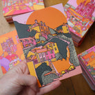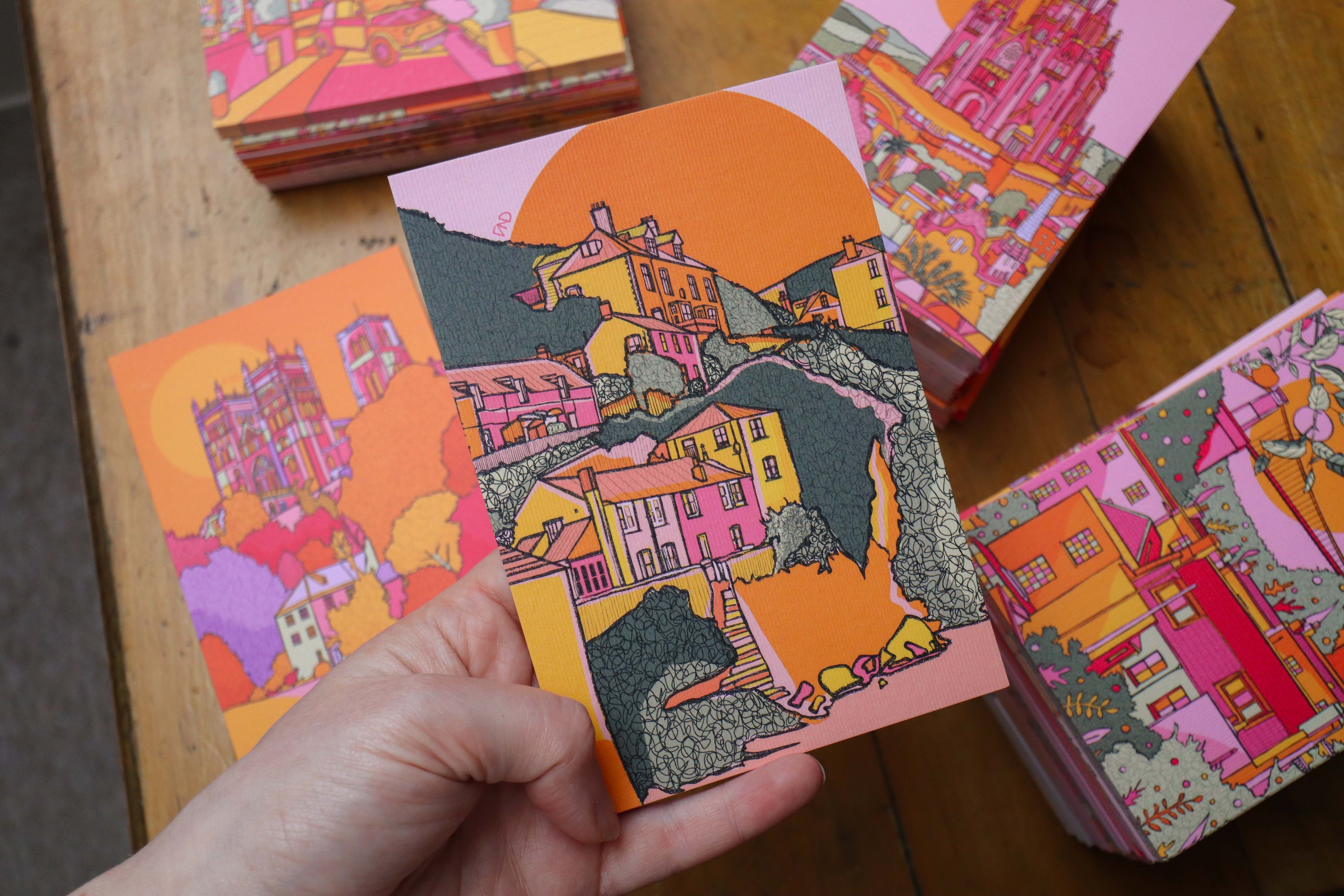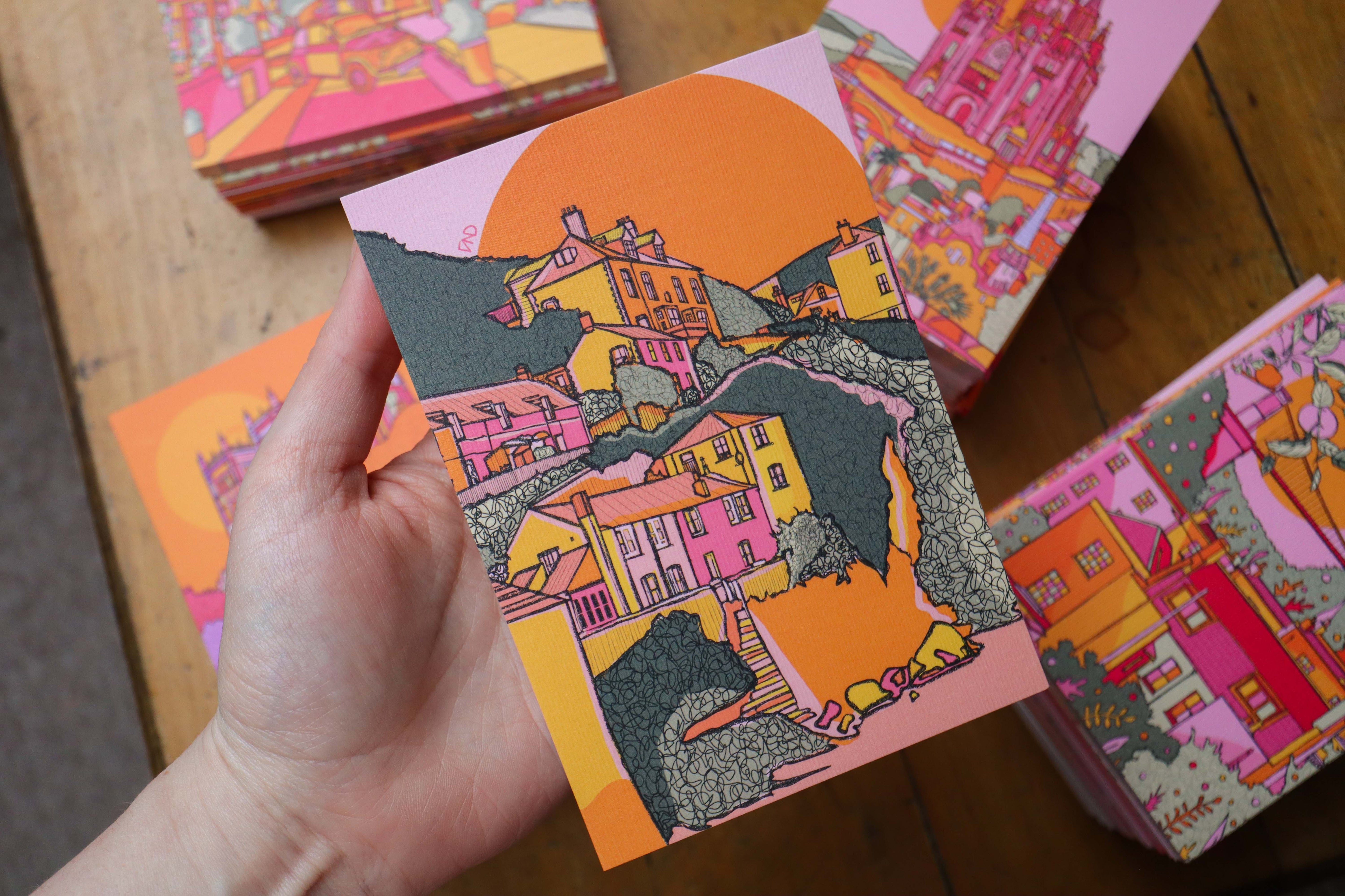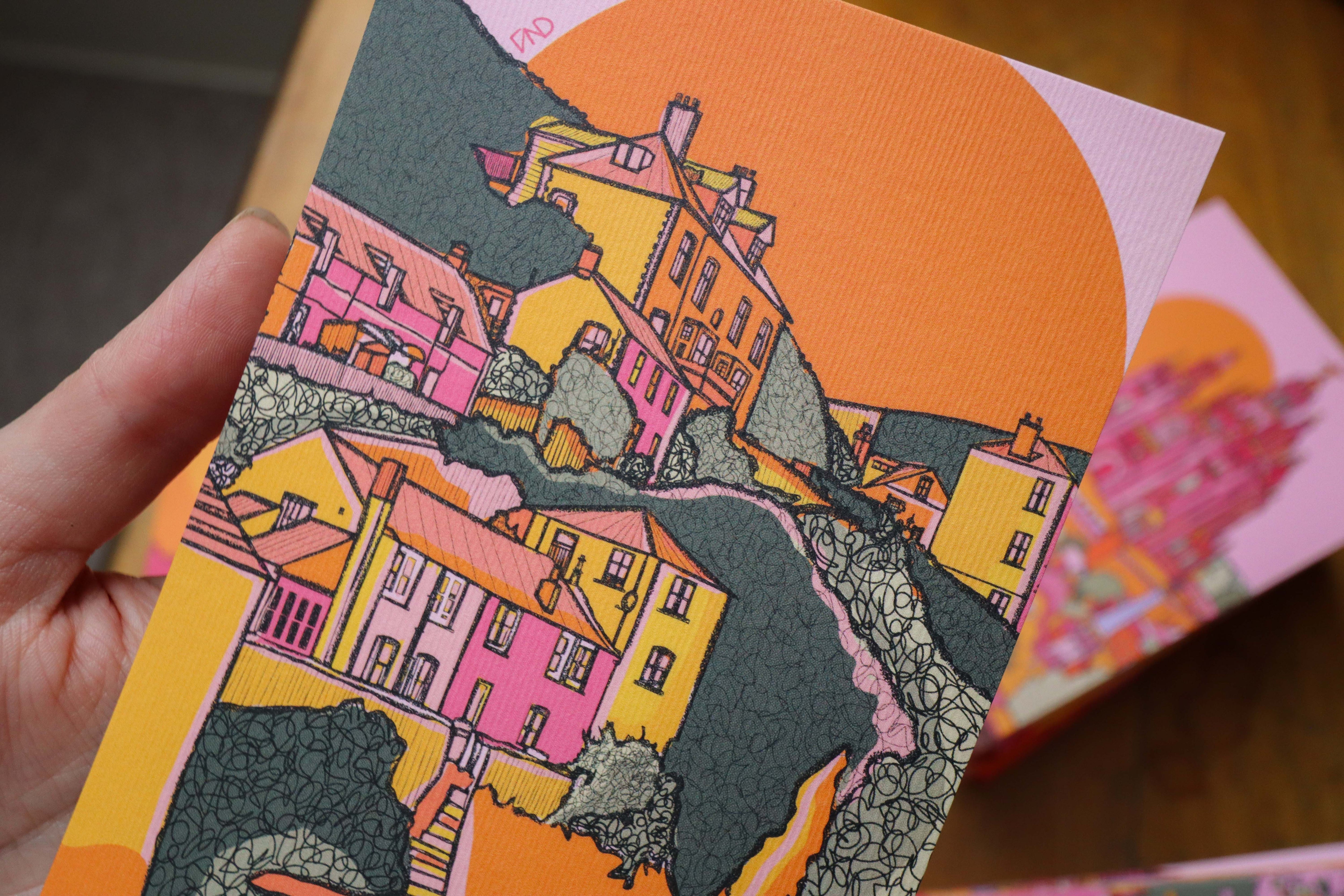 A vibrant luxury postcard of Port Isaac illustrated in bright pink, green, orange, and yellow.
