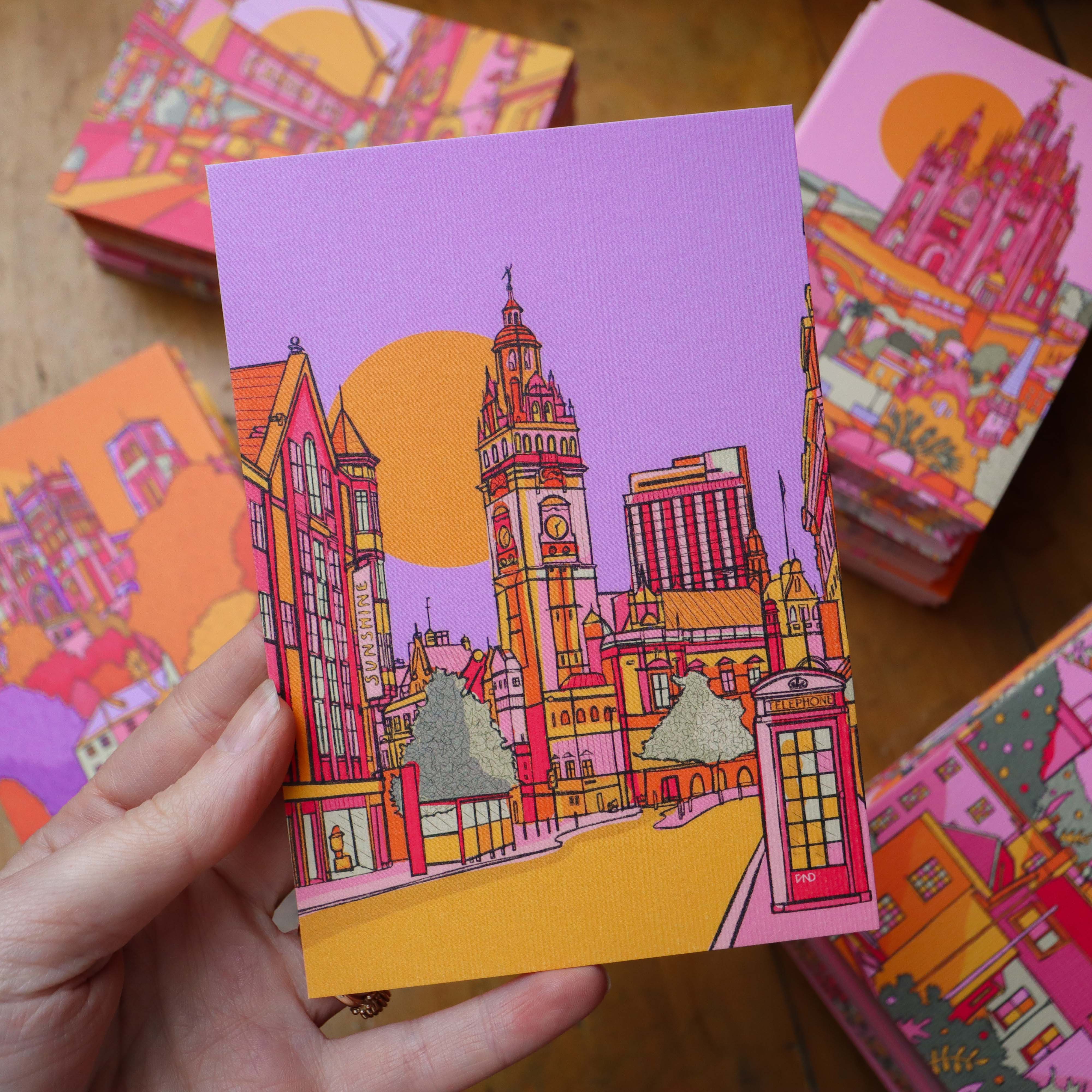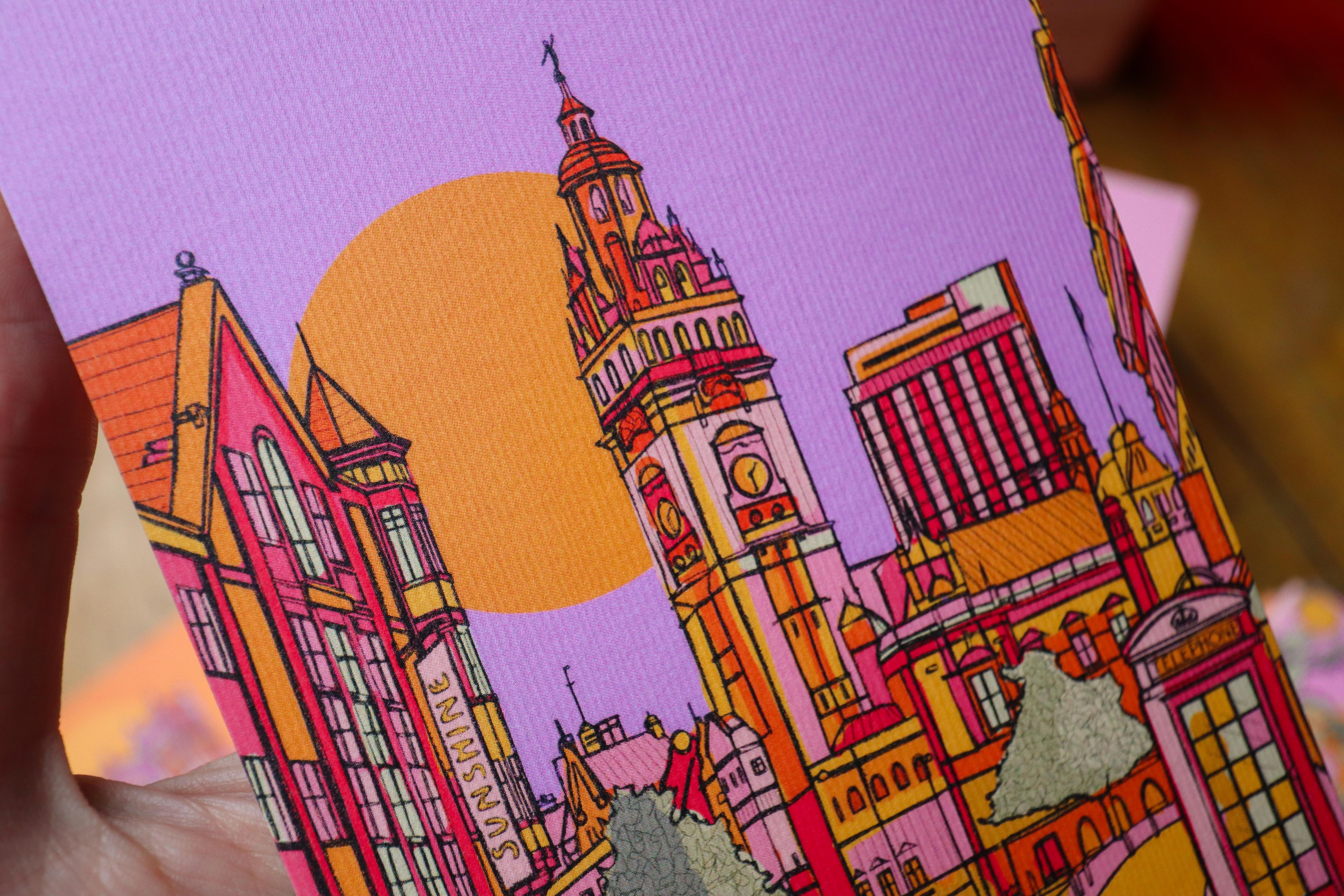 A vibrant luxury postcard of Sheffield illustrated in bright purple, pink, green, orange, and yellow.