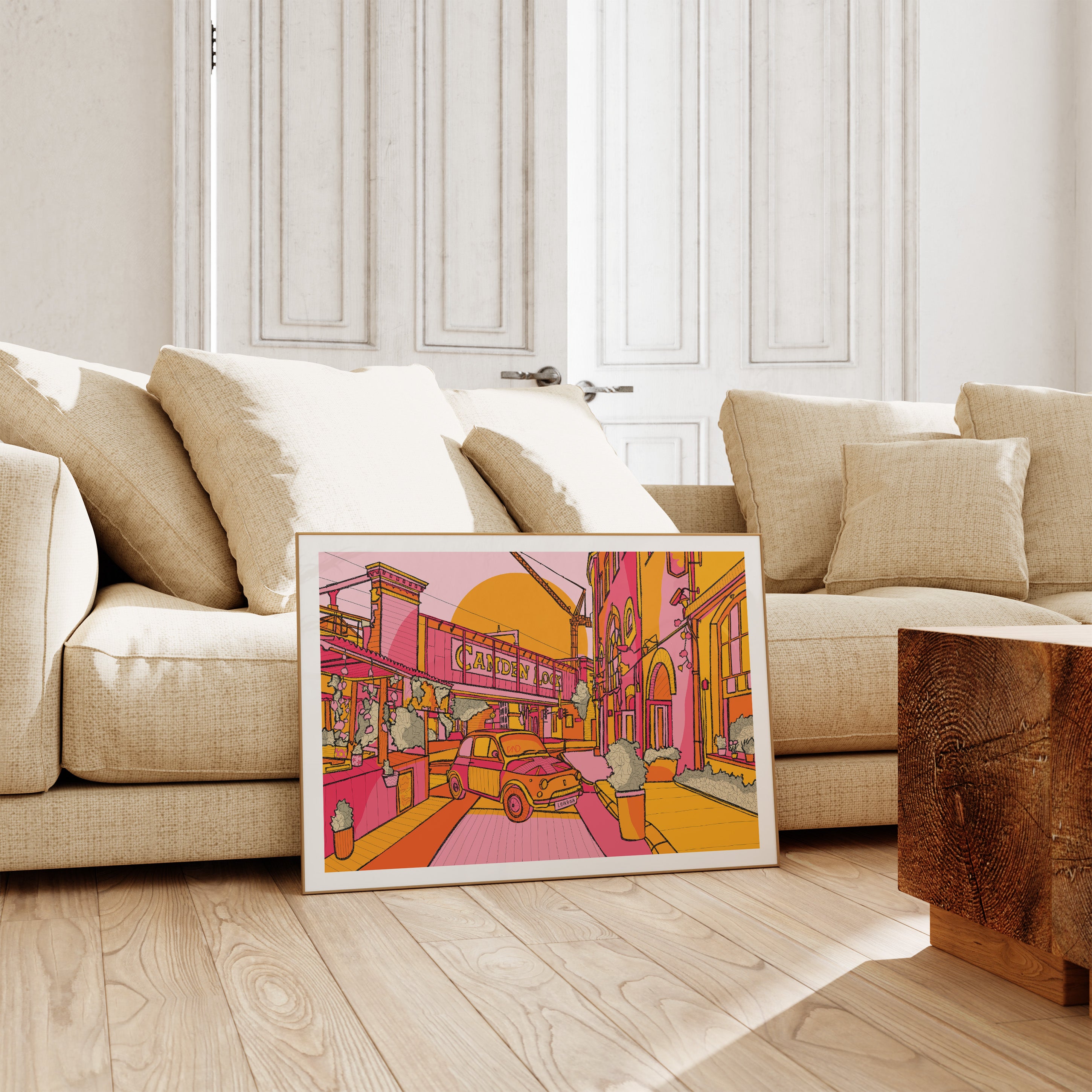 A vibrant art print of Camden Lock in London illustrated in bright pinks and oranges.