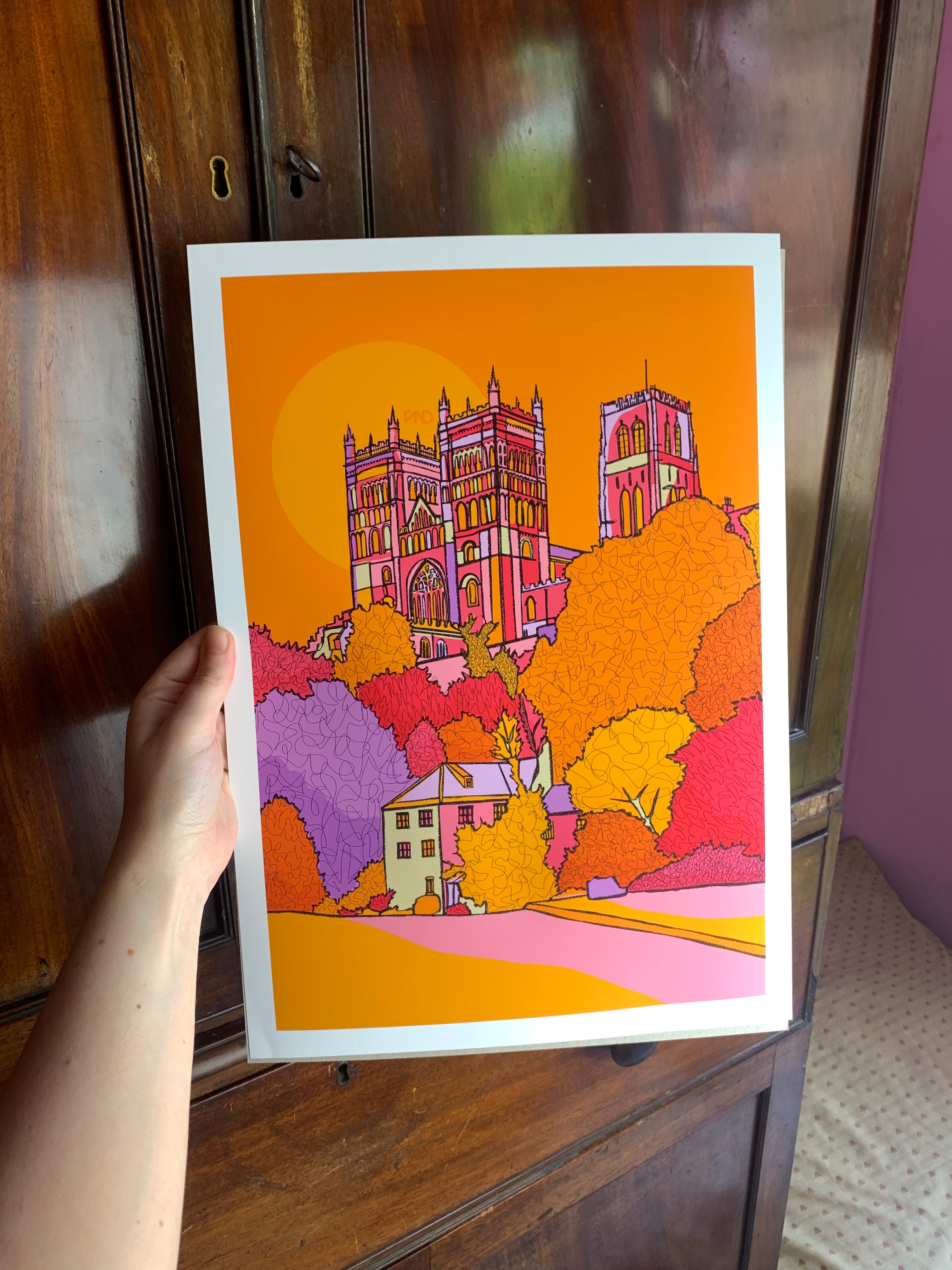 A vibrant art print of Durham illustrated in bright pinks, oranges, purples, and yellows.