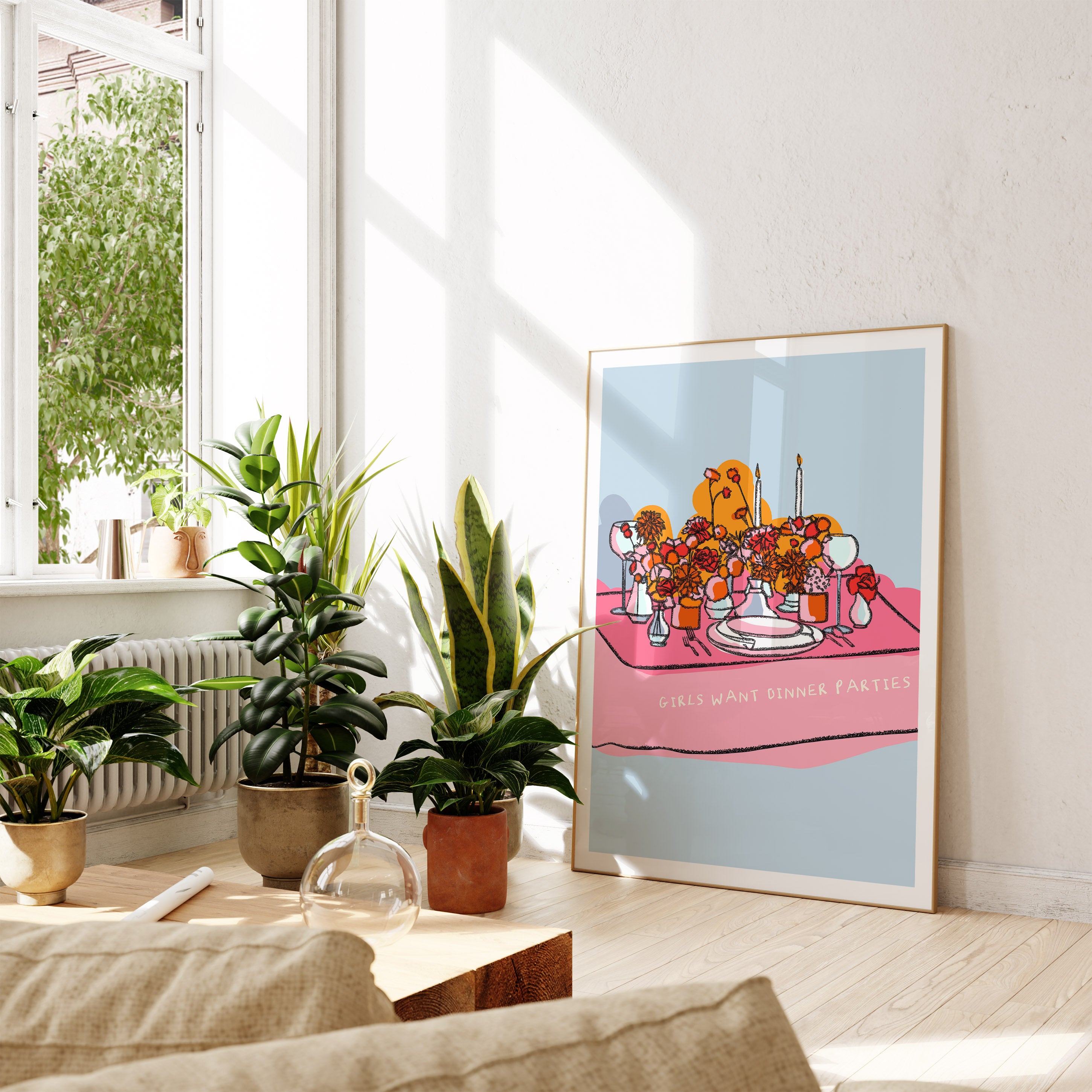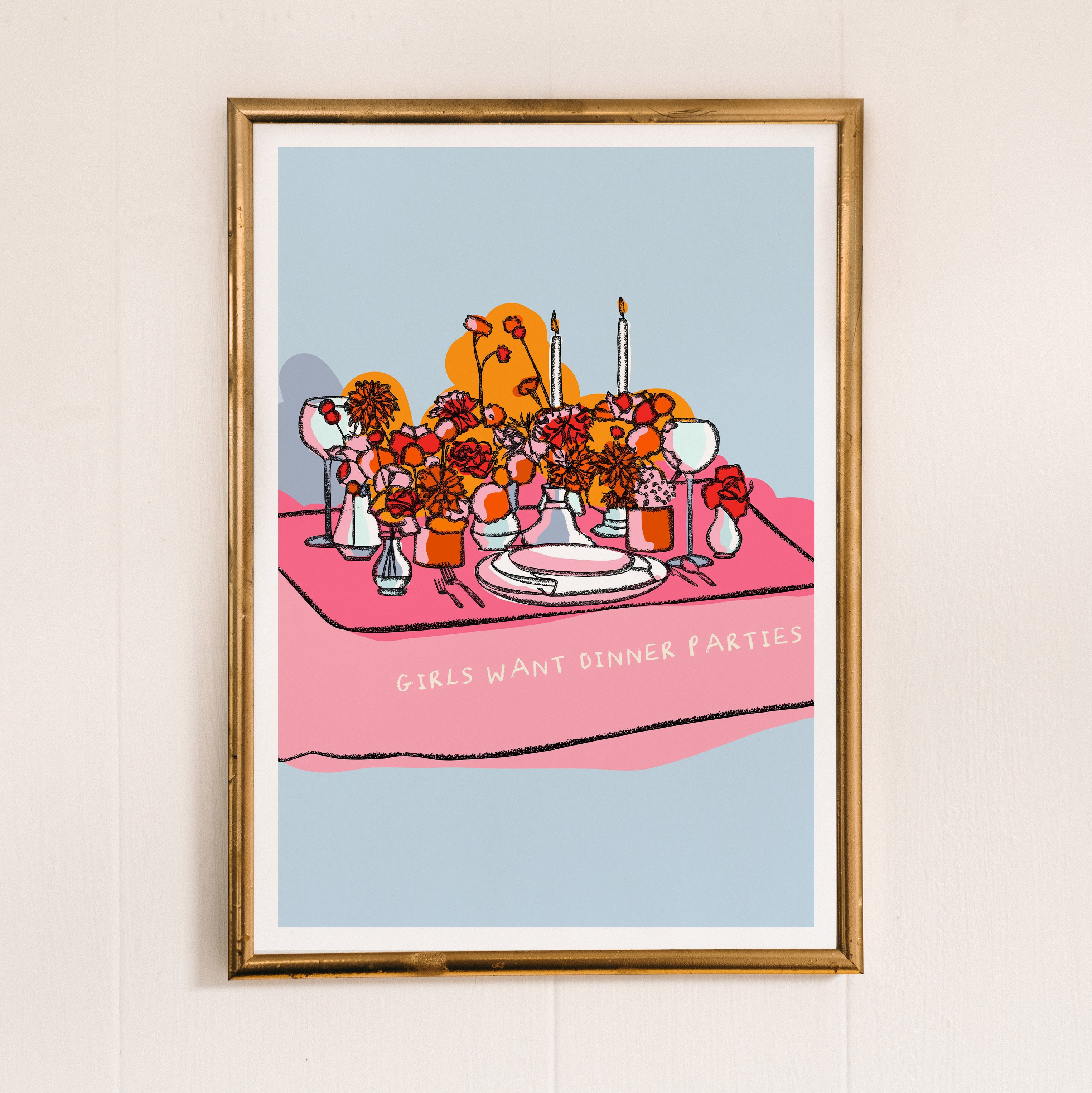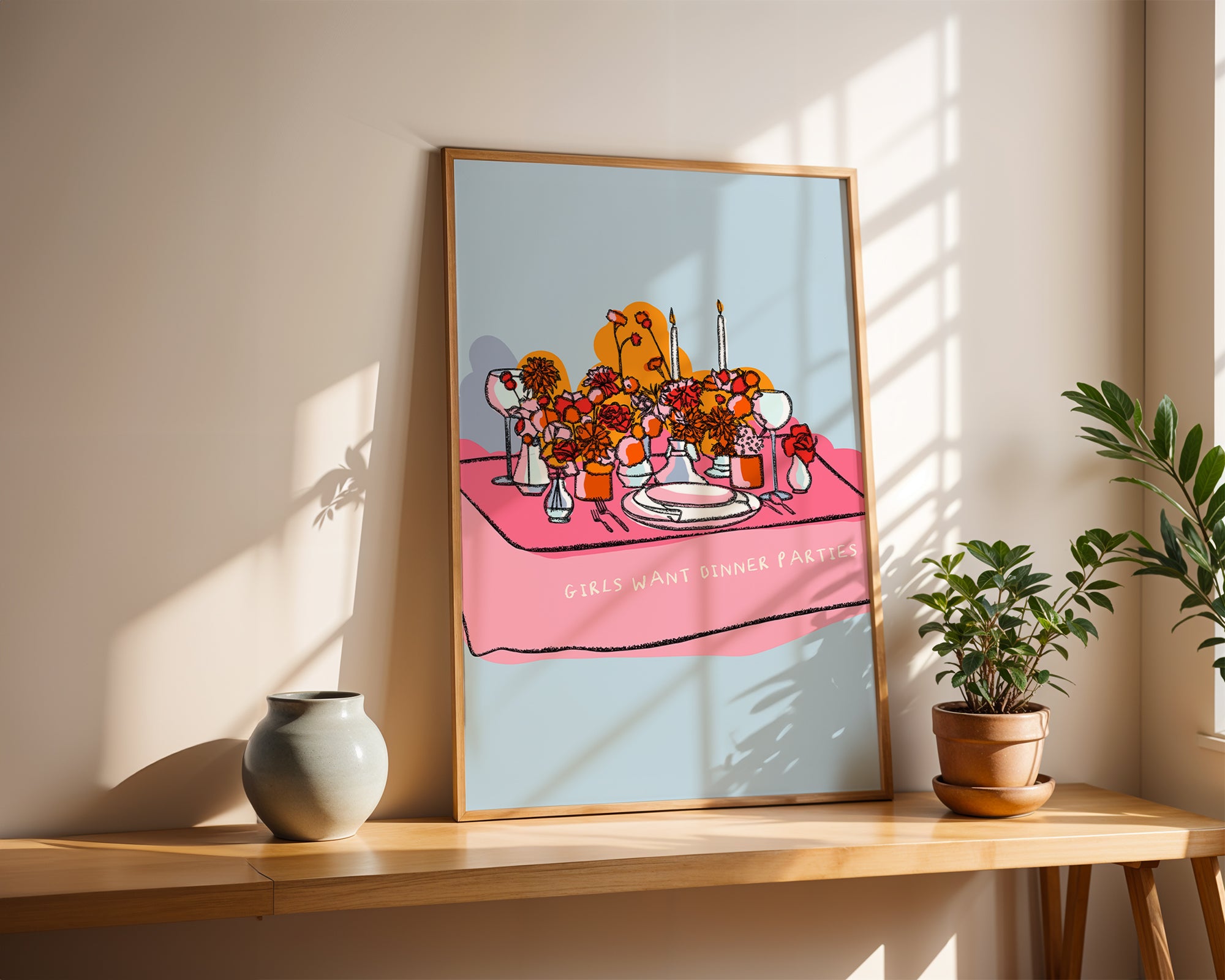 A stylised vibrant art print of a beautiful dinner party table with the quote 'Girls want dinner parties.' because at the end of the day I live to host a dinner party.