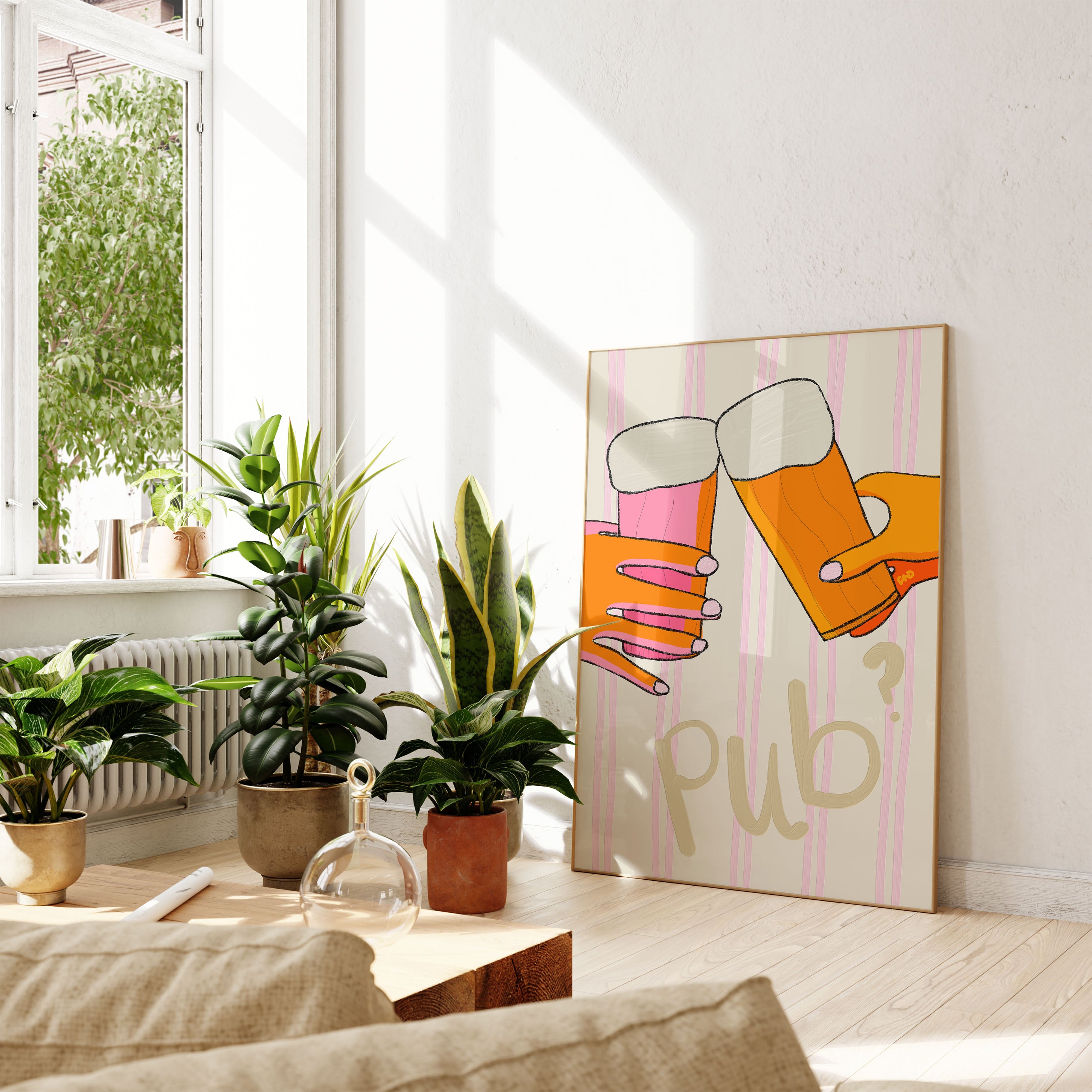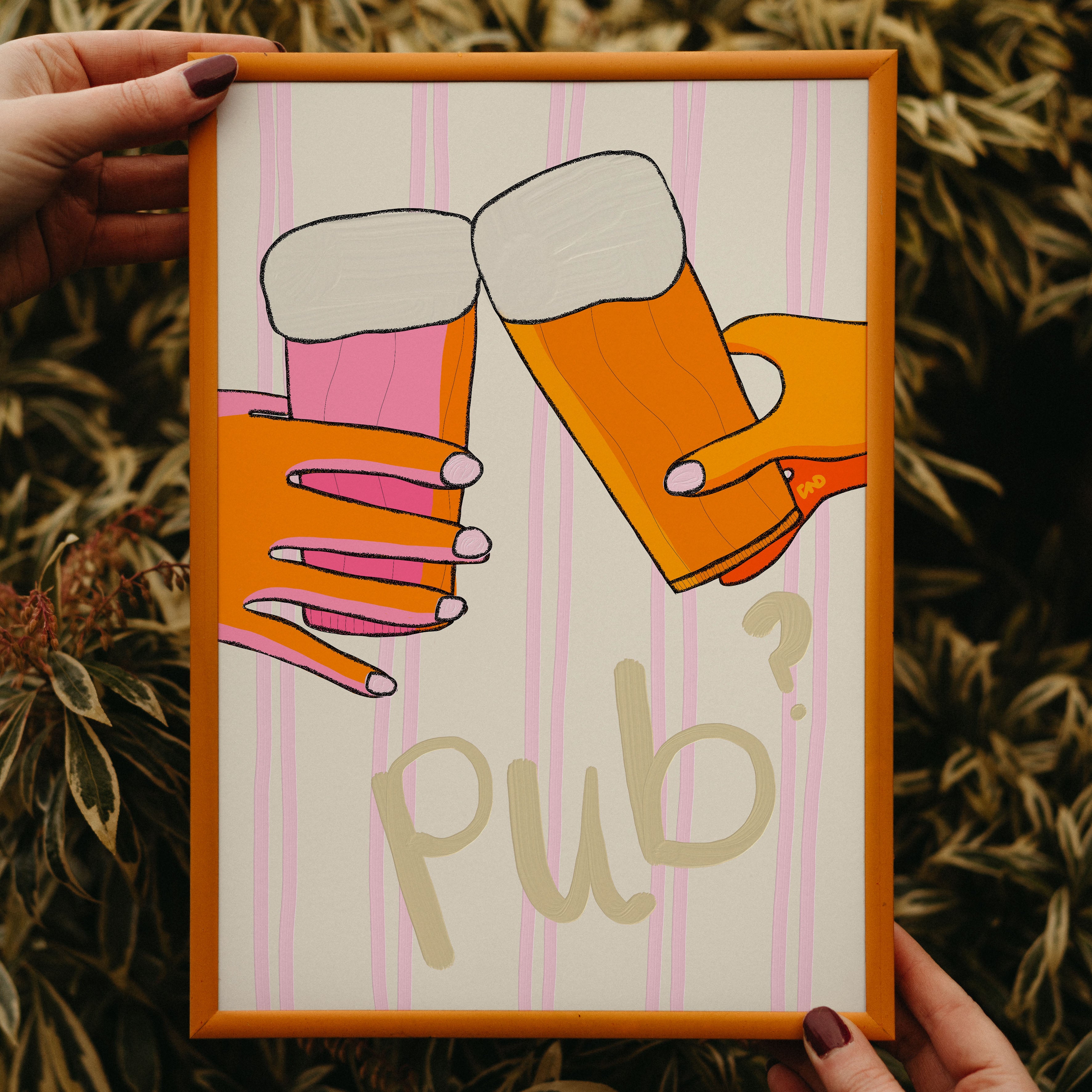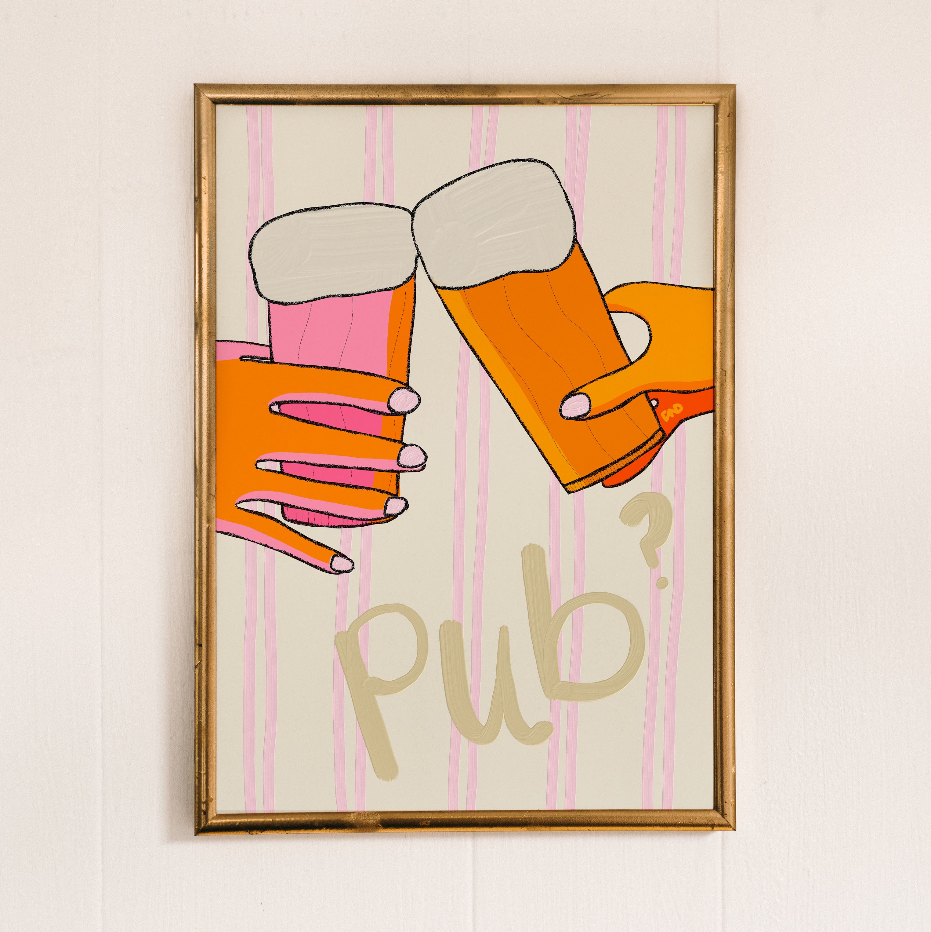 A hand-painted stripy pastel art print of two hands cheersing pints with hand-painted text 'pub?'. Illustrated in creamy pastel pinks, beige, green, and vibrant orange.
