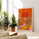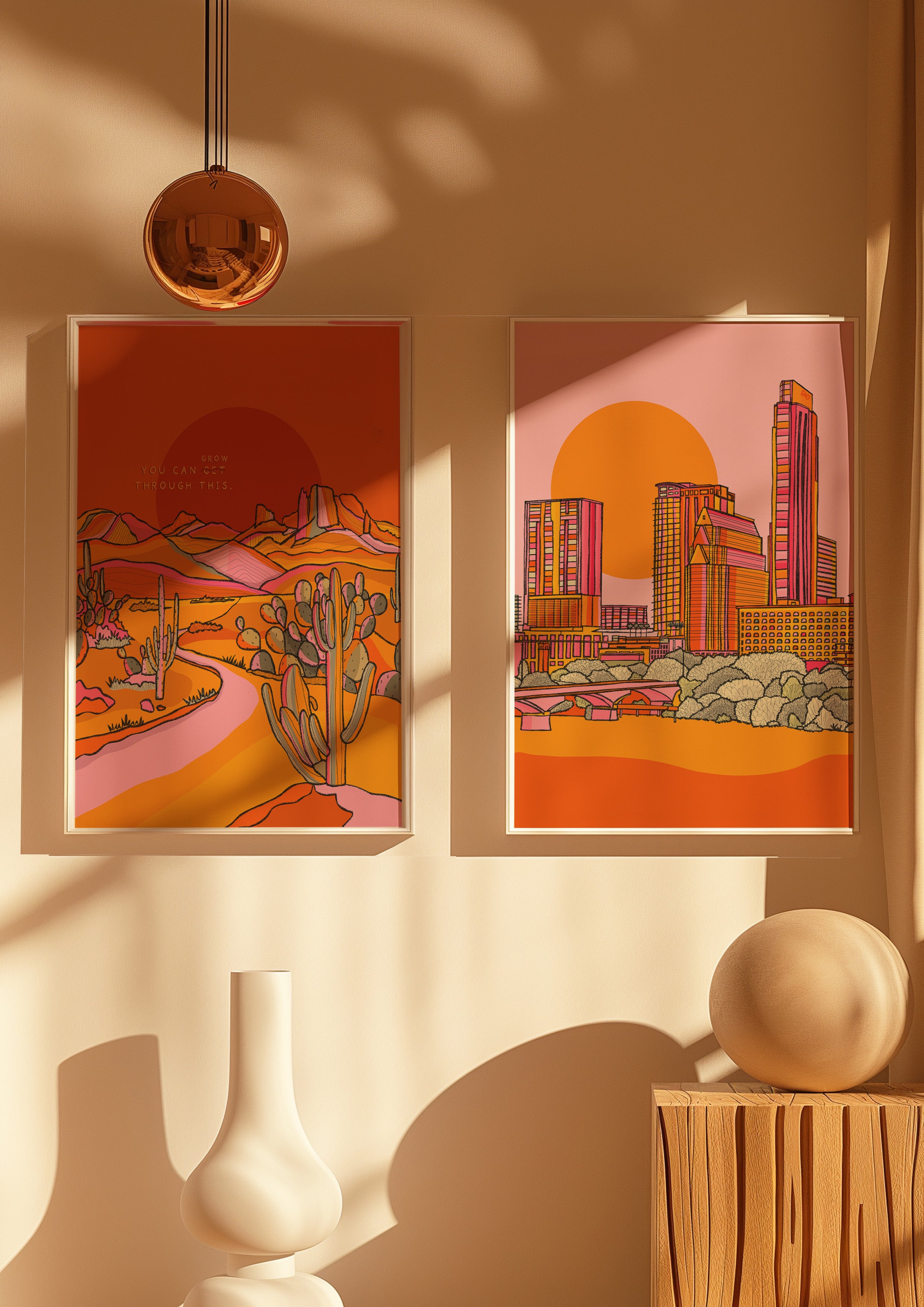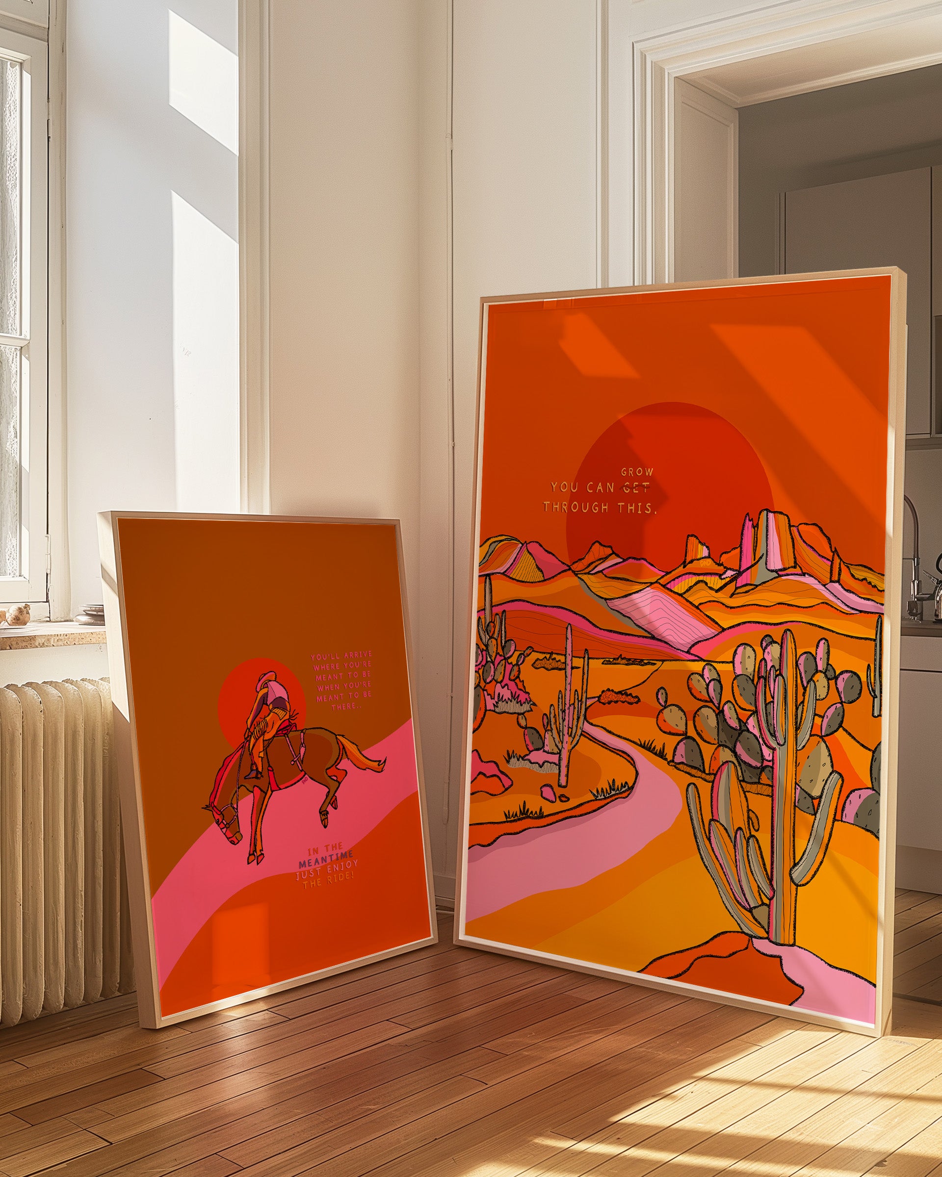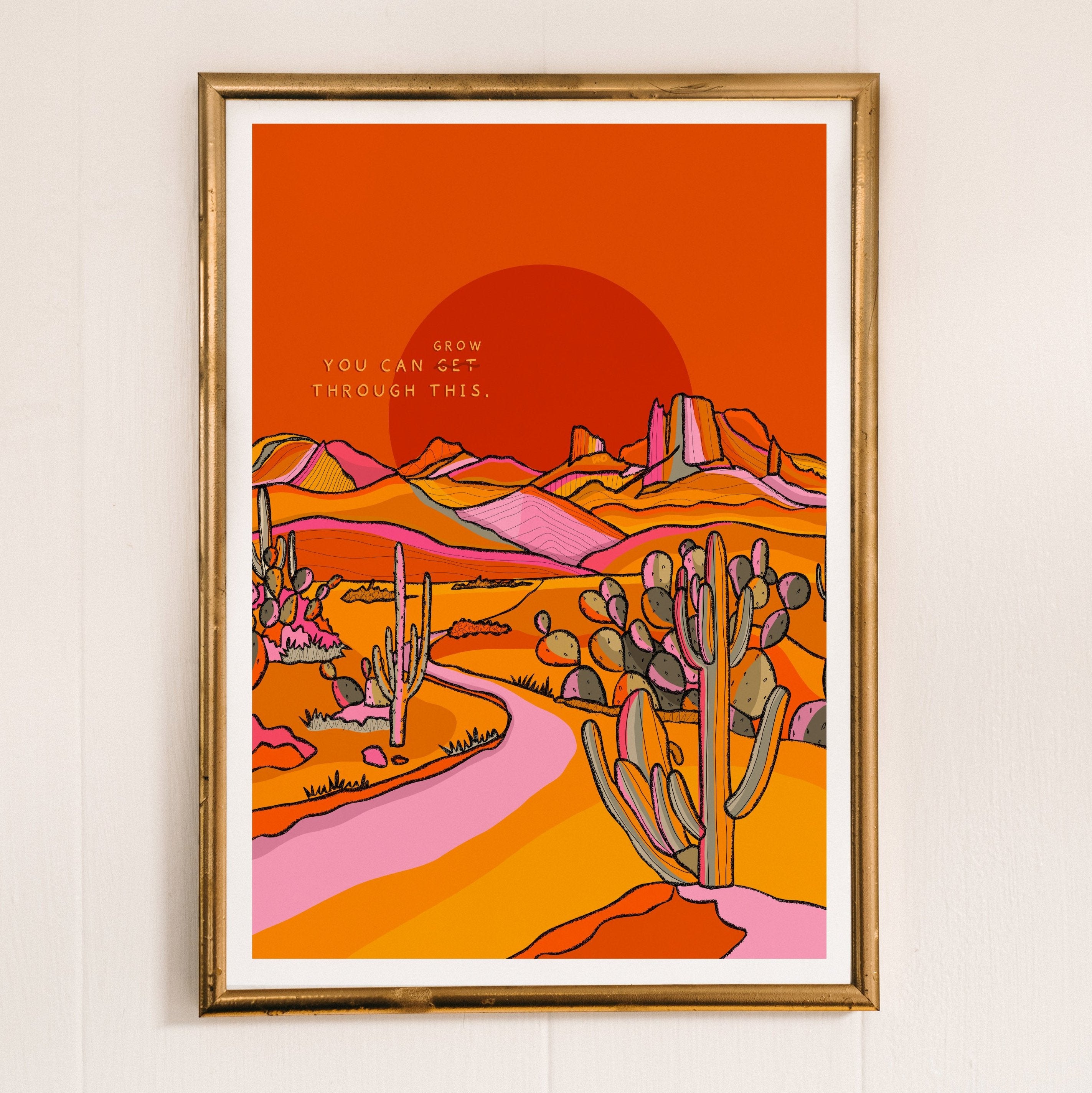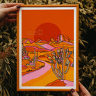 A vibrant positive quote art print of cacti in the Texas desert illustrated in warm pinks, greens, yellows, and oranges.
