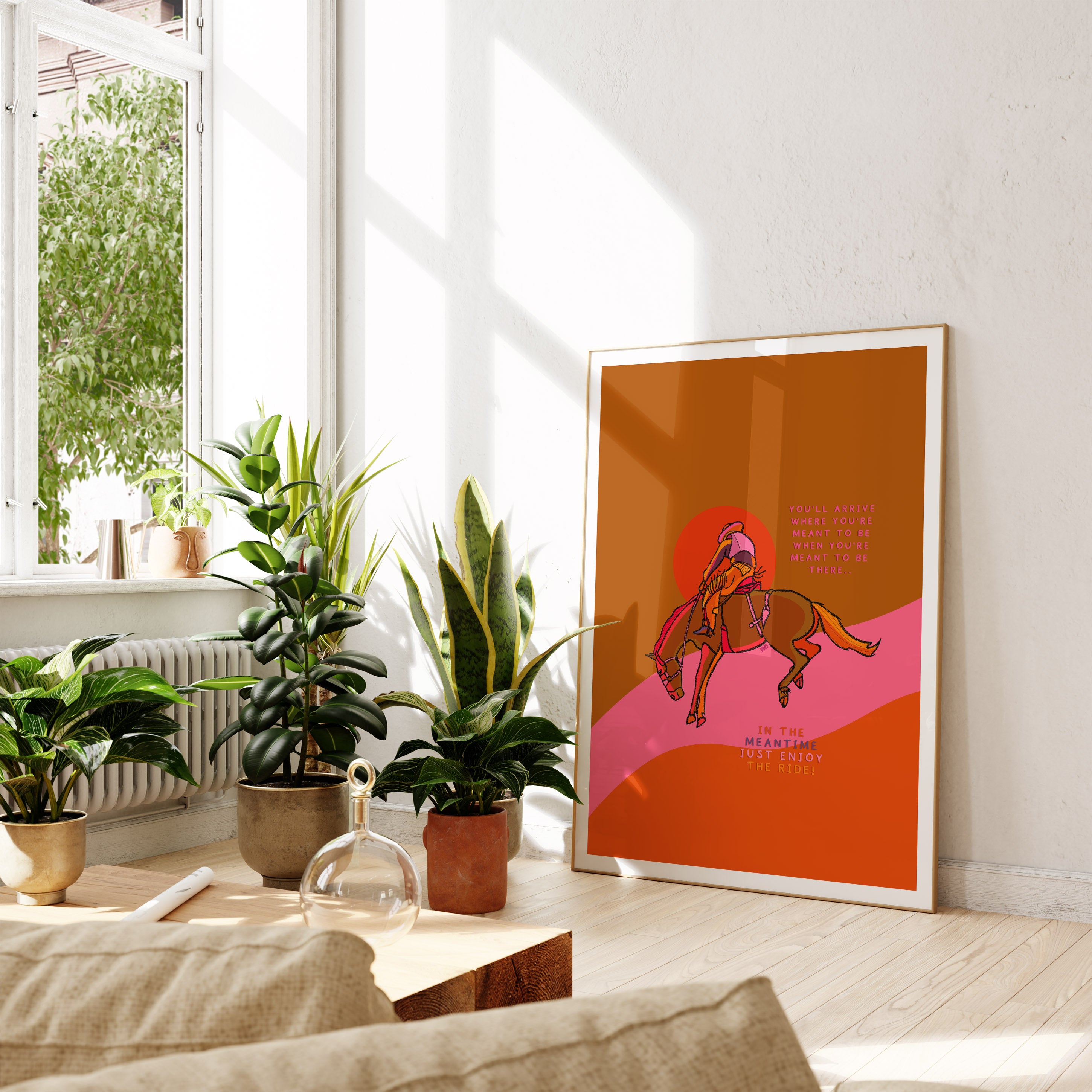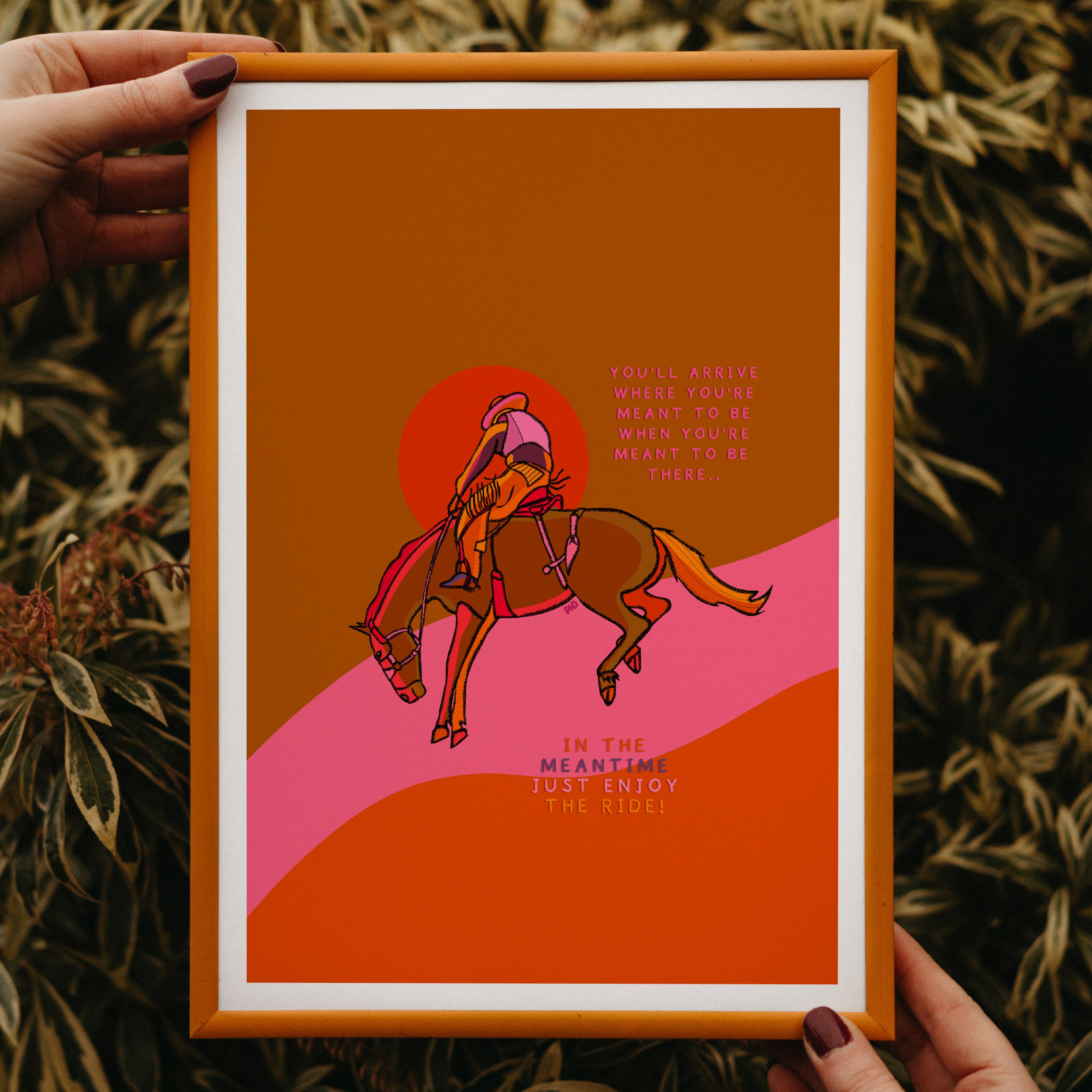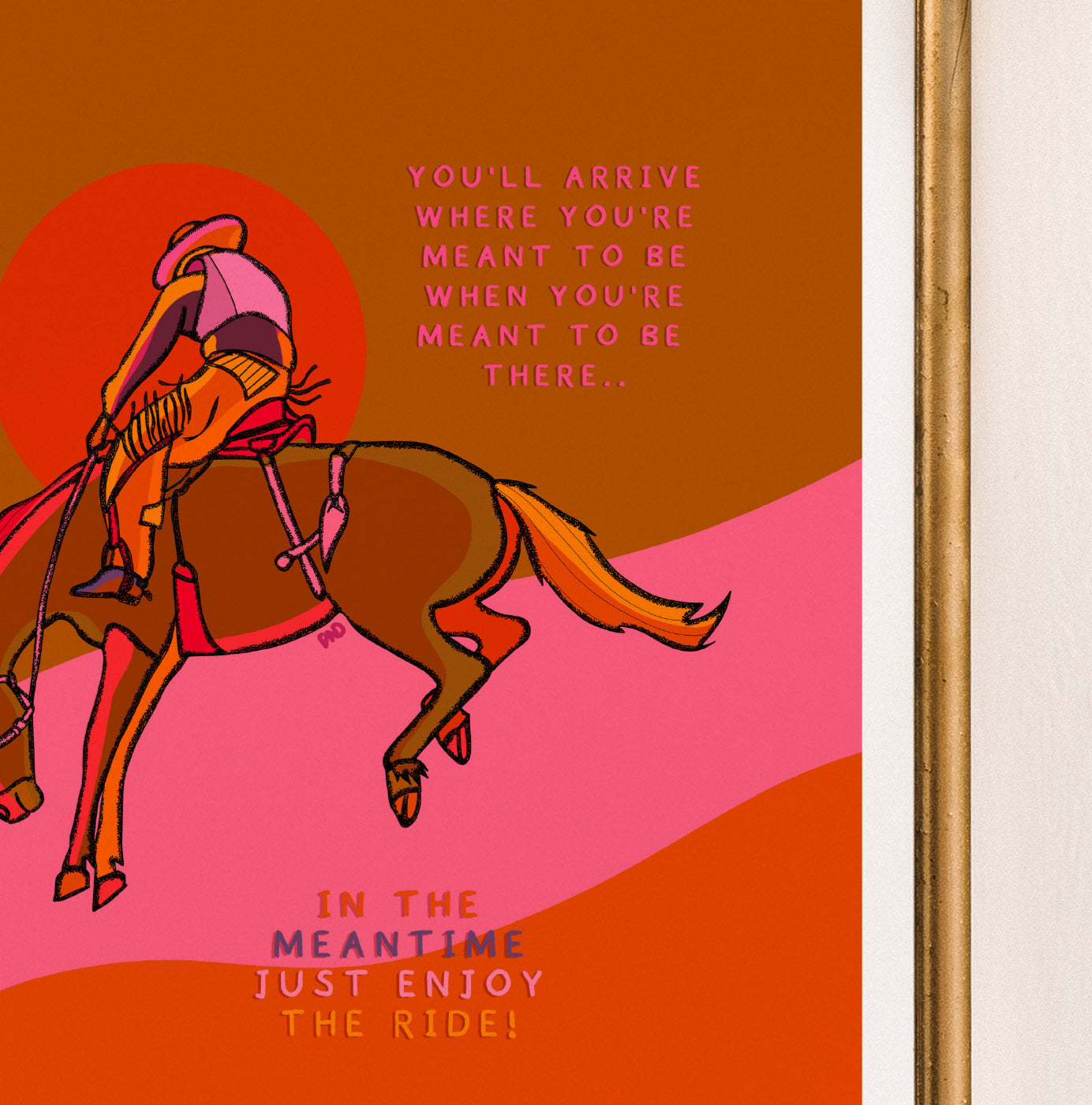 A vibrant positive quote art print of a cowboy riding his bucking horse is illustrated in warm pink, orange, yellow, and brown.
