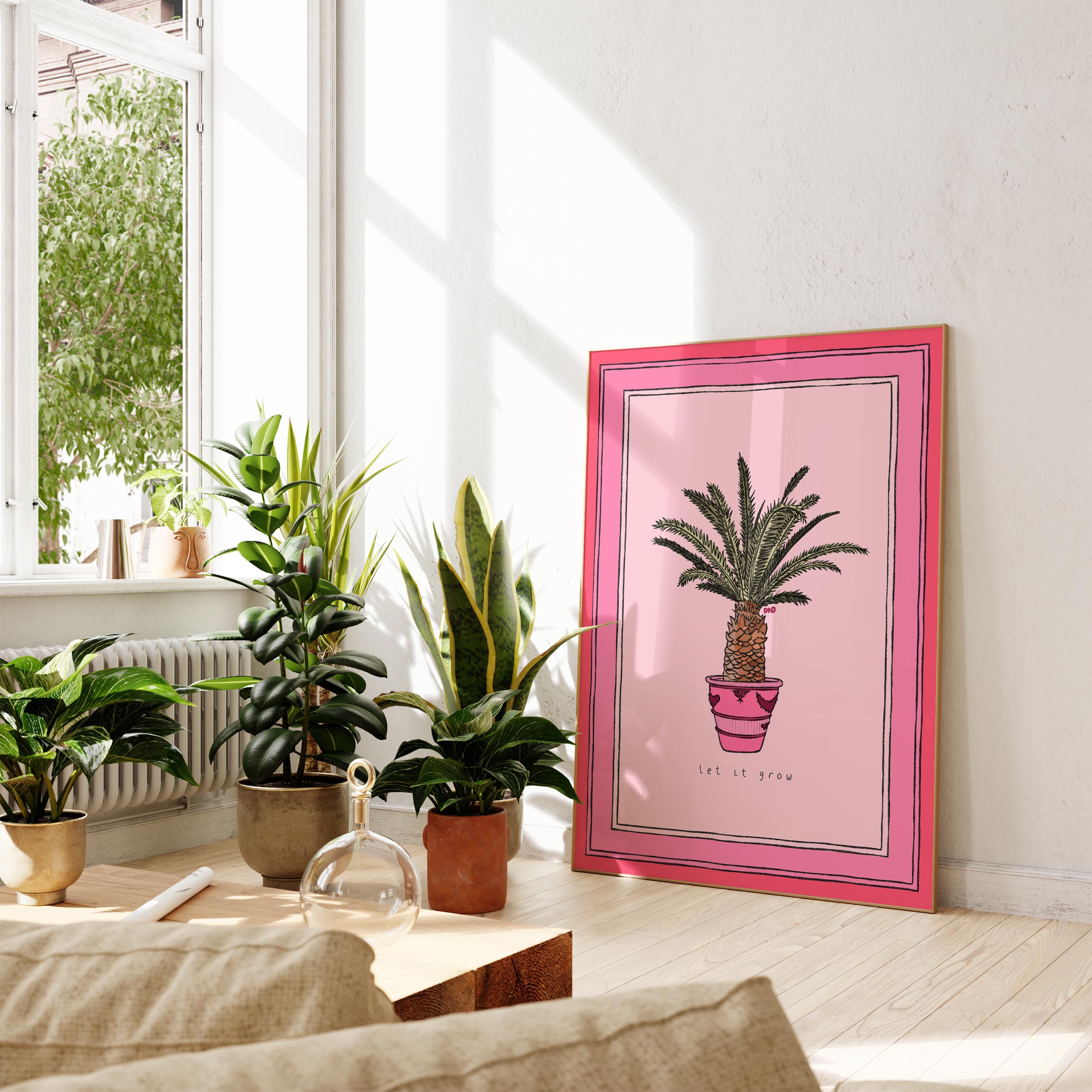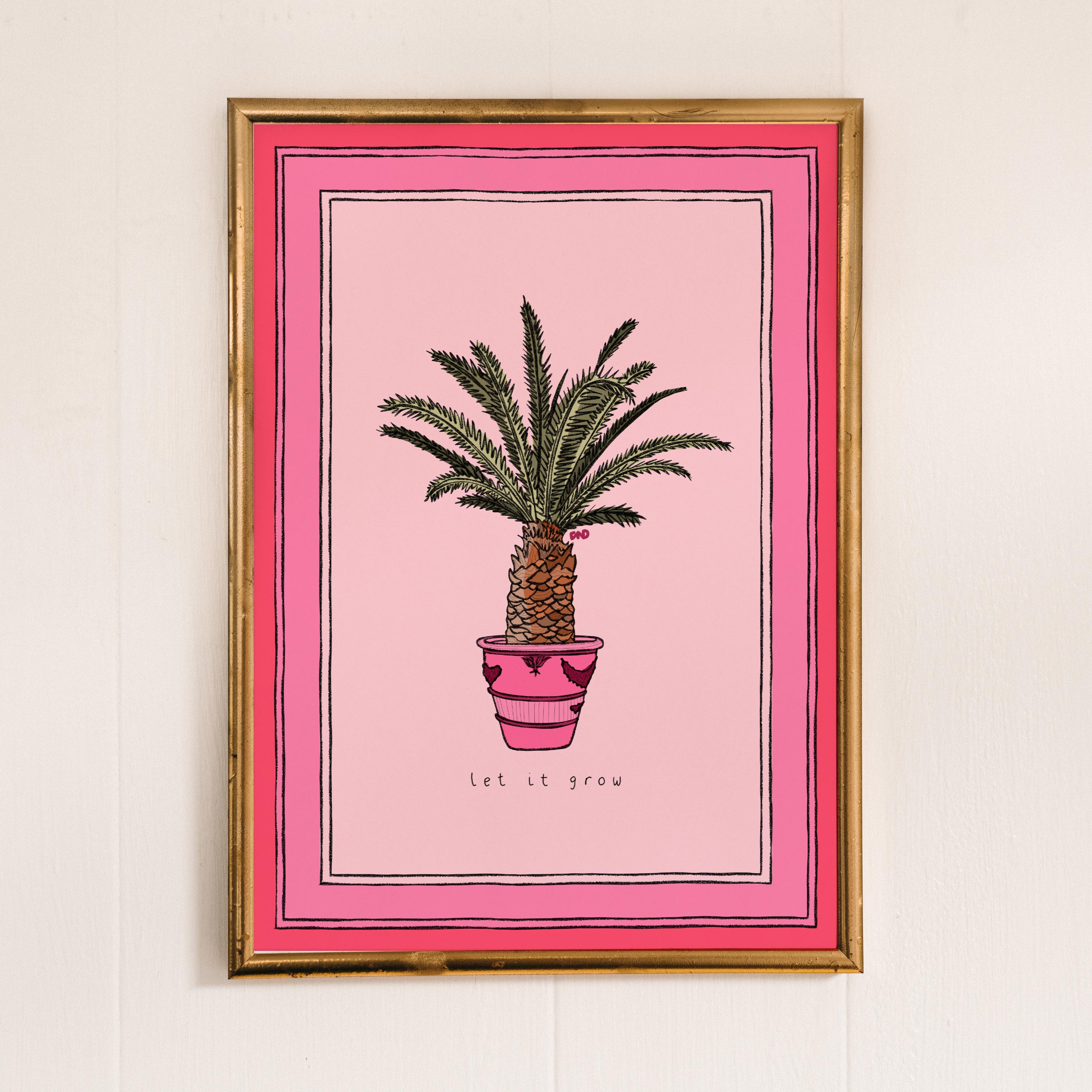 A vibrant pink art print of a potted palm tree with the quote 'let it grow'.