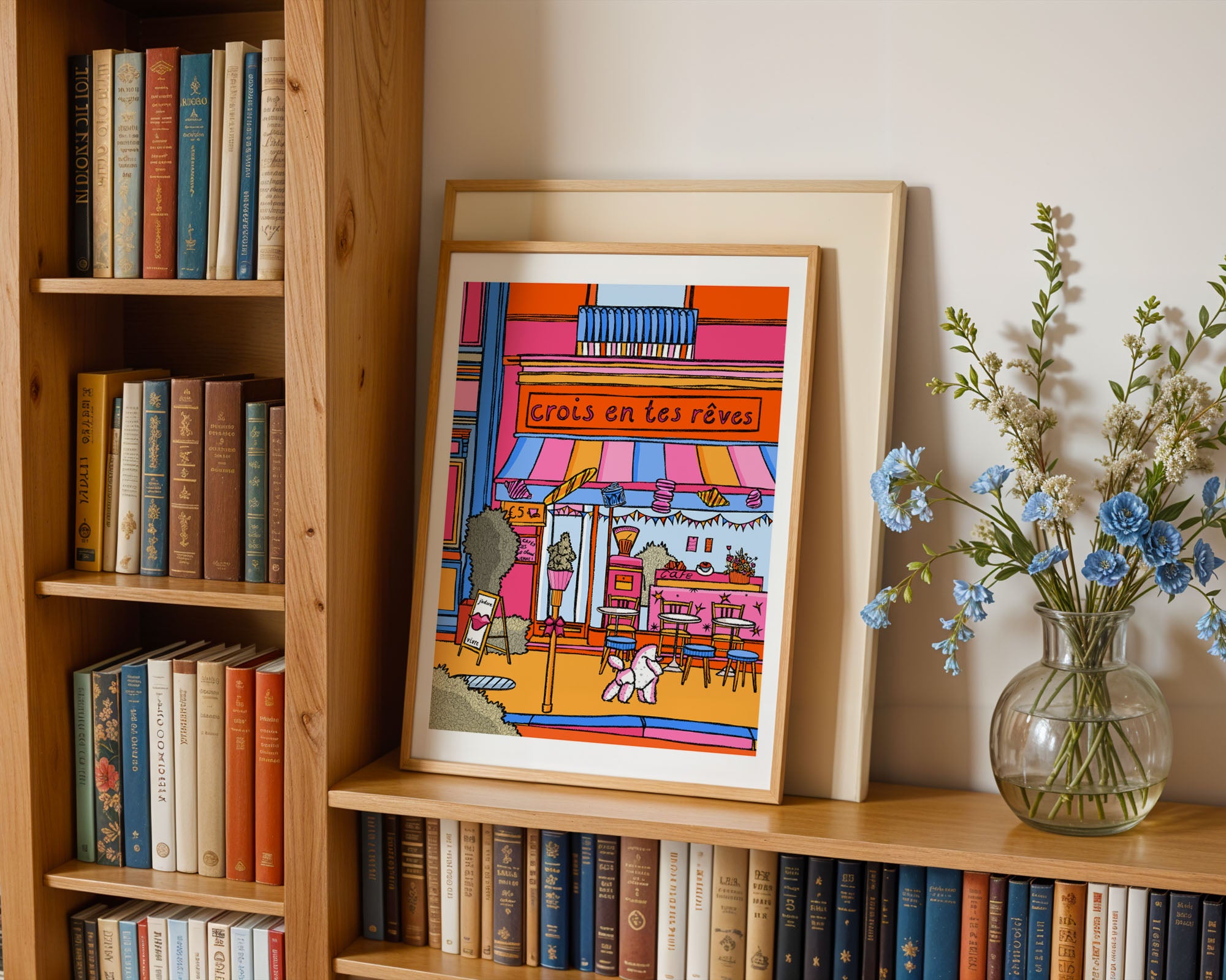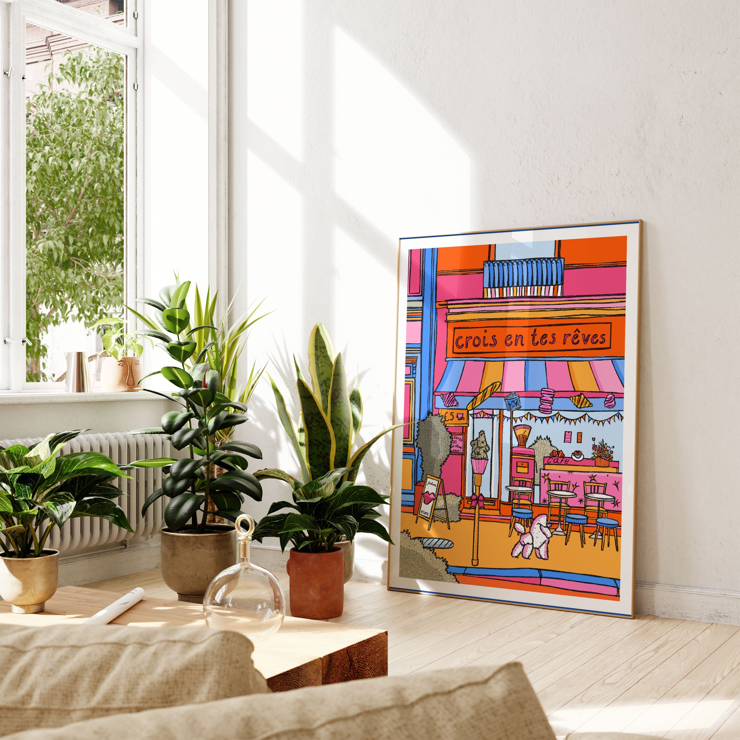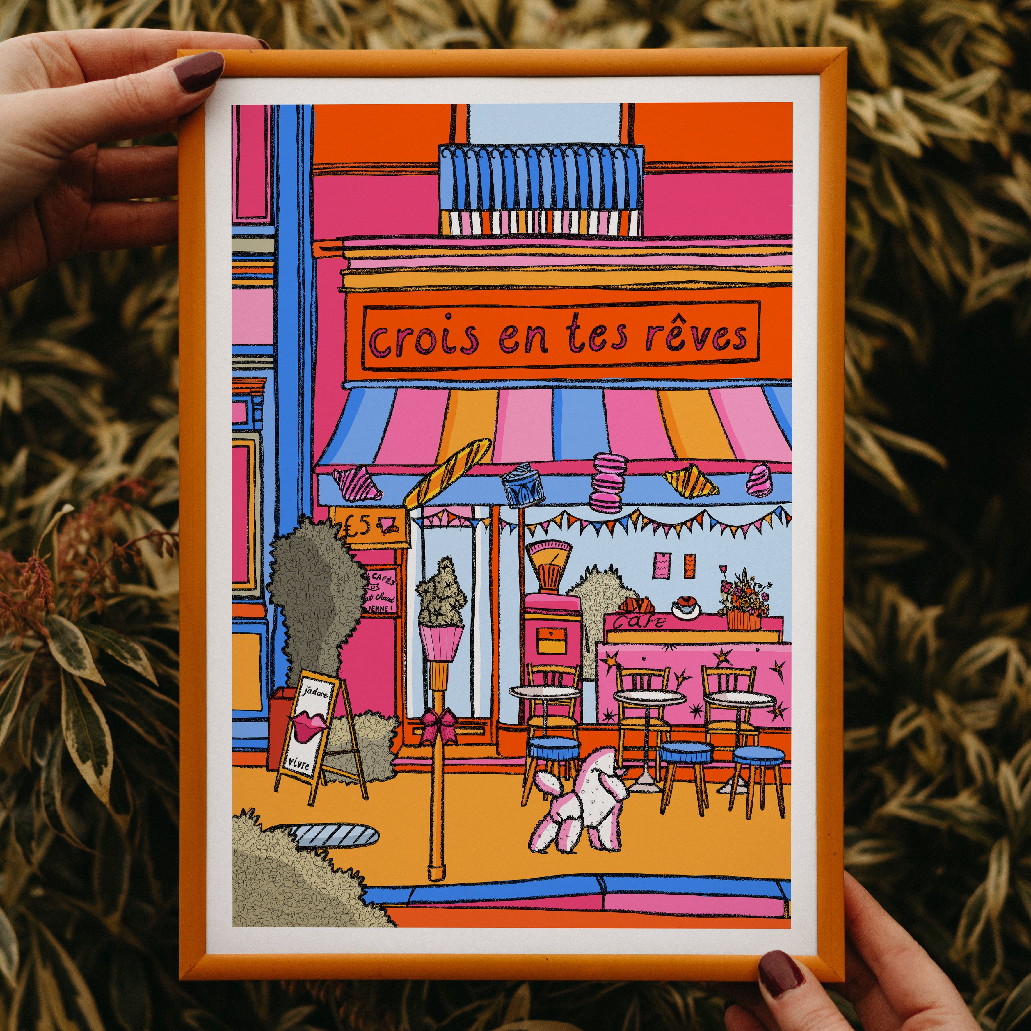 An original Parisian-inspired print of a bakery with the sign 'Crois en tes rêves” that translates to “Believe in your dreams”. Illustrated in bright pinks, oranges, blues, and yellows.