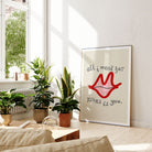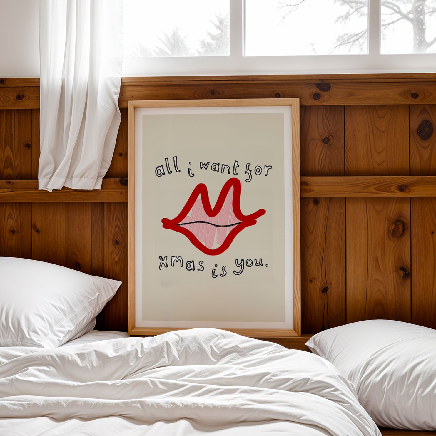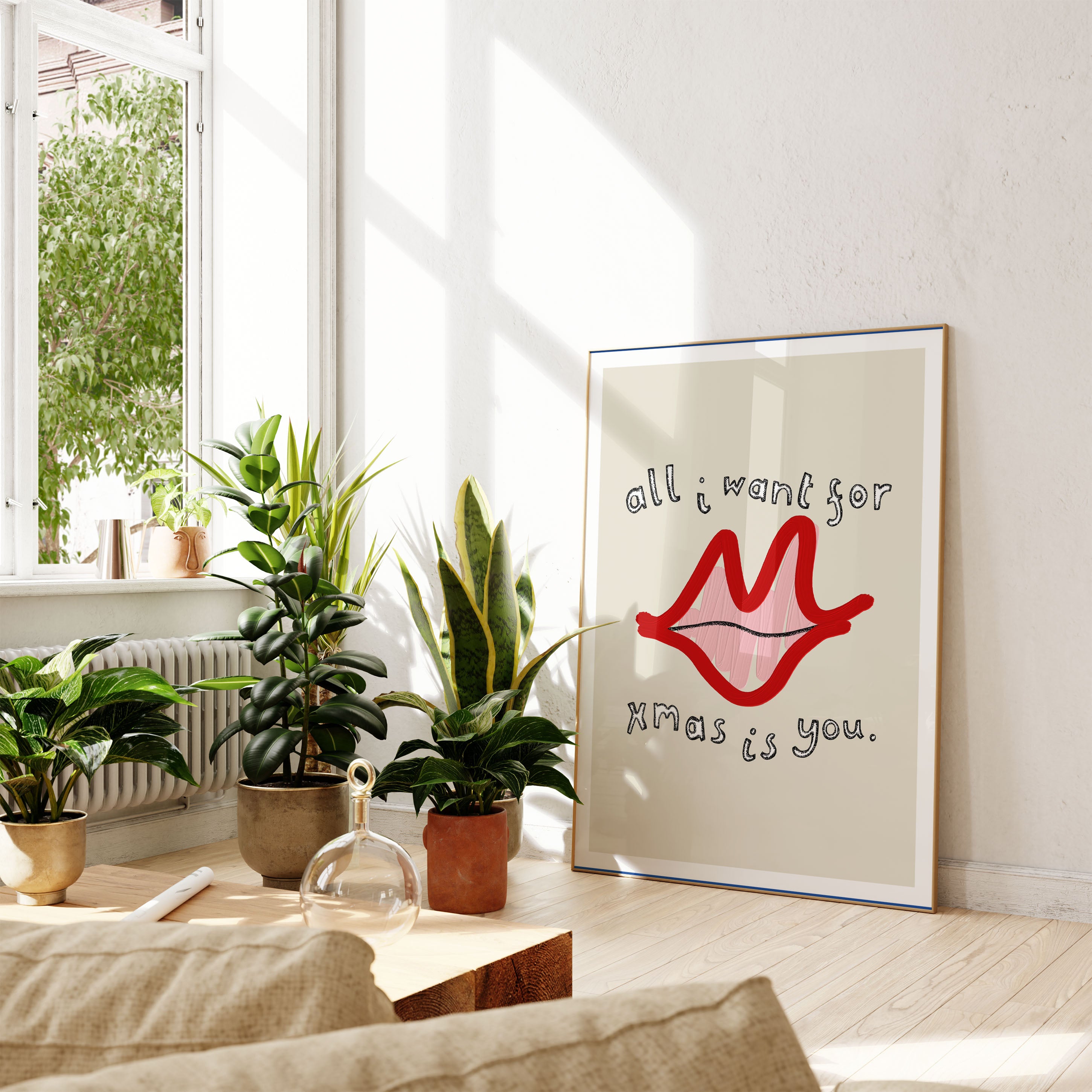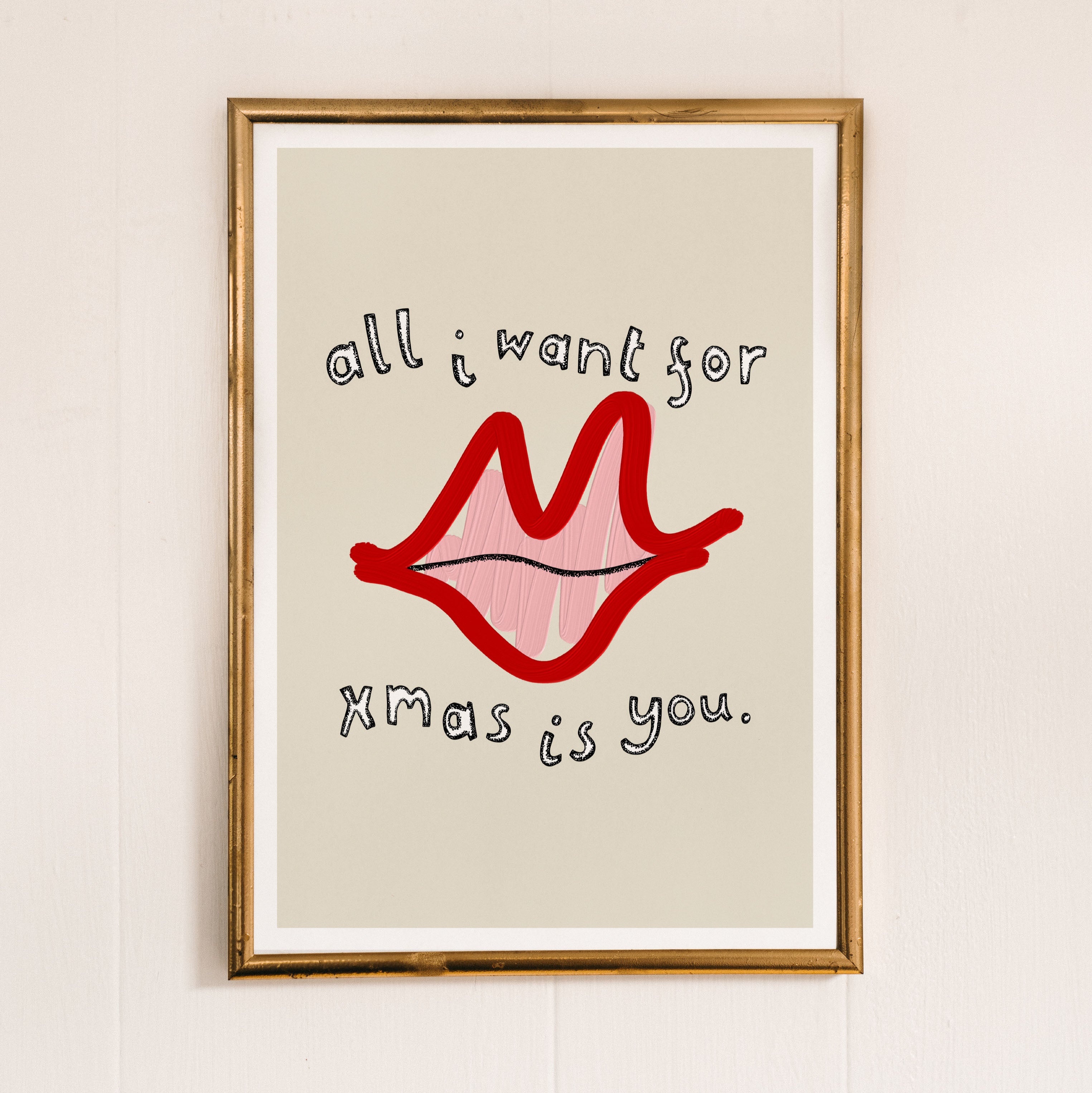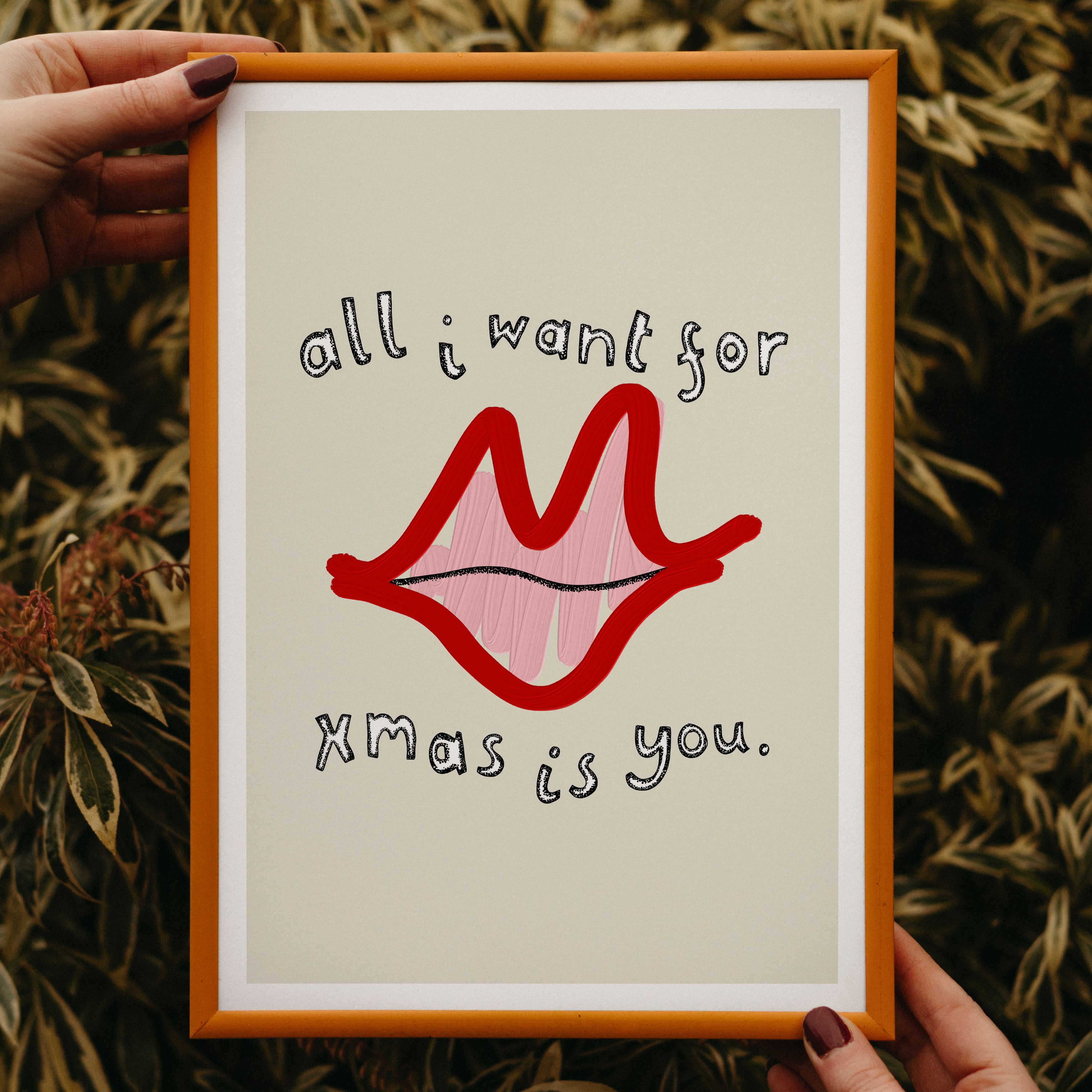 A hand-painted mixed media print of a pair of bright red lips with the text 'all I want for xmas is you' . Illustrated in red, pink, beige, and black.