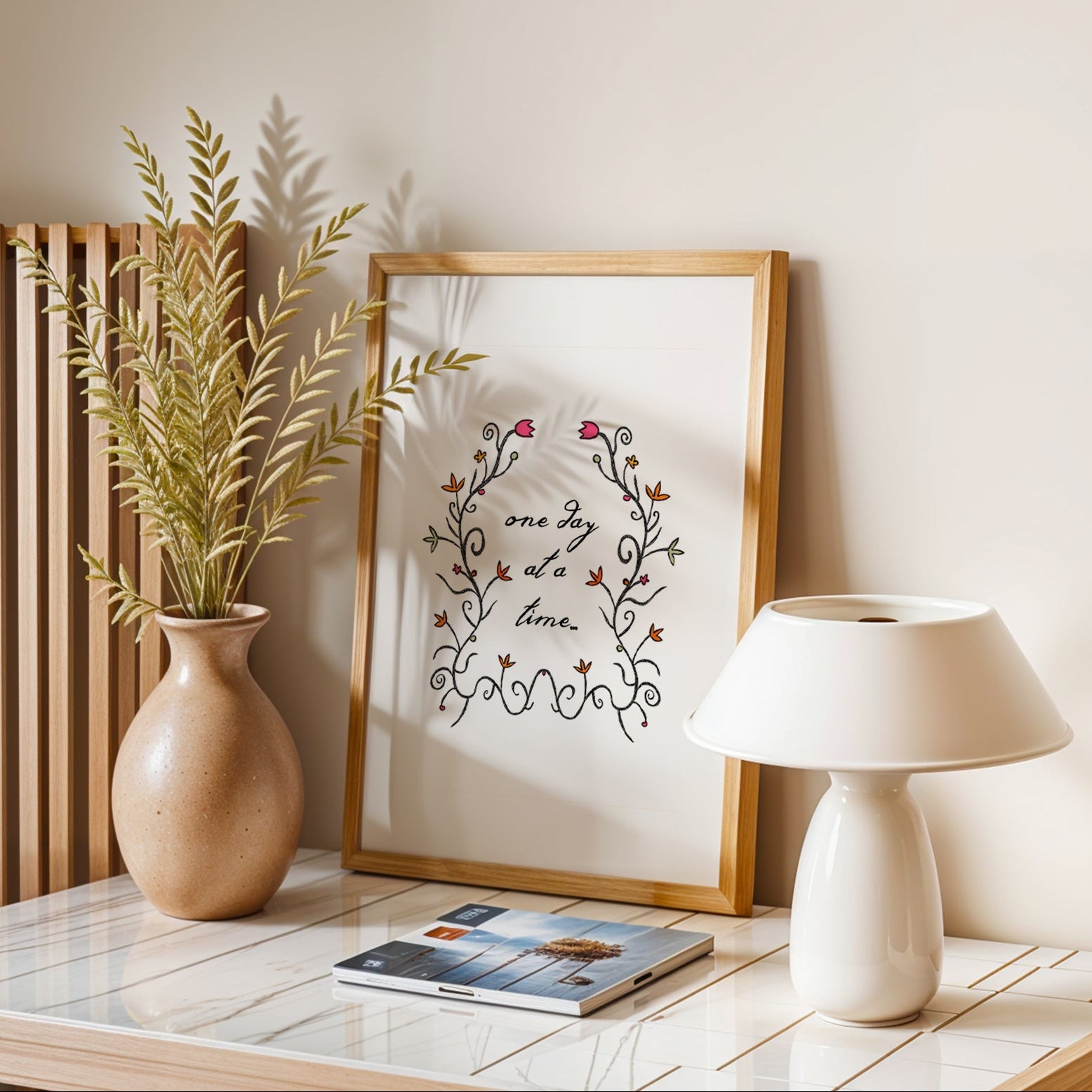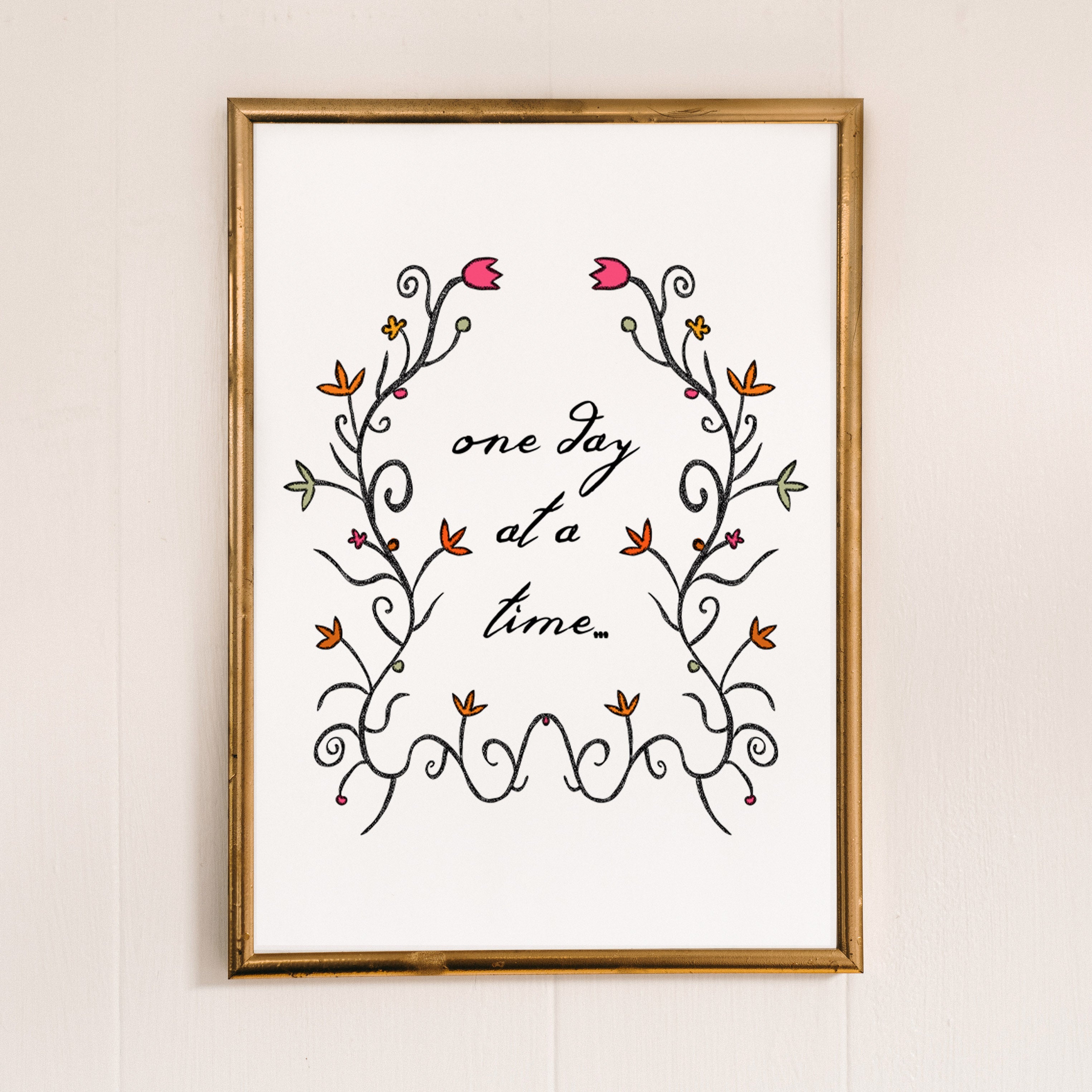 Take things one day at a time with this gentle, hand-drawn inspirational art print. Featuring delicate floral illustrations framing the handwritten quote 'one day at a time...', this artwork offers calm reassurance, hope, and encouragement, perfect for moments of healing, growth, or reflection.