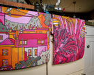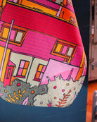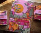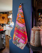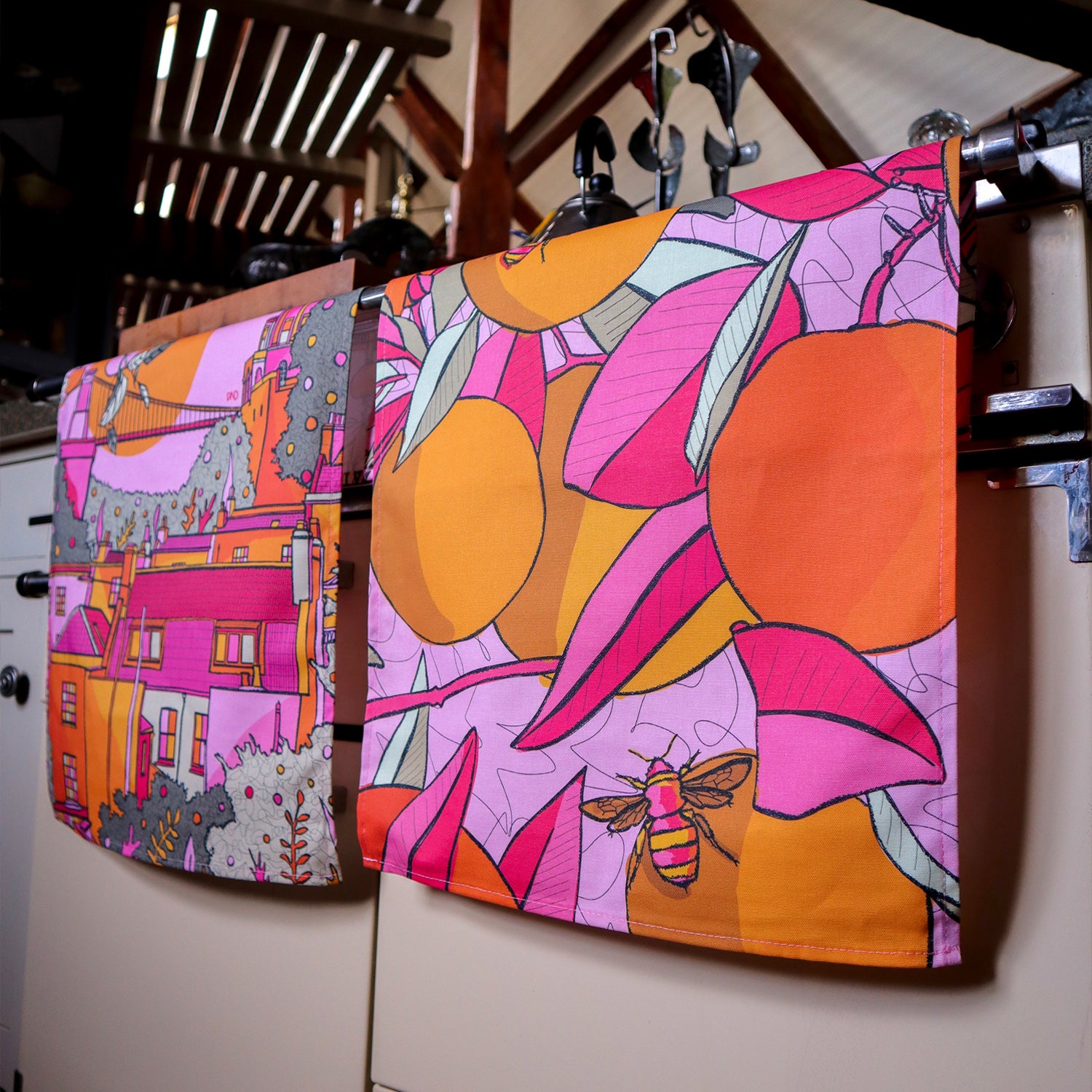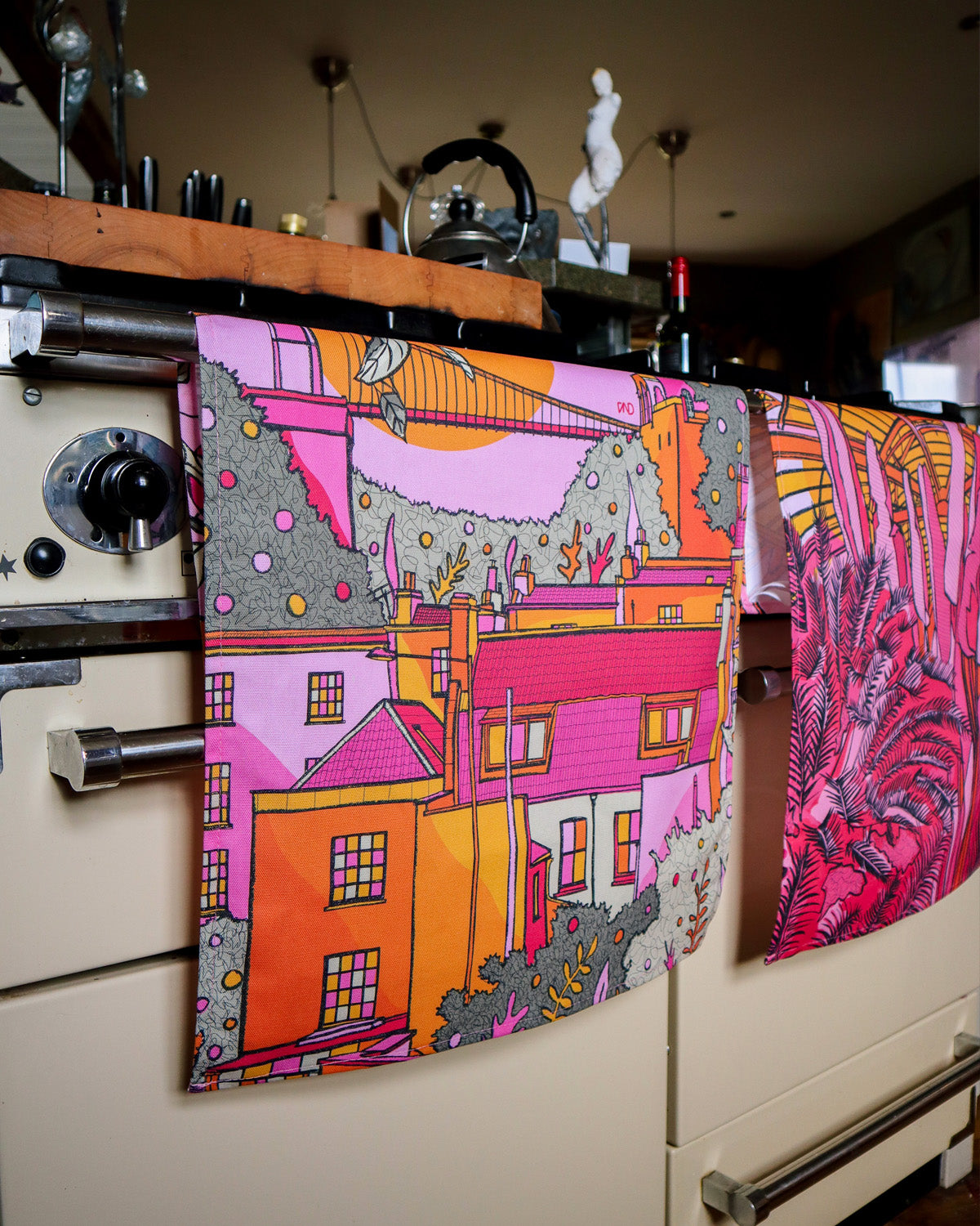 A vibrant tea towel of my Bristol suspension bridge artwork illustrated in bright pinks, greens, and oranges.