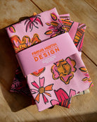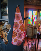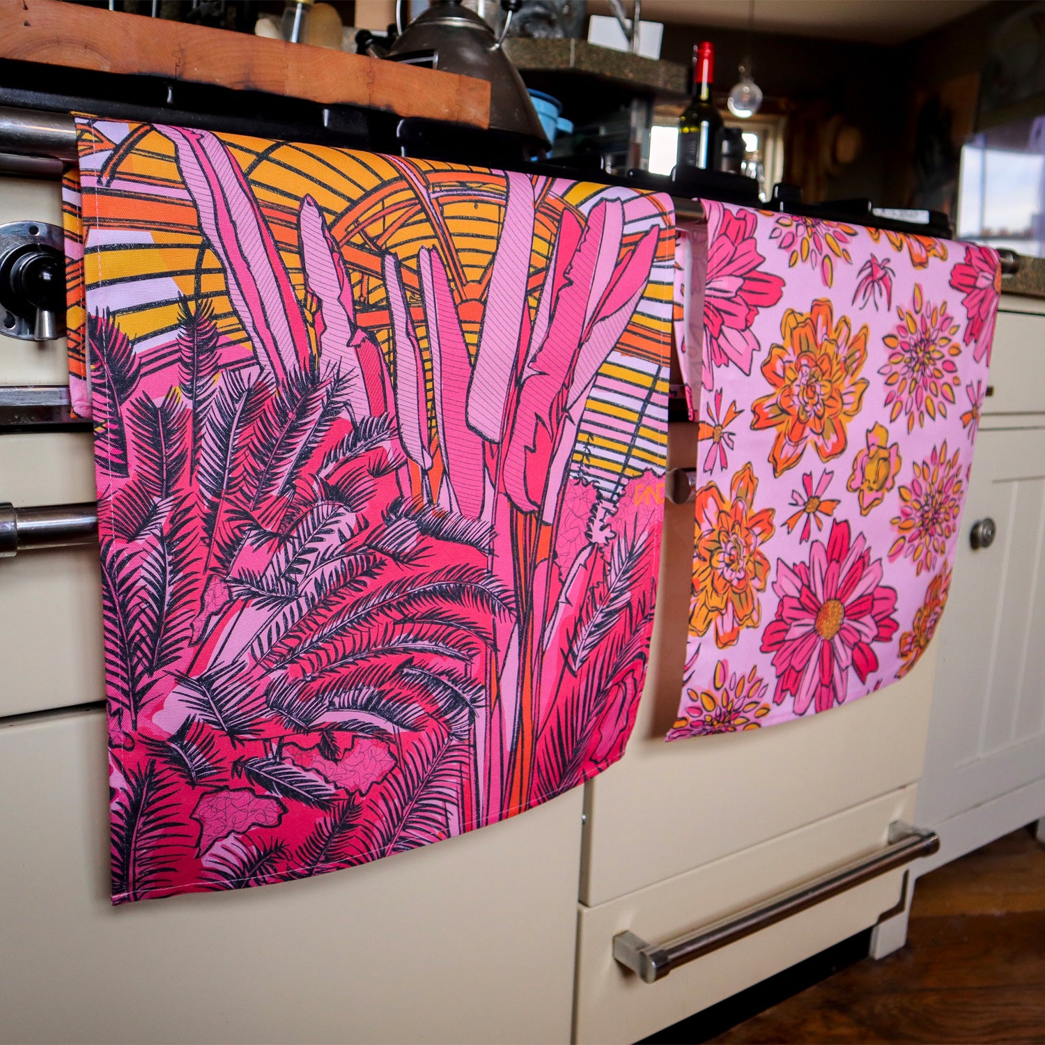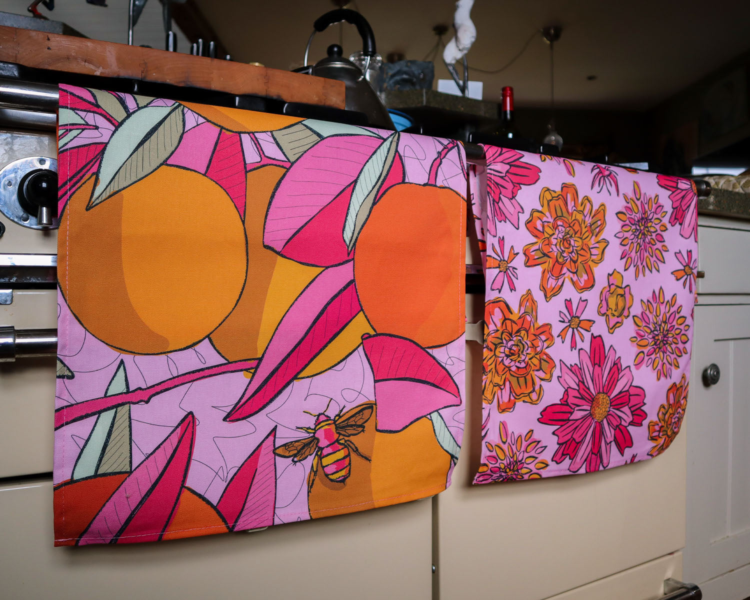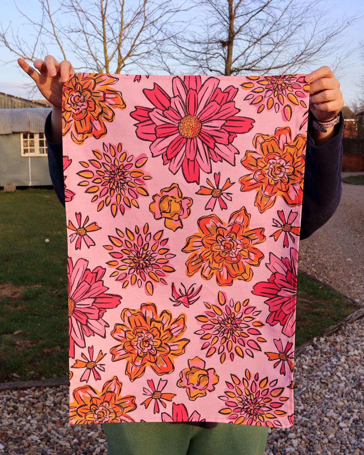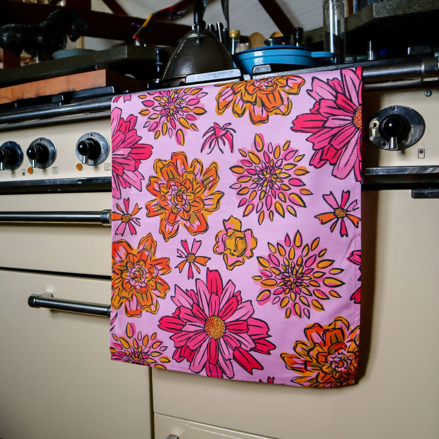 A vibrant tea towel of my bold floral pattern illustrated in bright pinks and oranges.