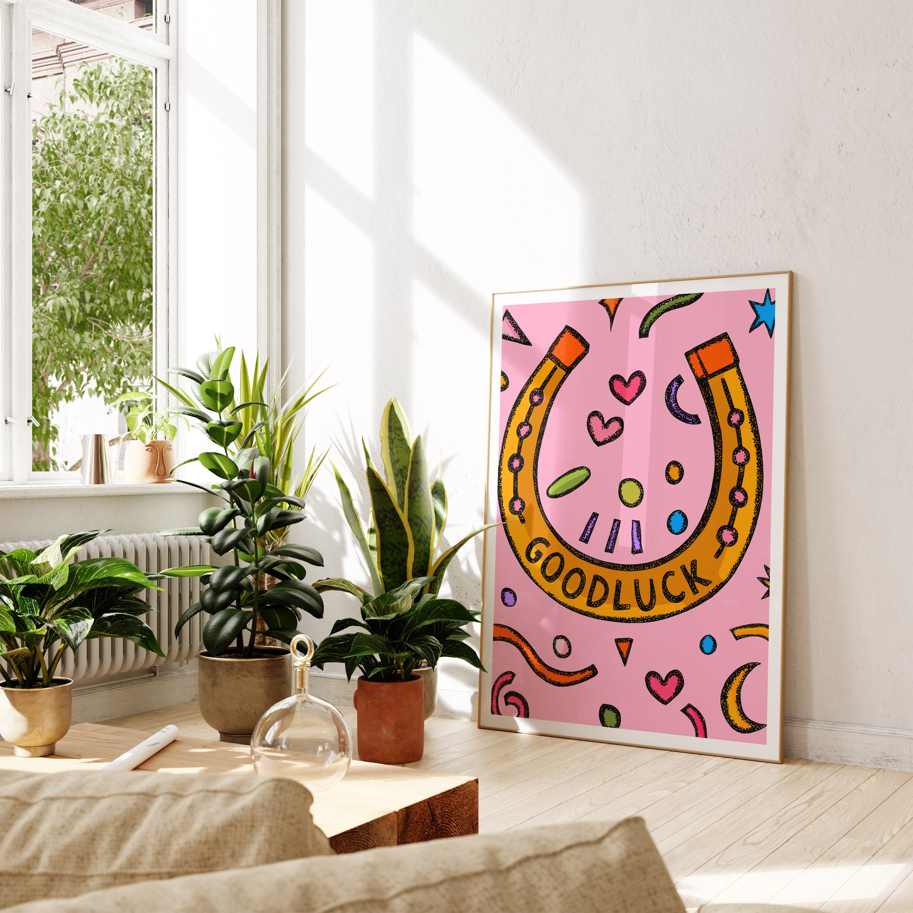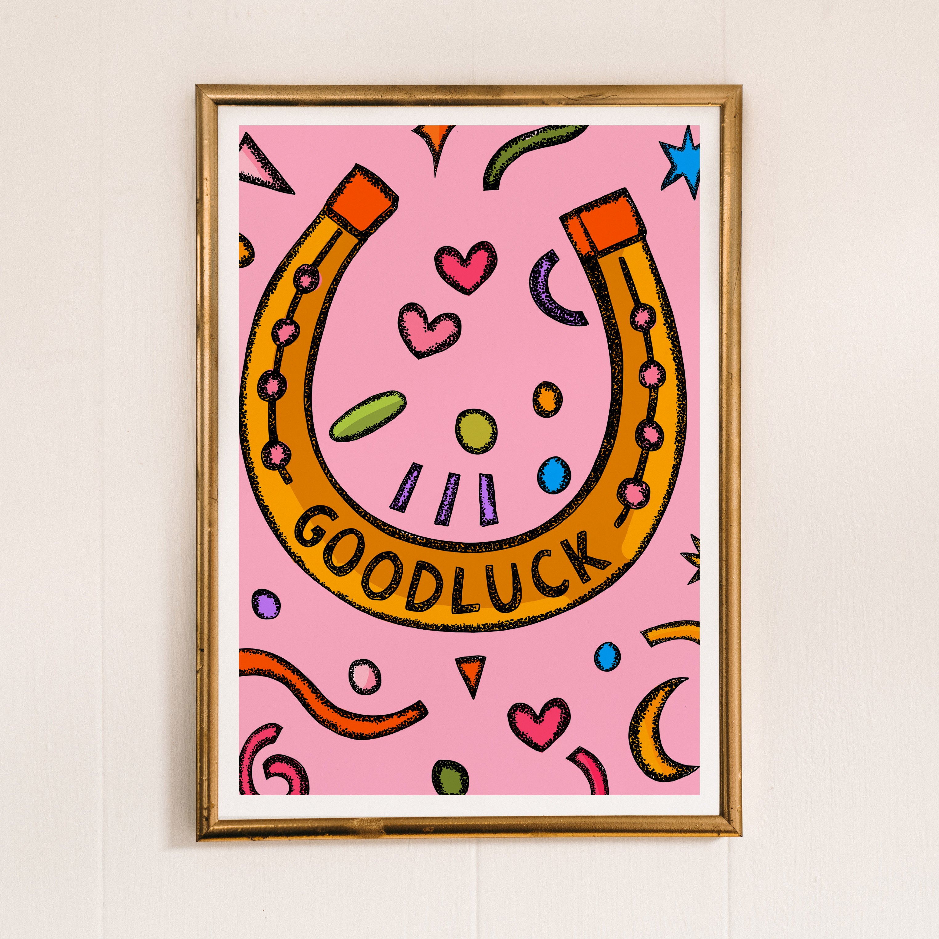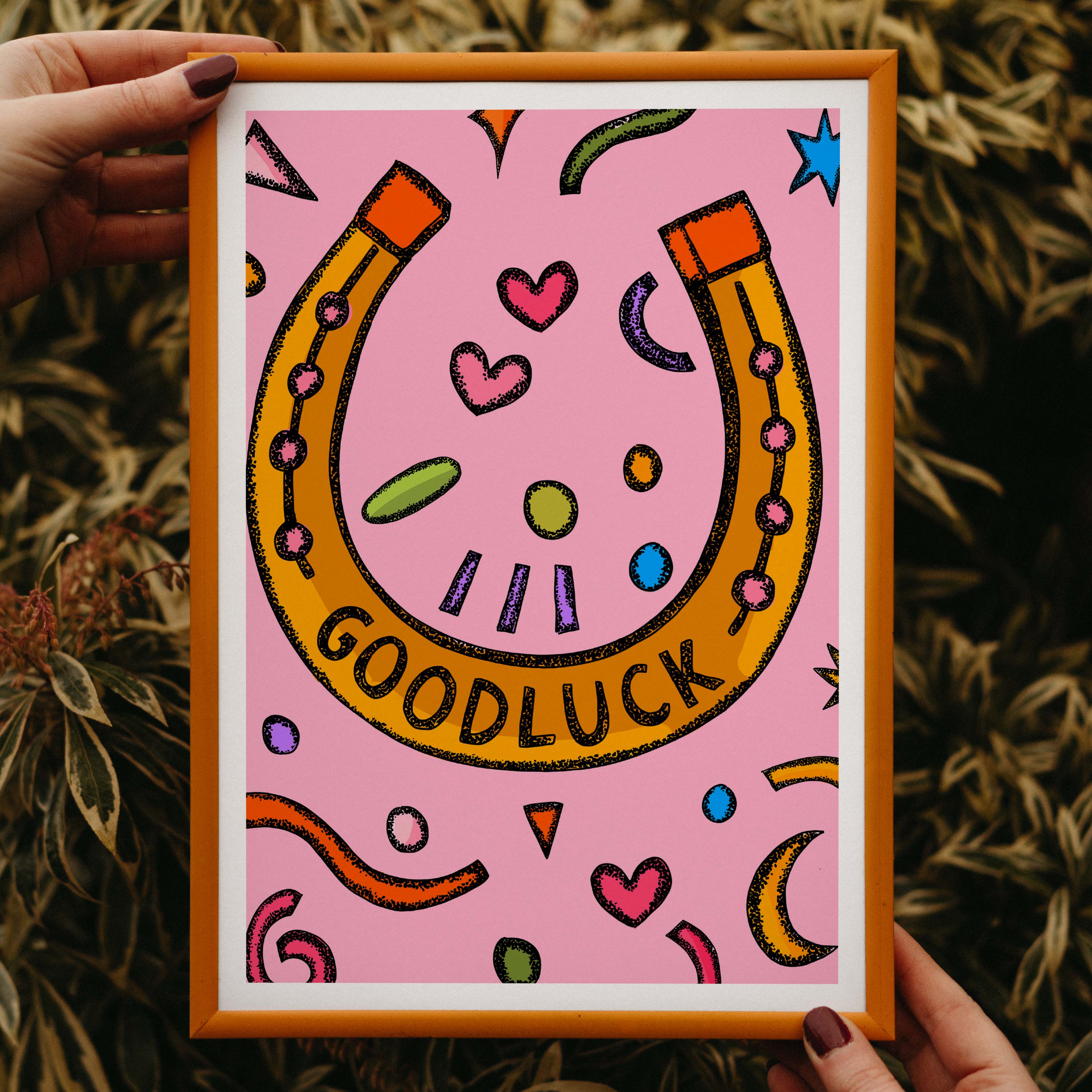 A vibrant positive quote art print of a lucky horse shoe is illustrated in bright pink, blue, orange, yellow, and green.