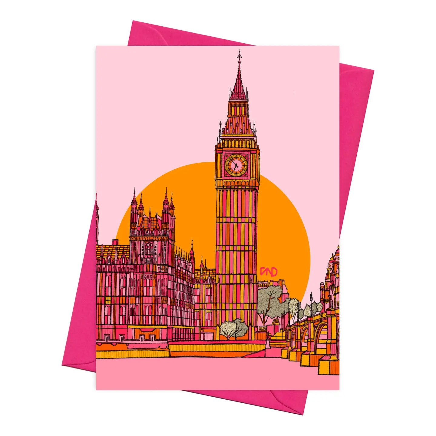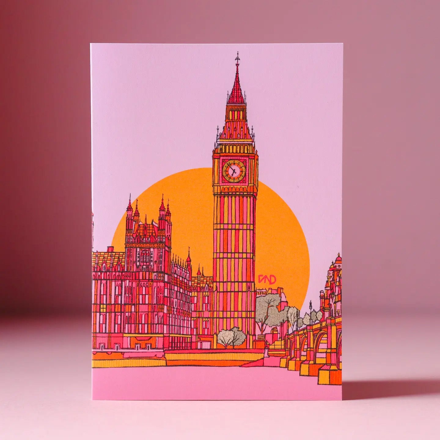 This colourful greeting card features my original artwork of Big Ben. Illustrated in pink, orange, green, and yellow.