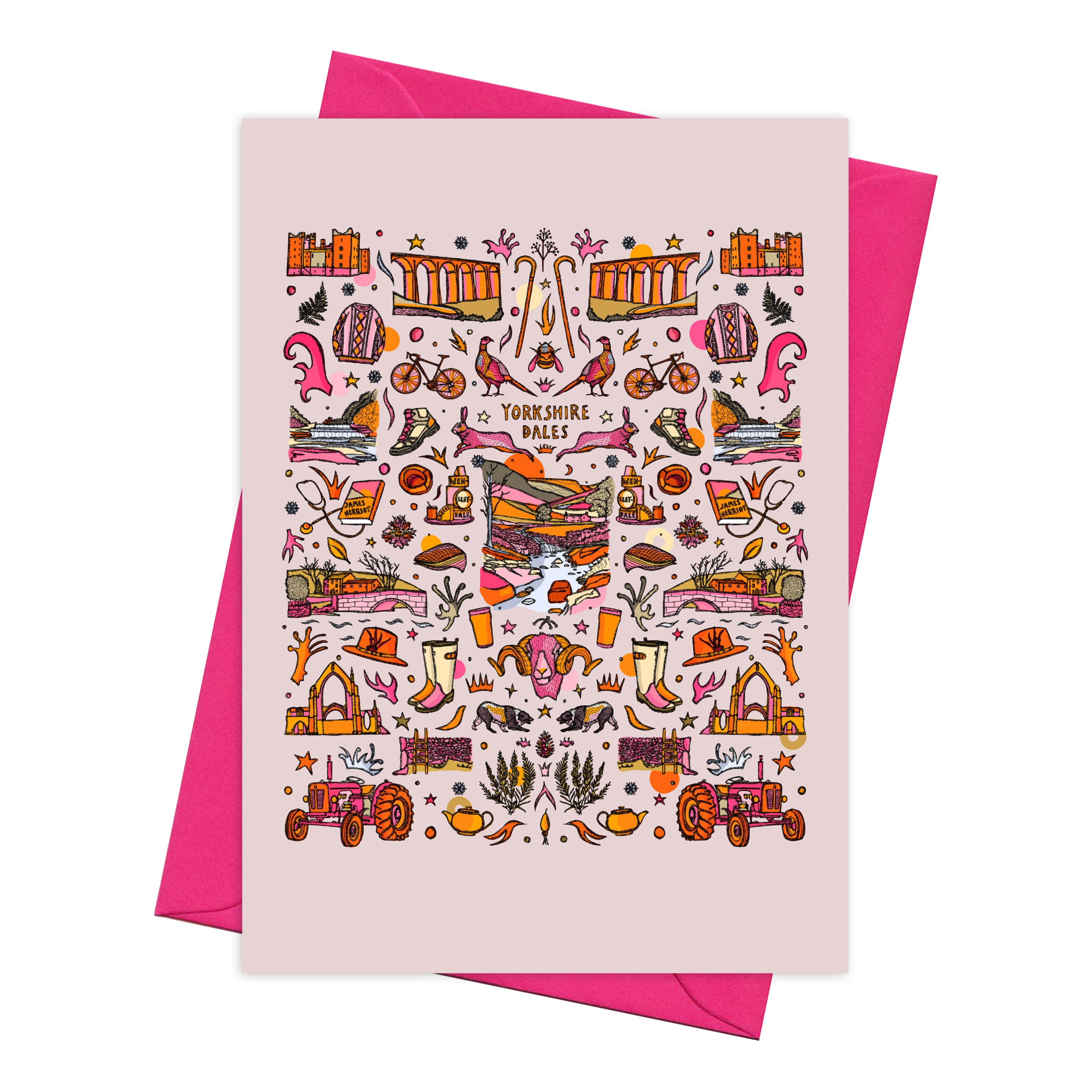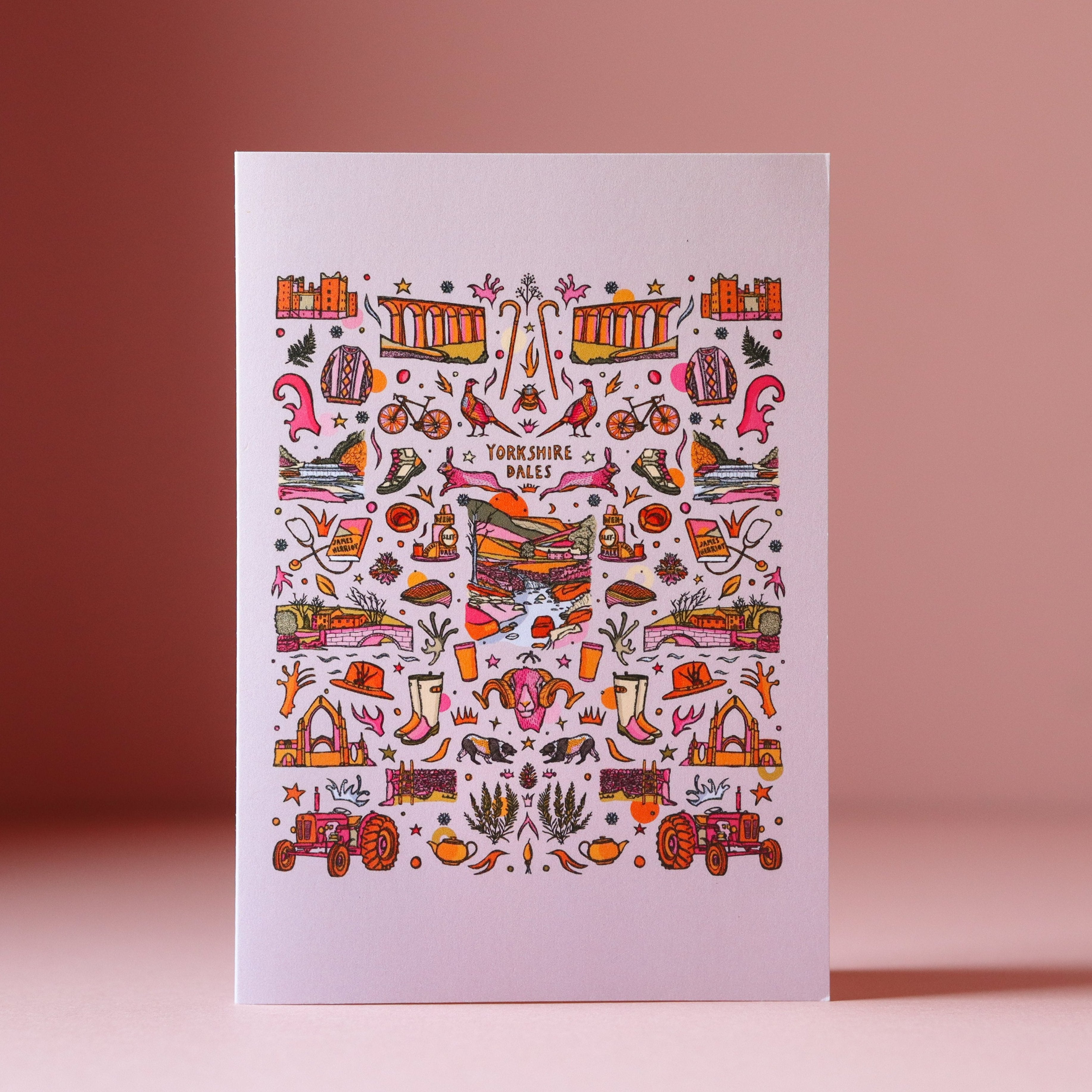This colourful greeting card features my original artwork of the Yorkshire Dales it includes tractors, pheasants, the Ribble head viaduct, and Malham Cove. Illustrated in beige, pink, green, and orange.