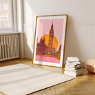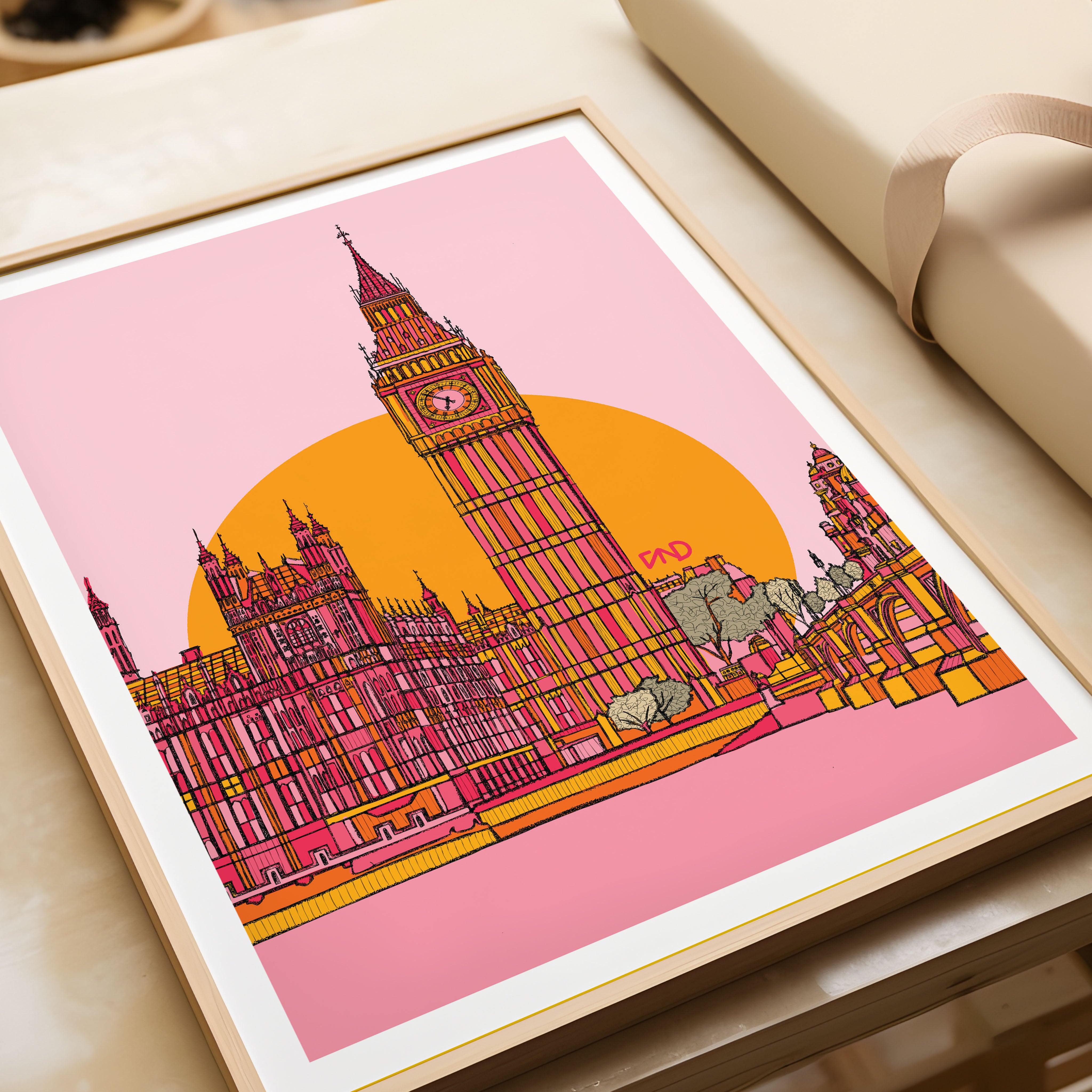 A vibrant art print of big Ben and the houses of parliament in London, illustrated in bright pinks and oranges.