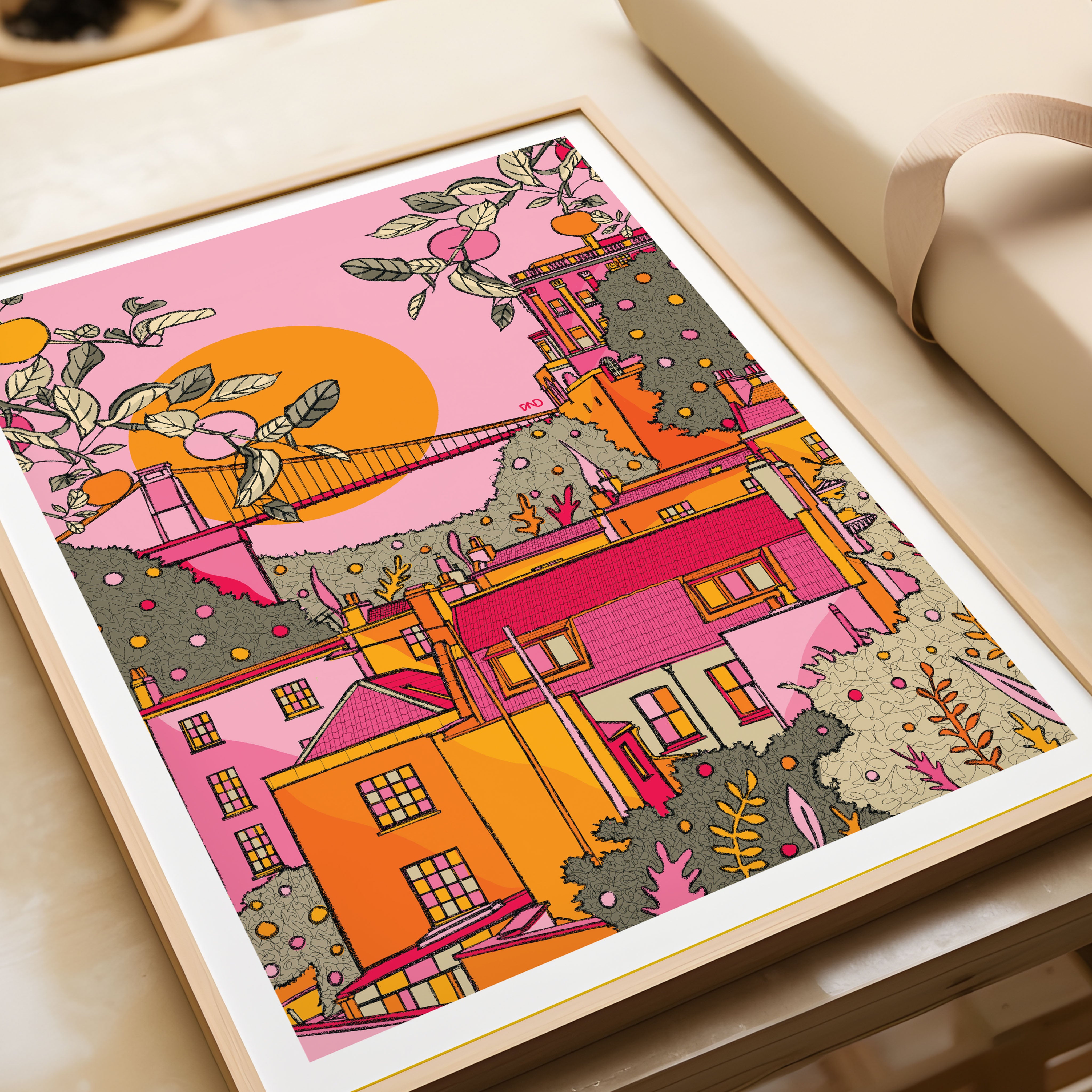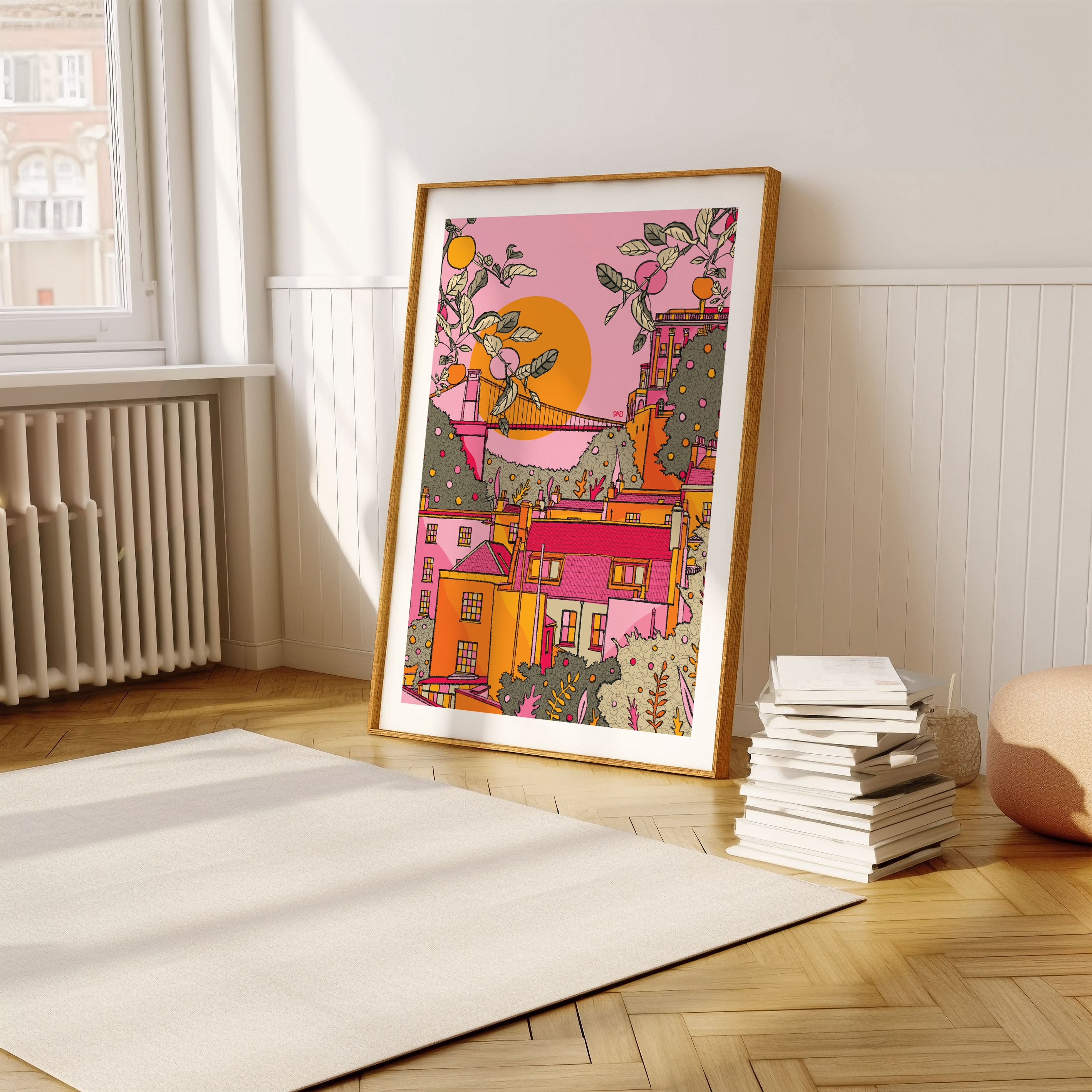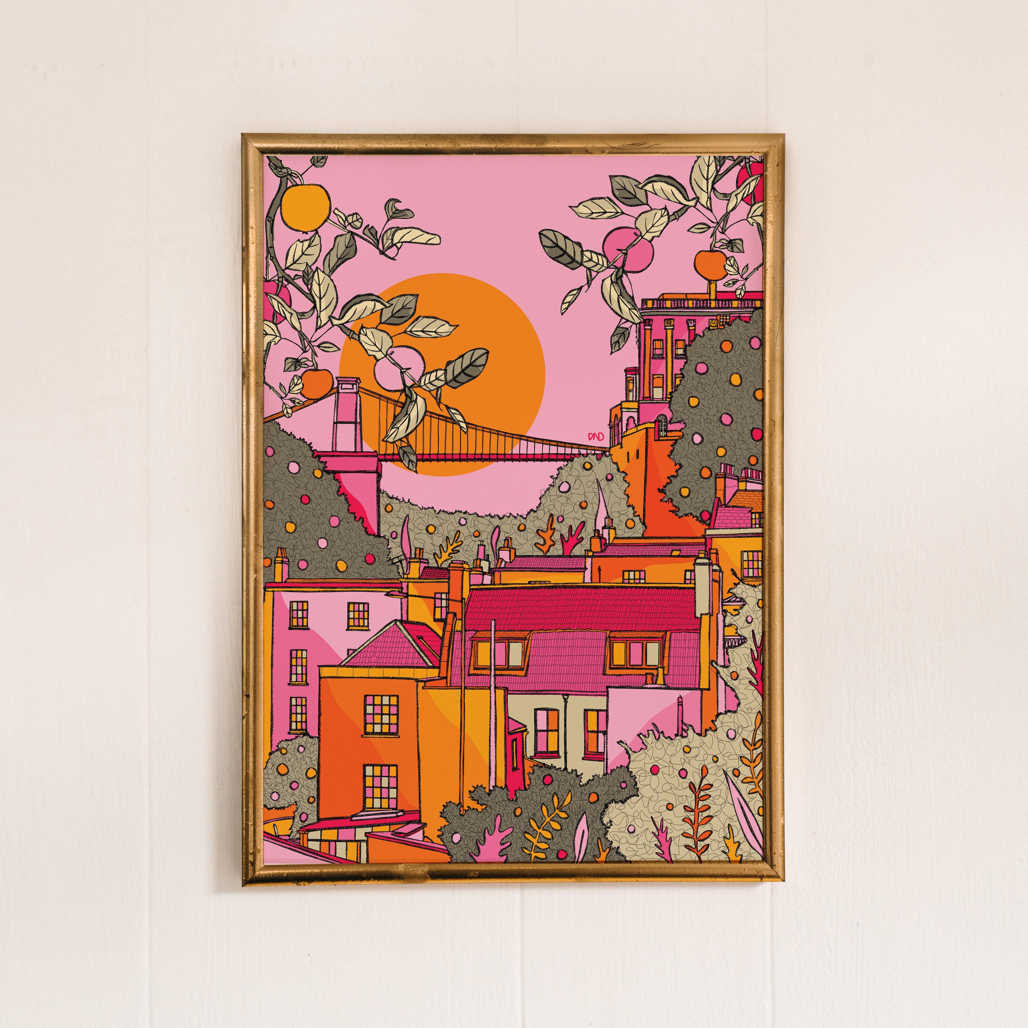 A vibrant art print of Bristol with the Clifton suspension bridge in the background is illustrated in bright pinks, greens, and oranges.