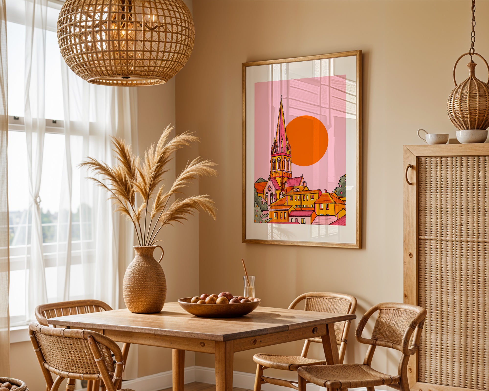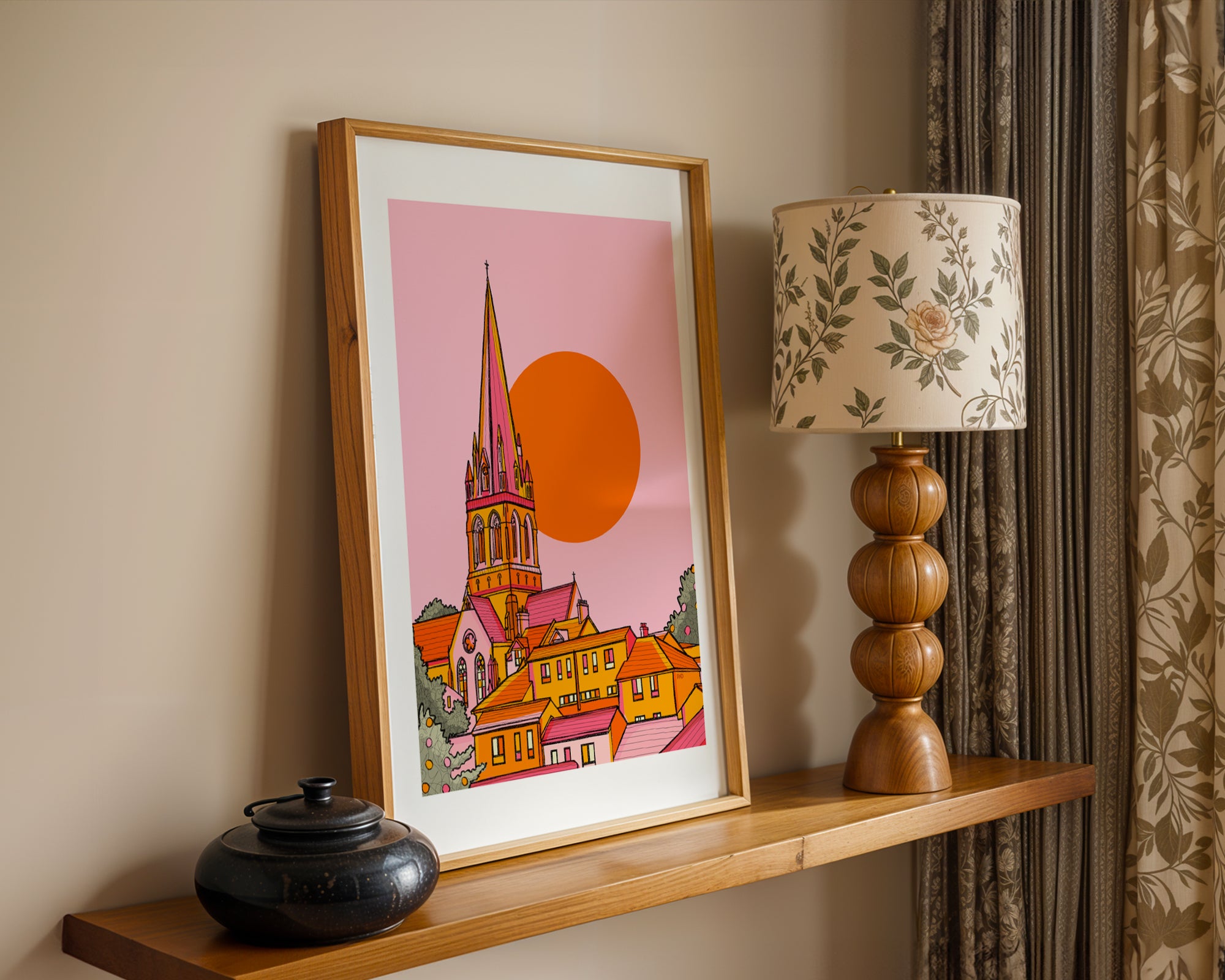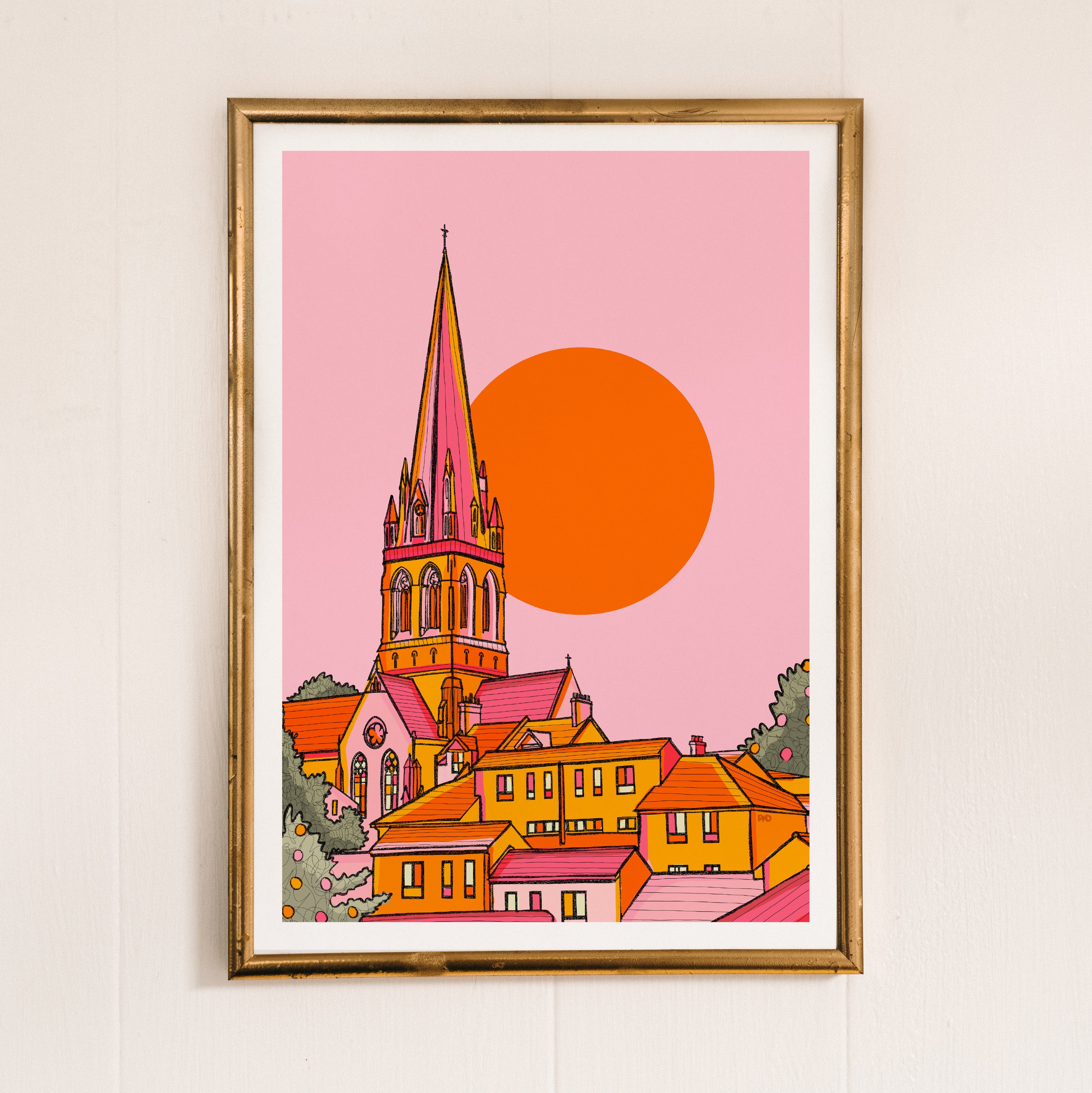 A vibrant art print of Exeter Cathedral, illustrated in bright pinks, yellows, and oranges.