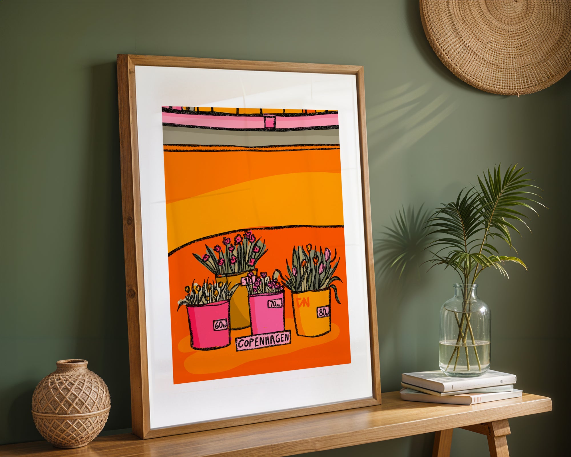 This botanical illustration shows buckets of flowers for sale in Copenhagen. Ideal for bedrooms, creative studios, nurseries, or gallery walls, this piece adds warmth, colour, and beauty to any interior.