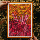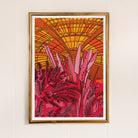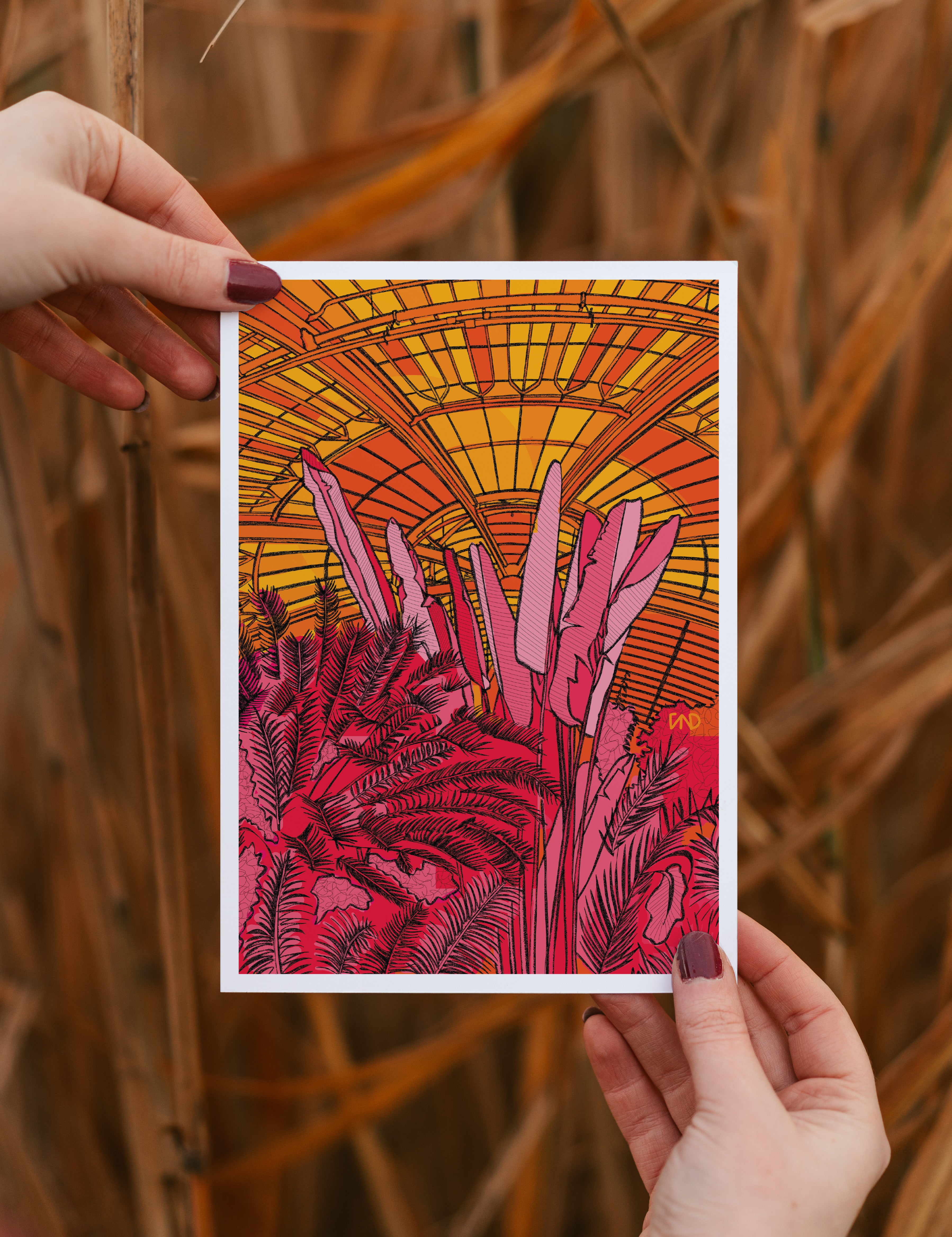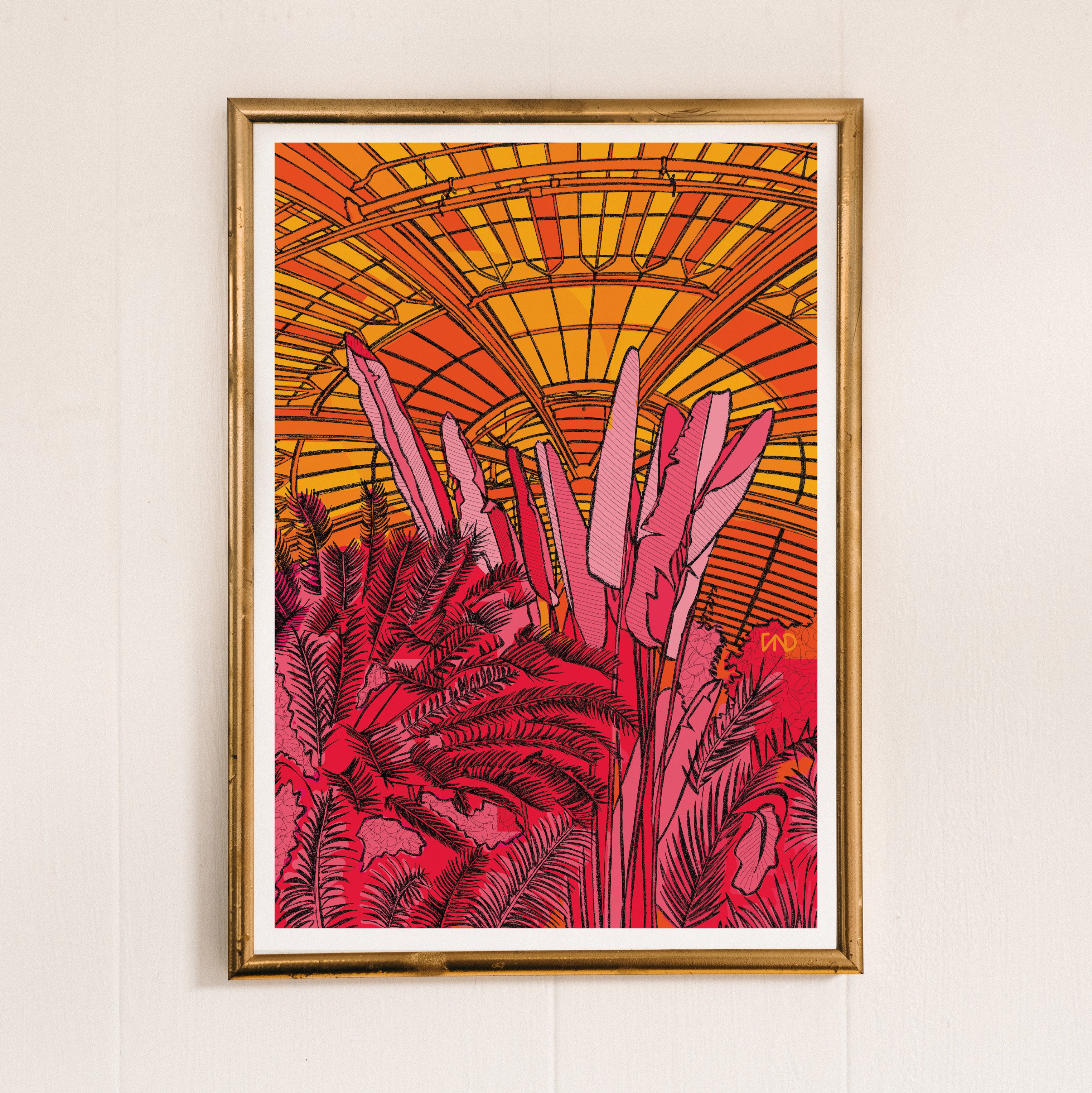 A vibrant art print of the palm house at Kew gardens illustrated in bright pinks and oranges.