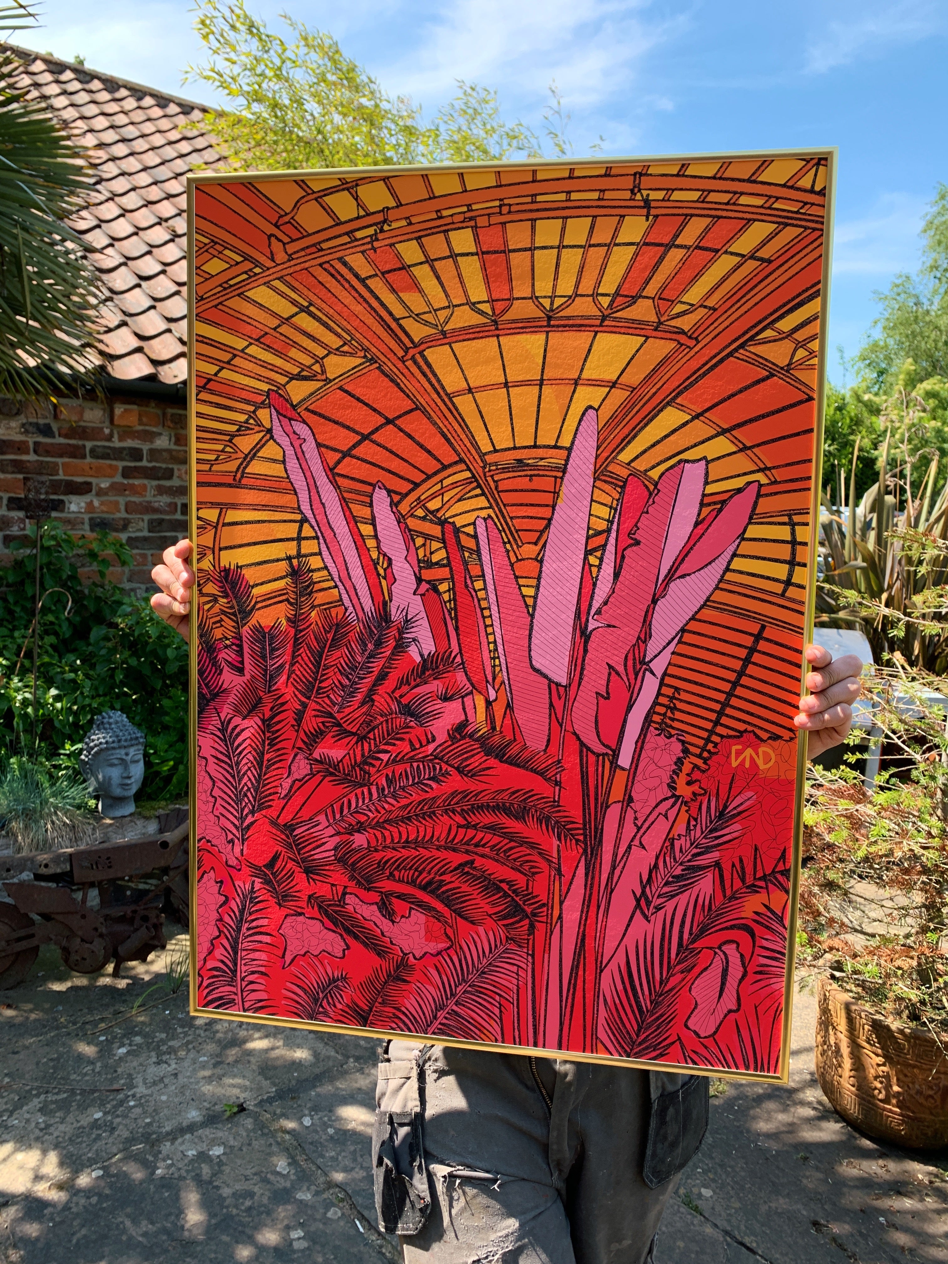 This piece was hand-drawn on my drawing tablet, inspired by many trips to Kew the palm house is one of my favourite parts with the contrast of the green plants against the victorian greenhouse structure.