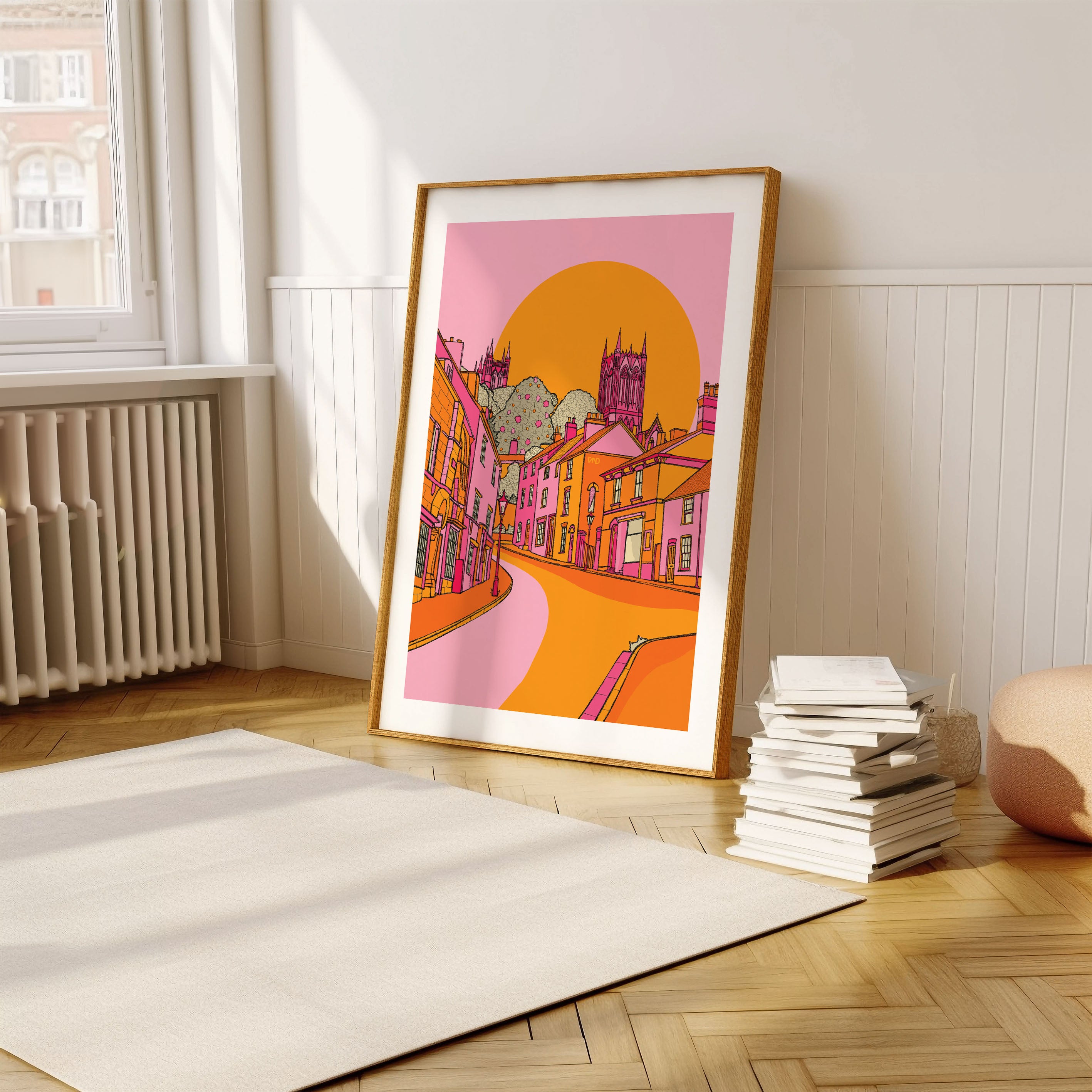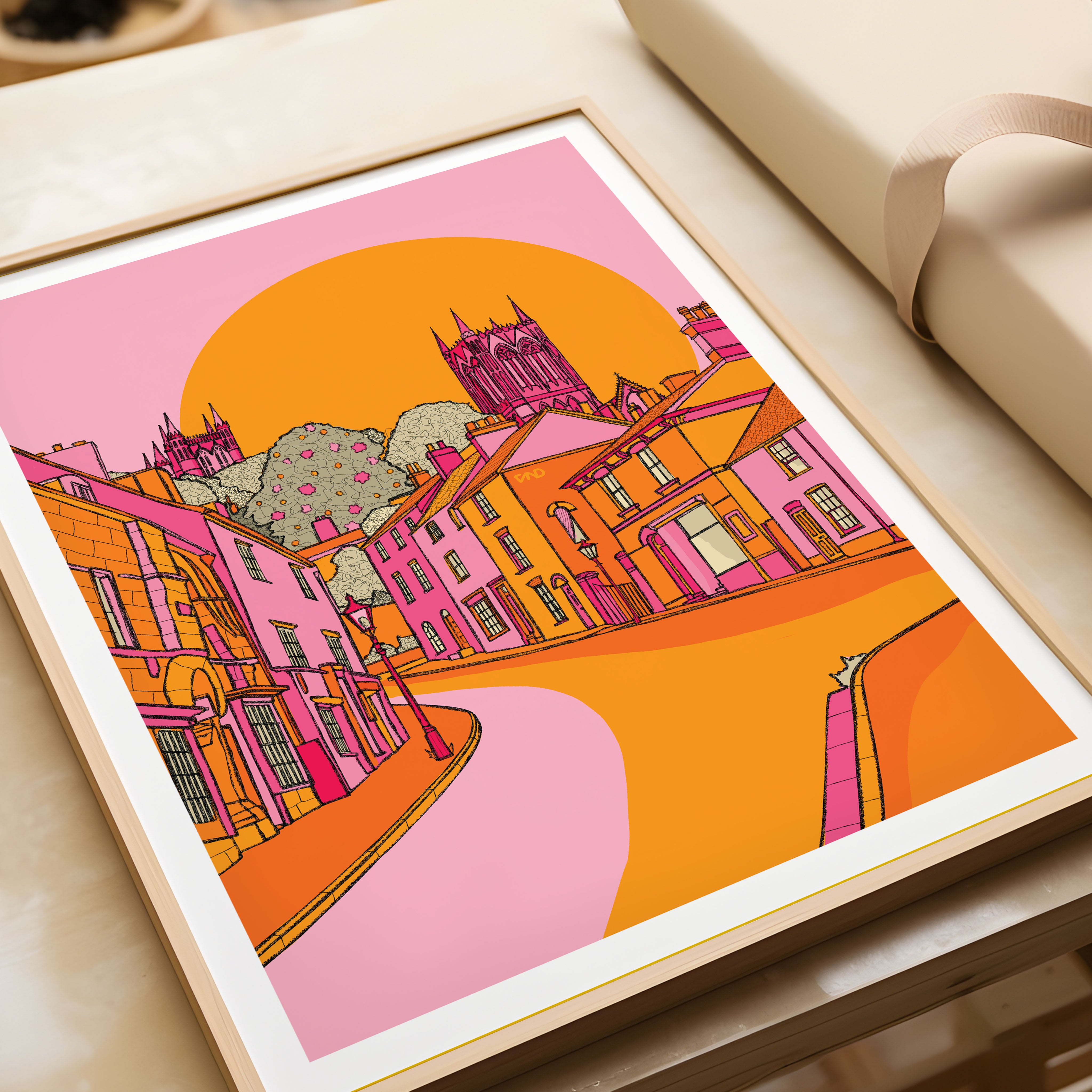 A vibrant art print of Lincoln highstreet, featuring Lincoln cathedral, illustrated in bright pinks, greens, and oranges.