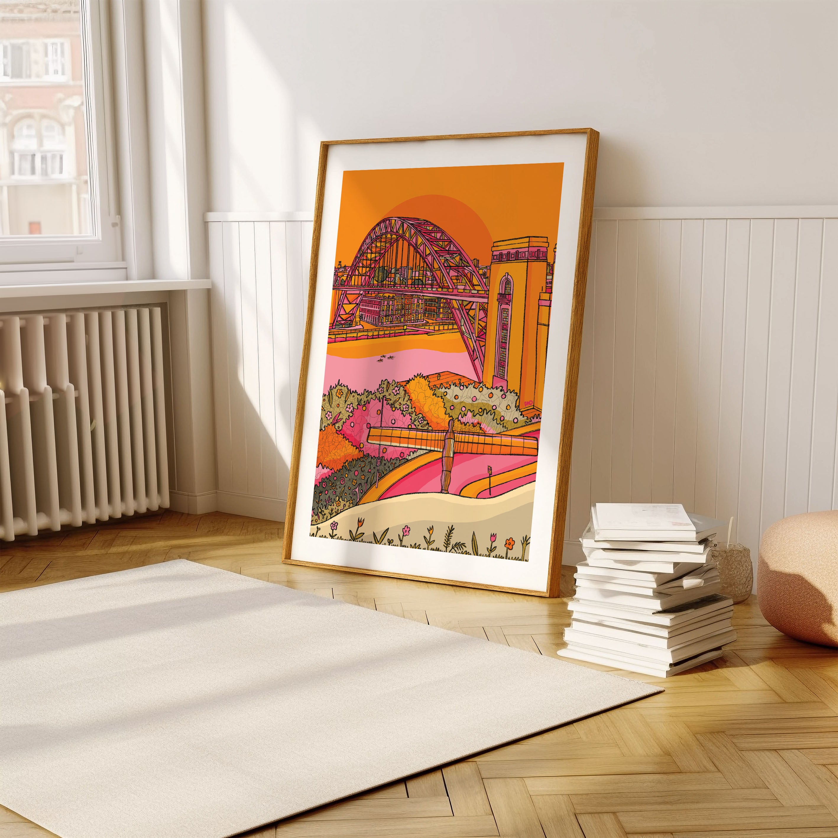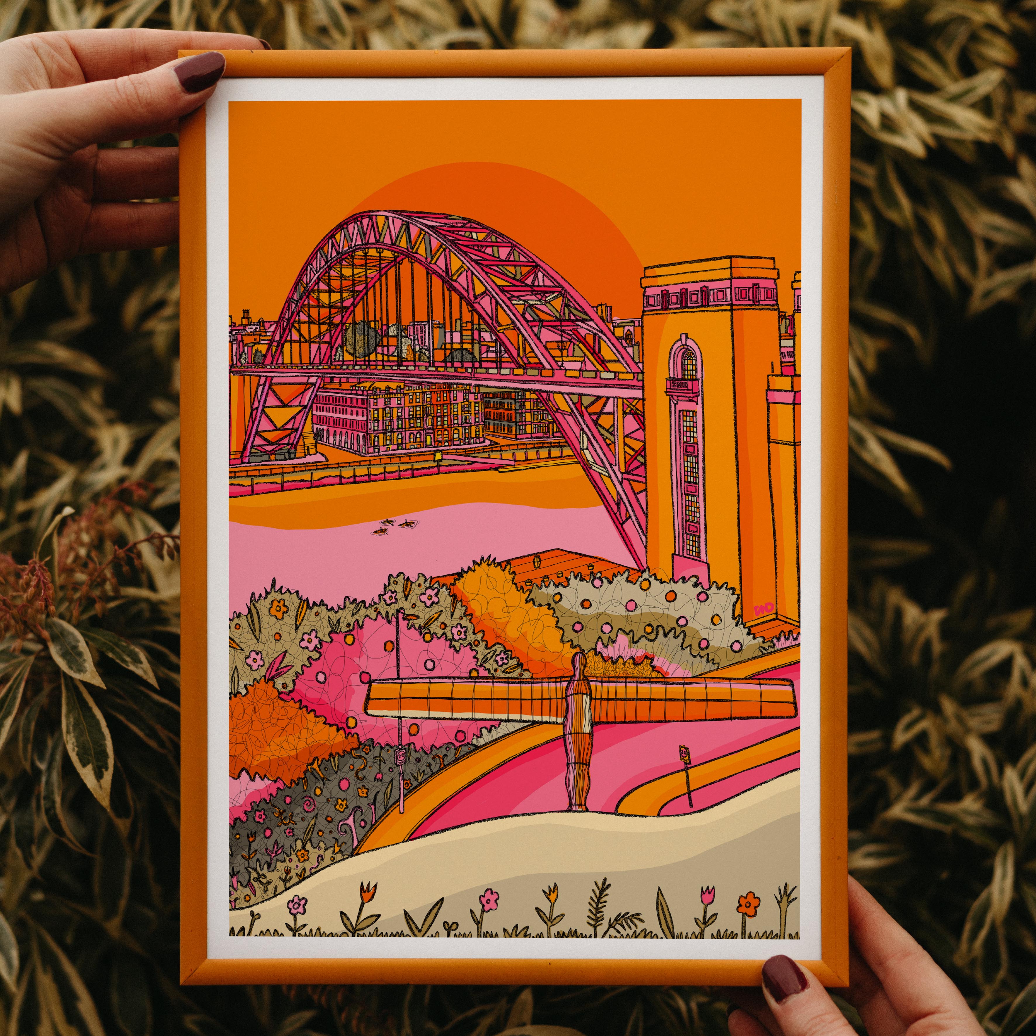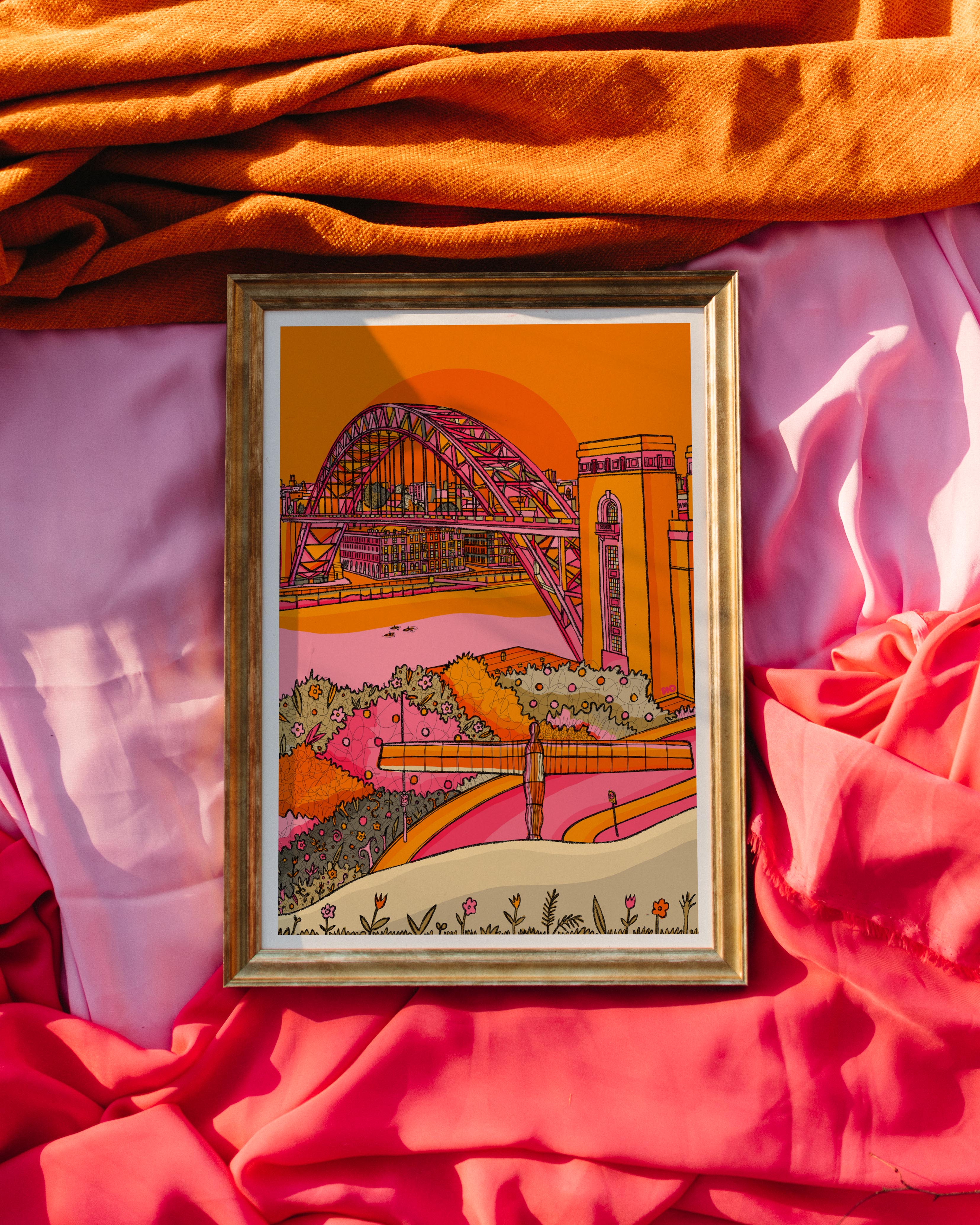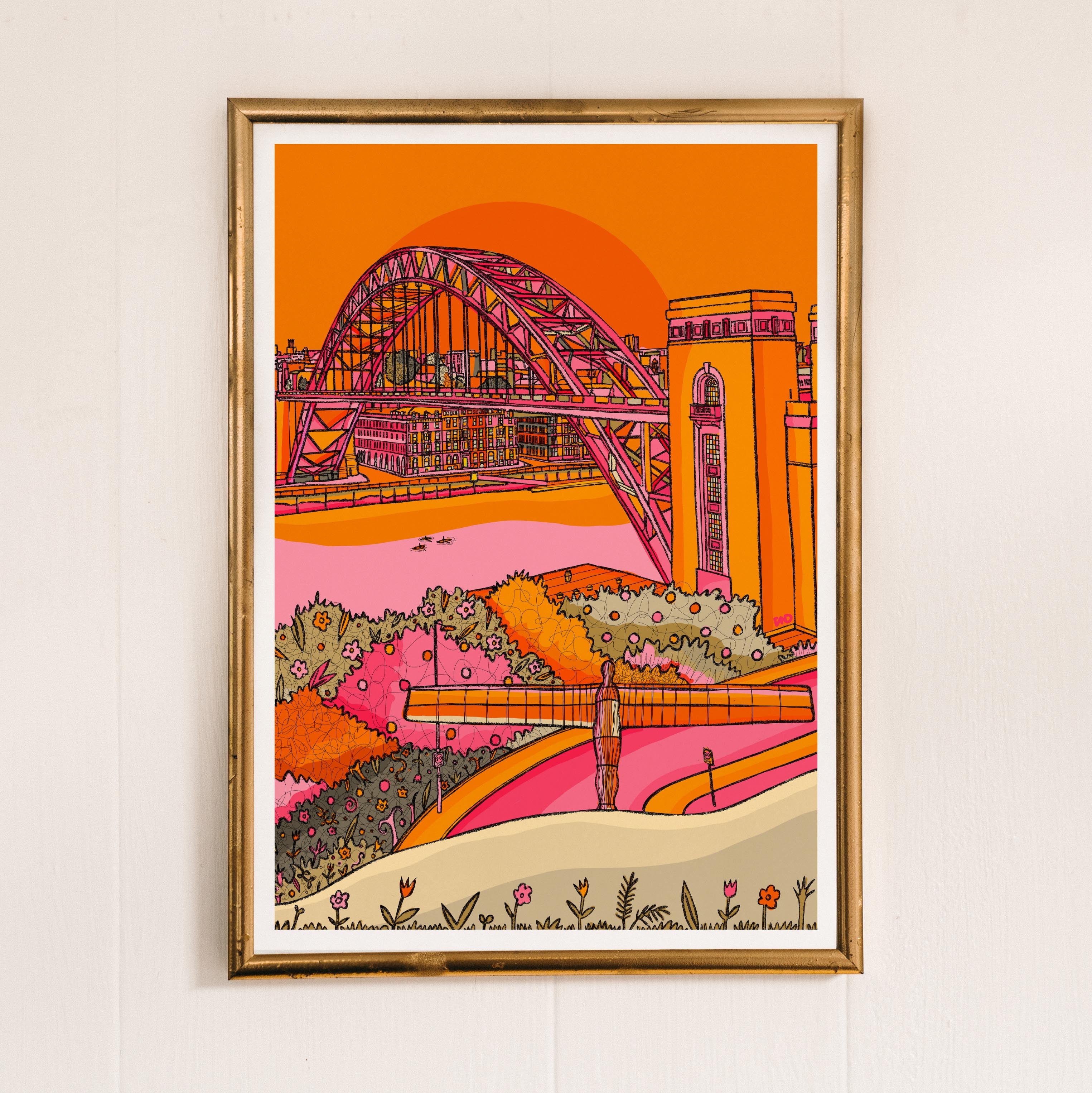A vibrant art print of Newcastle including the Tyne bridge and angel of the north illustrated in bright pinks, yellows, greens, and oranges.