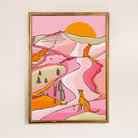 A vibrant art print of a whippet with her cocktail overlooking a snowy wonderland scene illustrated in creamy pastel pinks, greens, and vibrant orange.