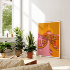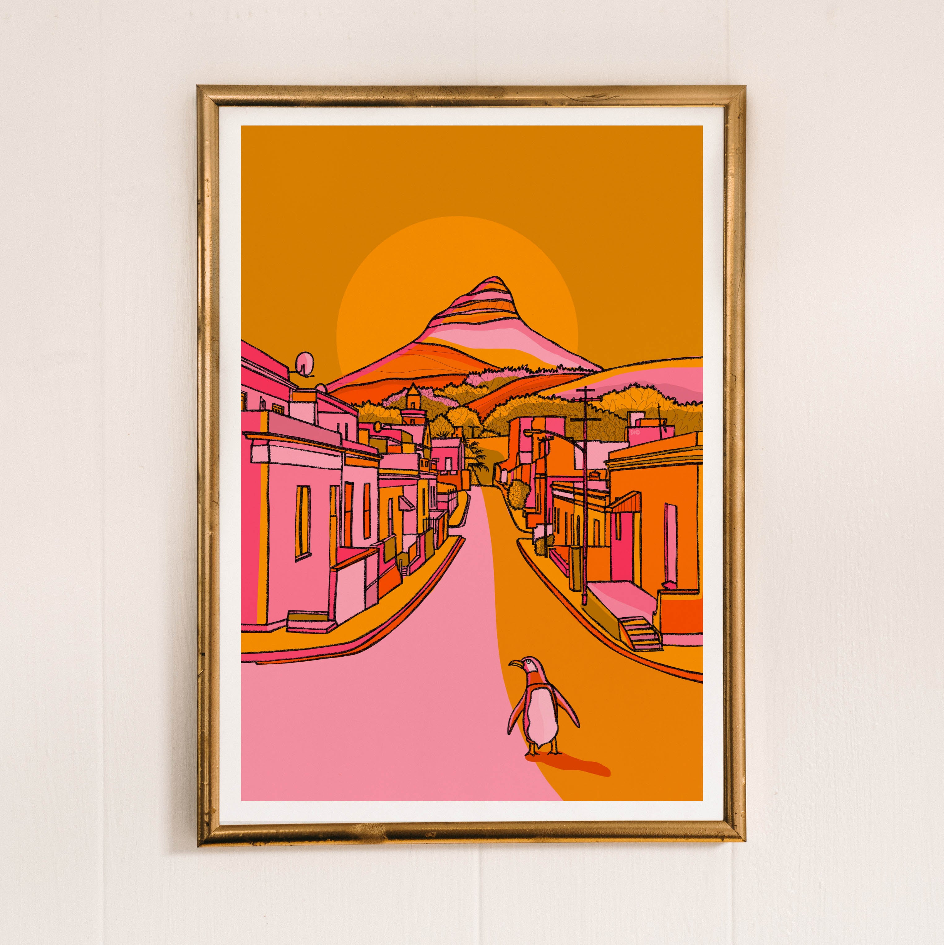 A vibrant art print of Cape Town, South Africa illustrated in bright pinks and oranges.