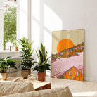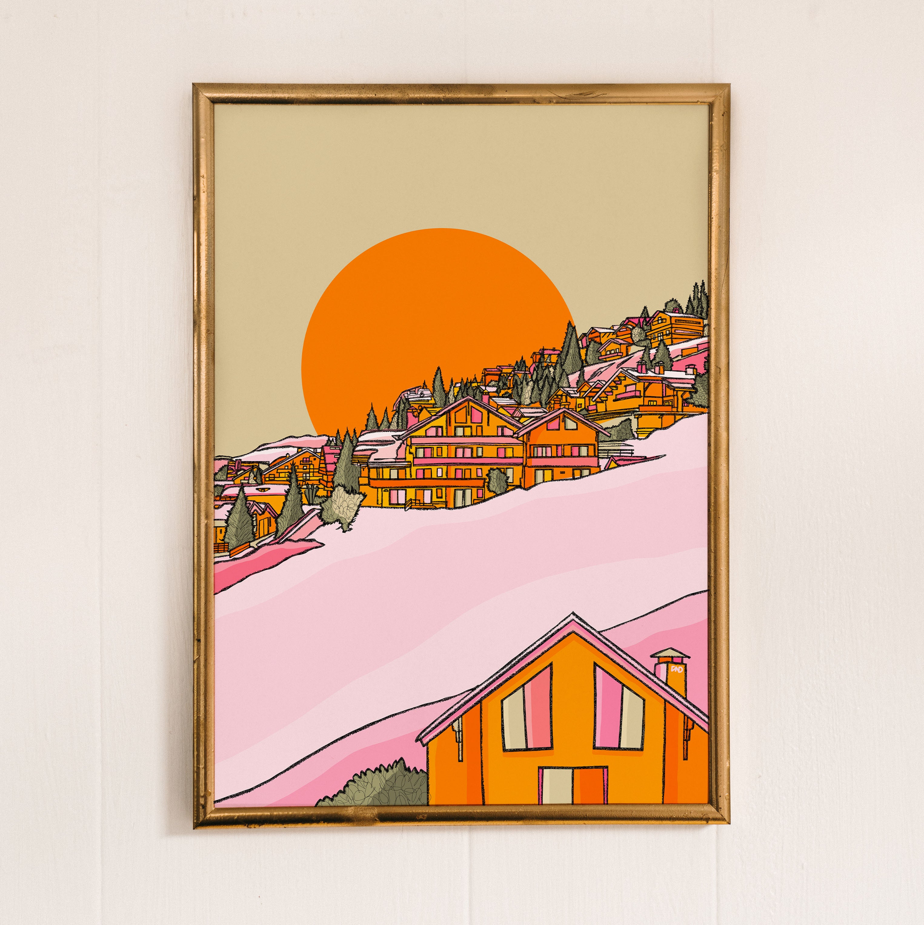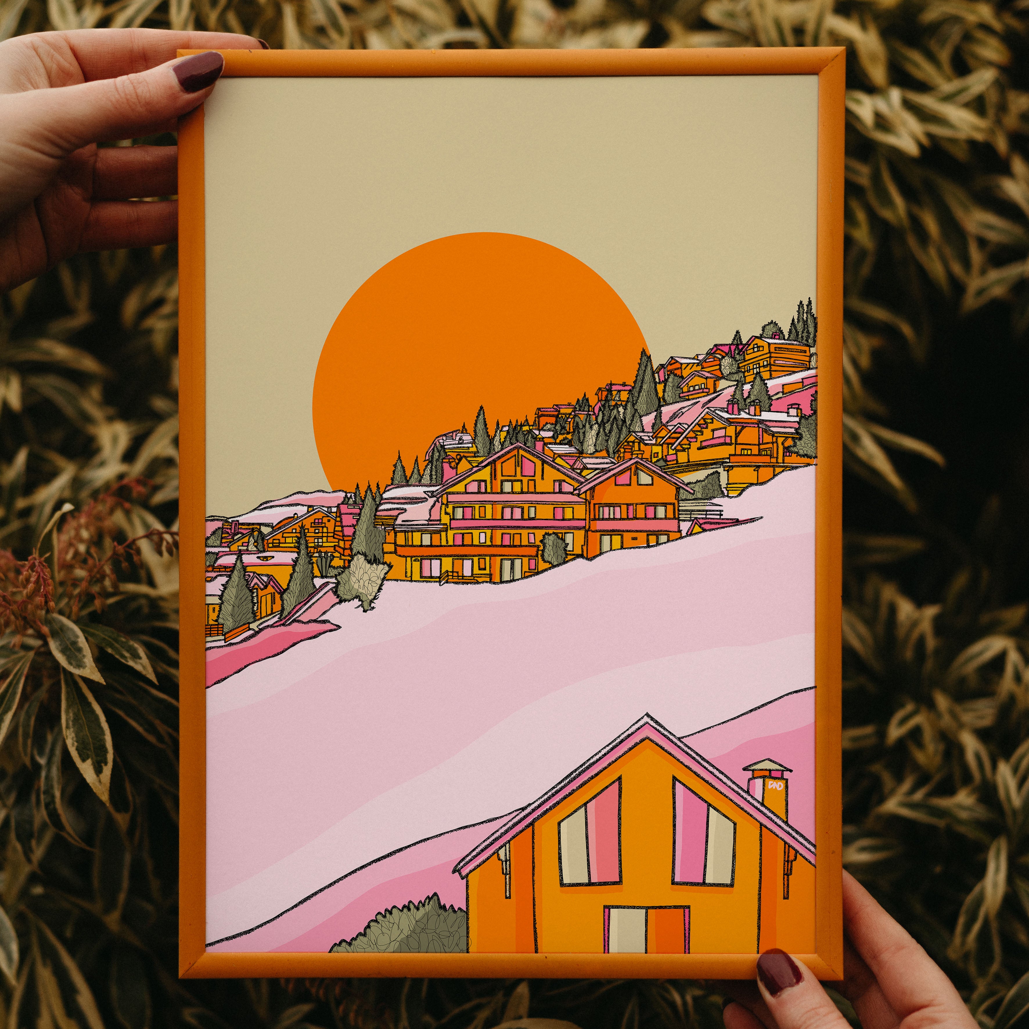 A vibrant art print of Meribel. Illustrated in creamy pastel pinks, greens, and vibrant orange.