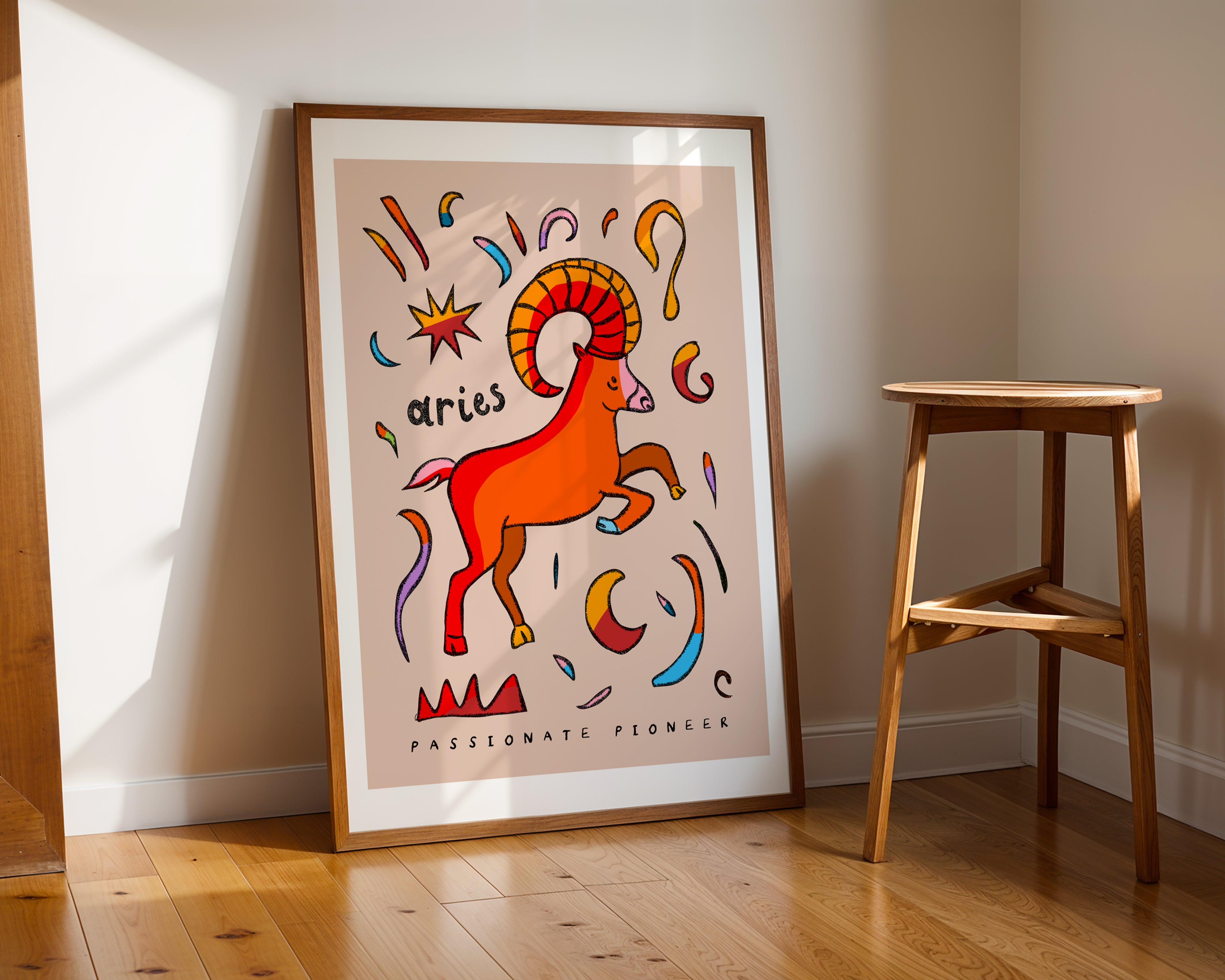 Aries zodiac wall art print featuring a bold hand-drawn astrology illustration inspired by the fire sign, pioneering, and Aries energy.