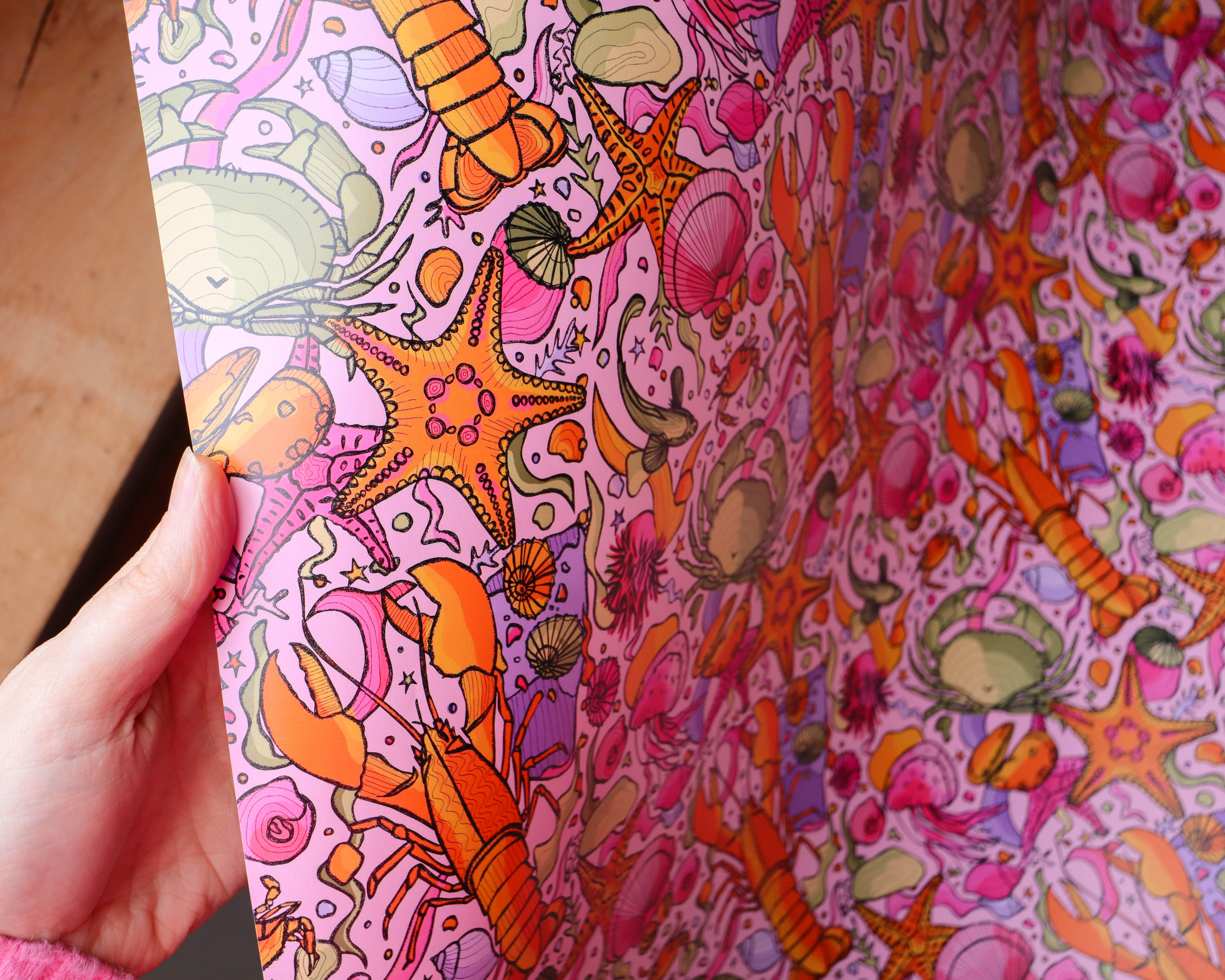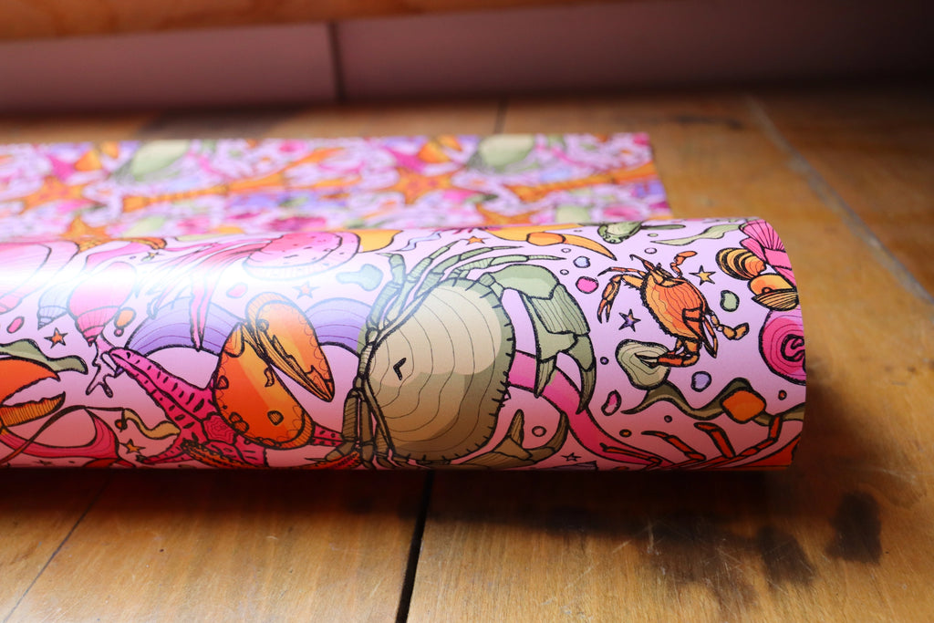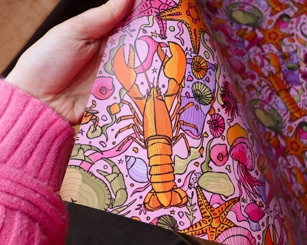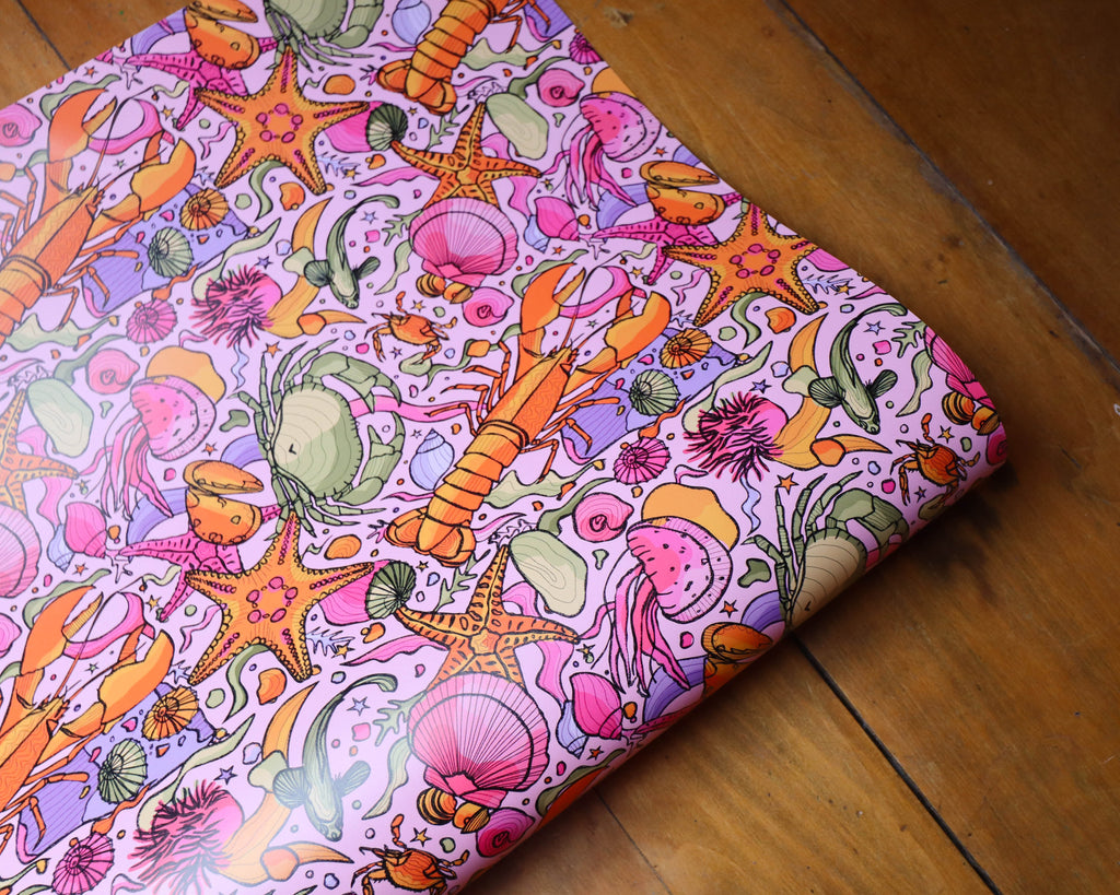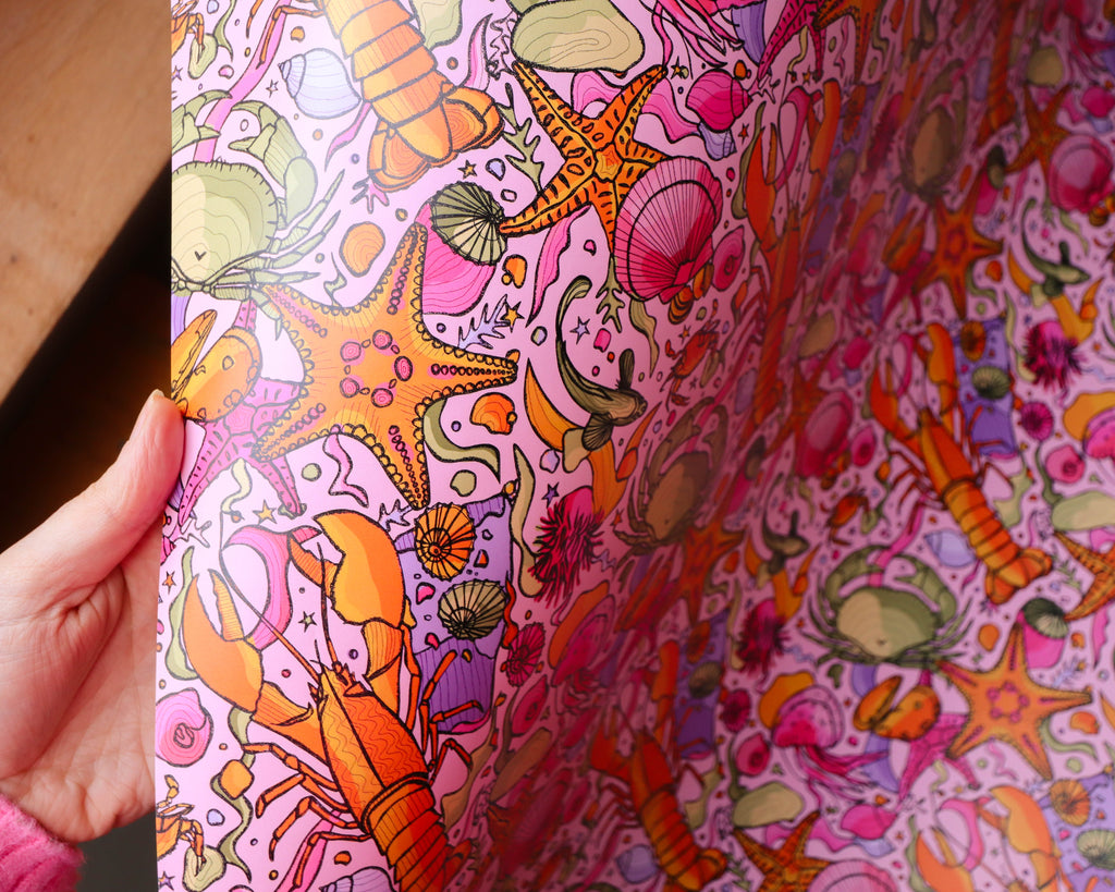 This colourful wrapping paper features my original pattern of a rockpool full of crabs, lobsters, jellyfish, mussels, limpets, starfish, seaweed, and fish. Illustrated in pink, orange, green, yellow, and purple.