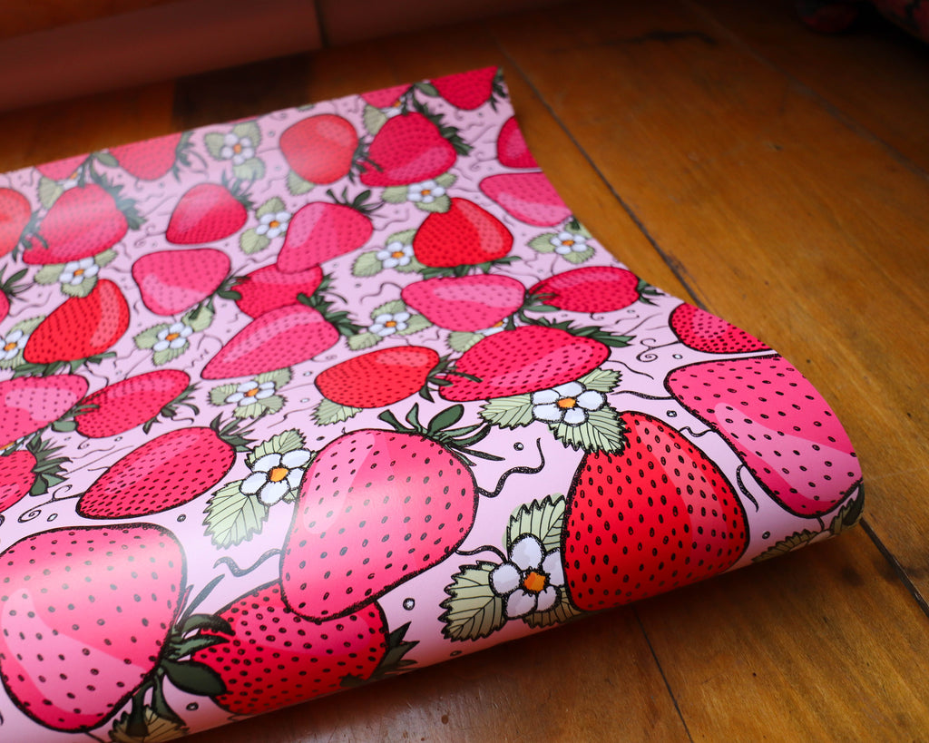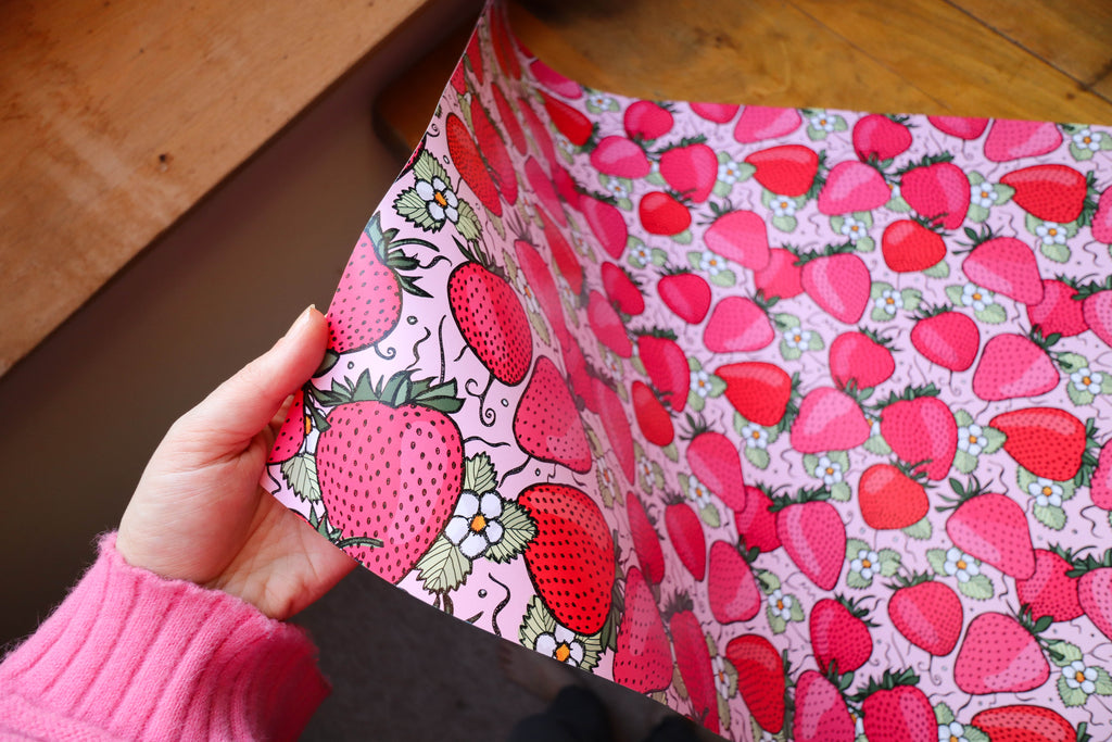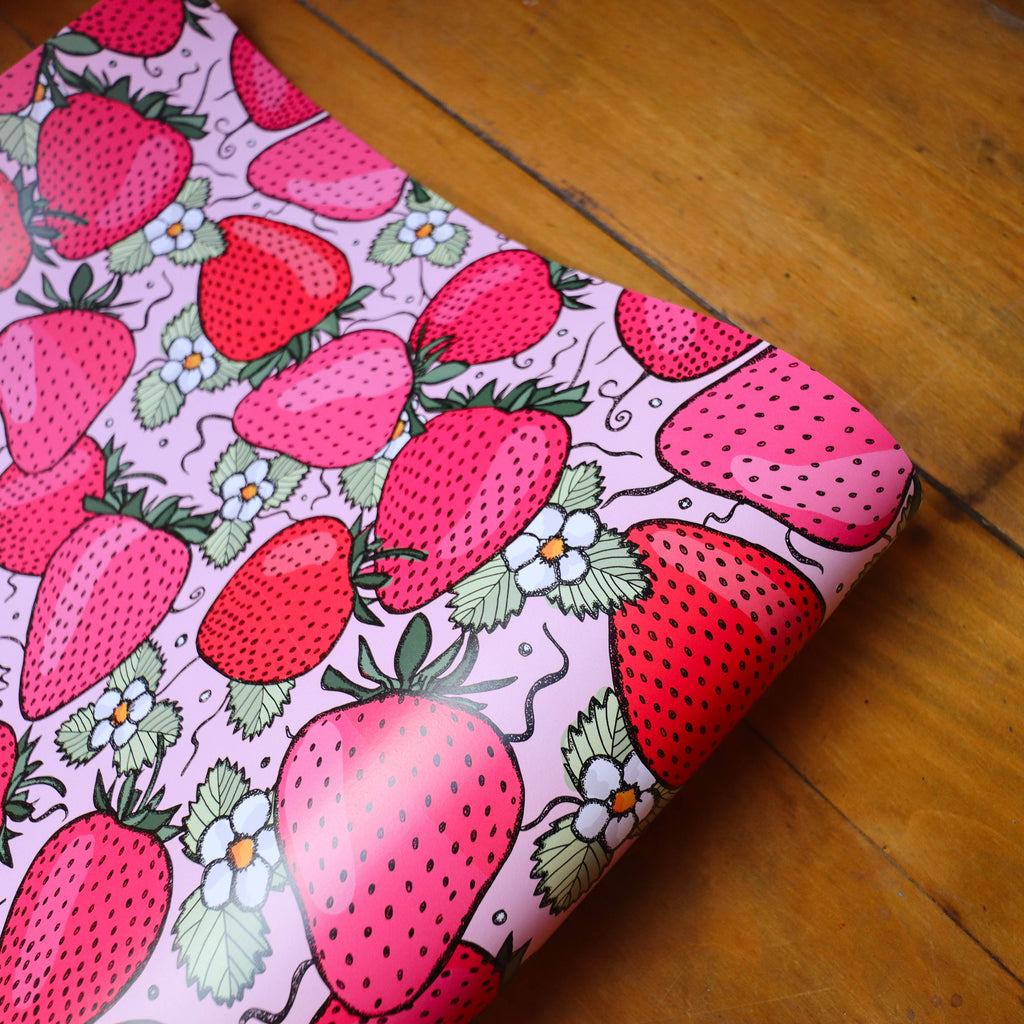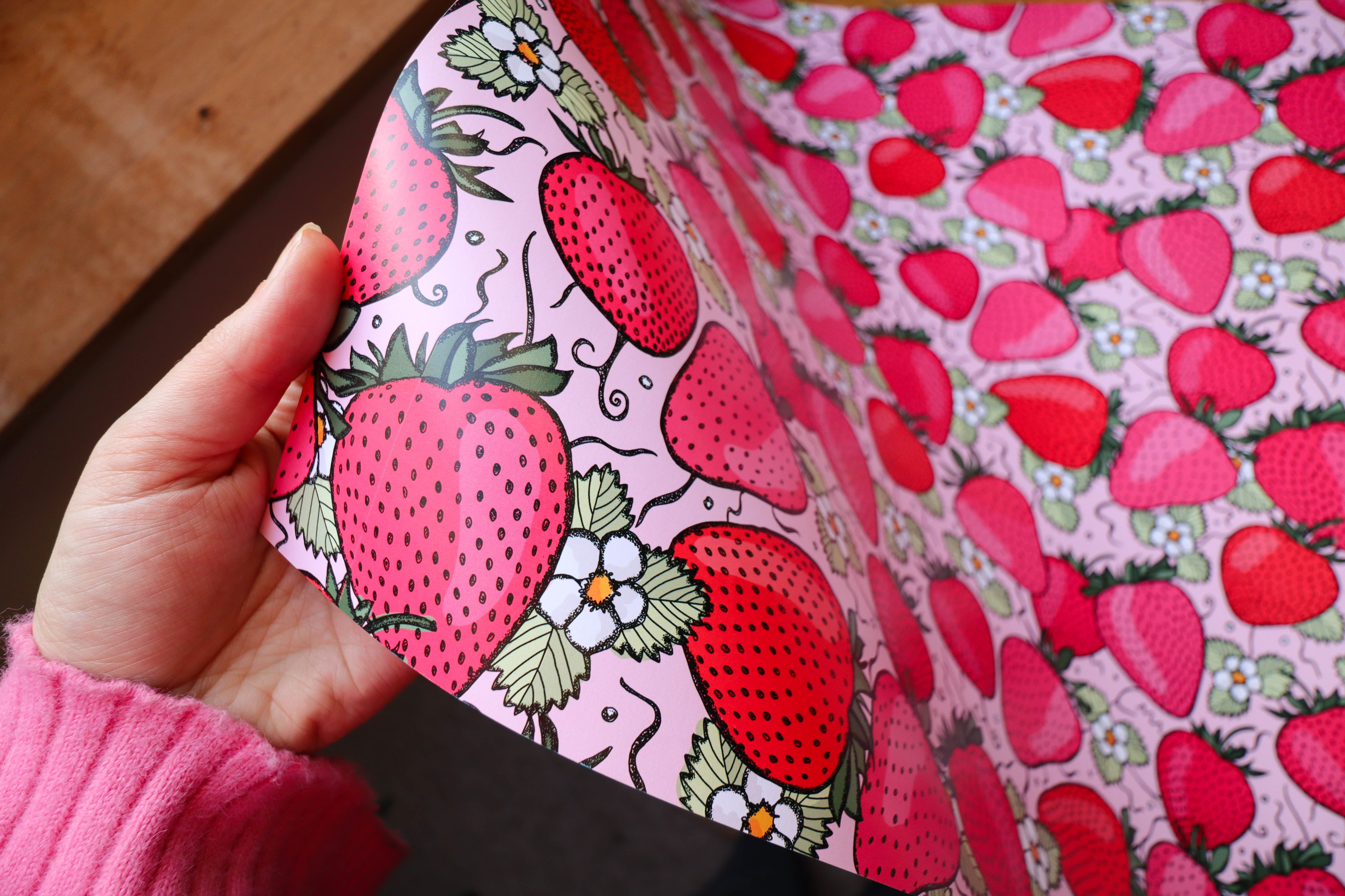 This colourful wrapping paper features my original pattern of a bunch of strawberries illustrated in pink, white, and green.